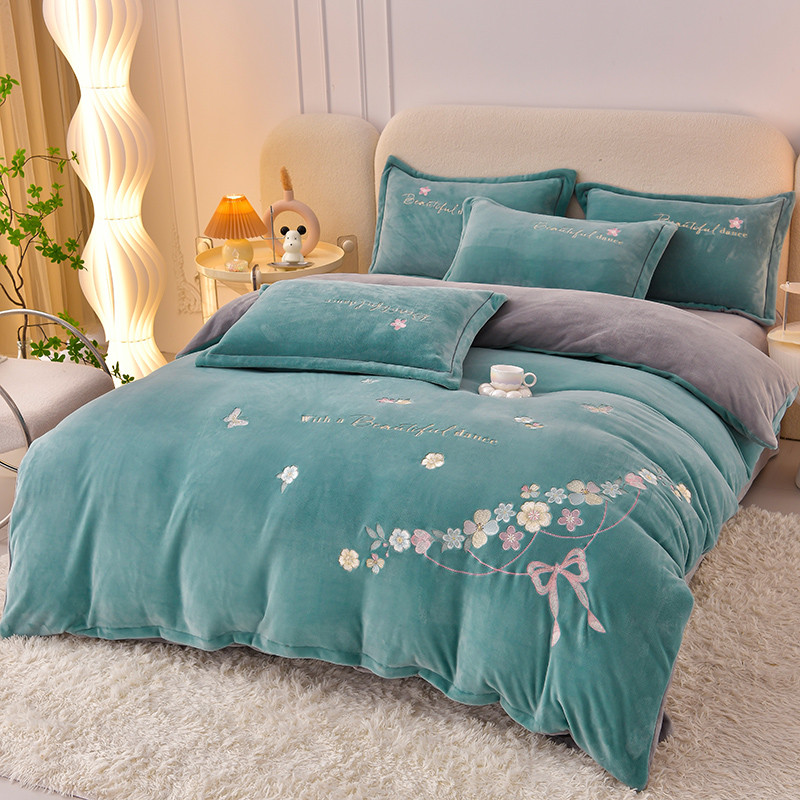 商品名称:喜梦缘家纺 2025新款花海系列牛奶绒绣花四件套 花海-湖蓝+灰