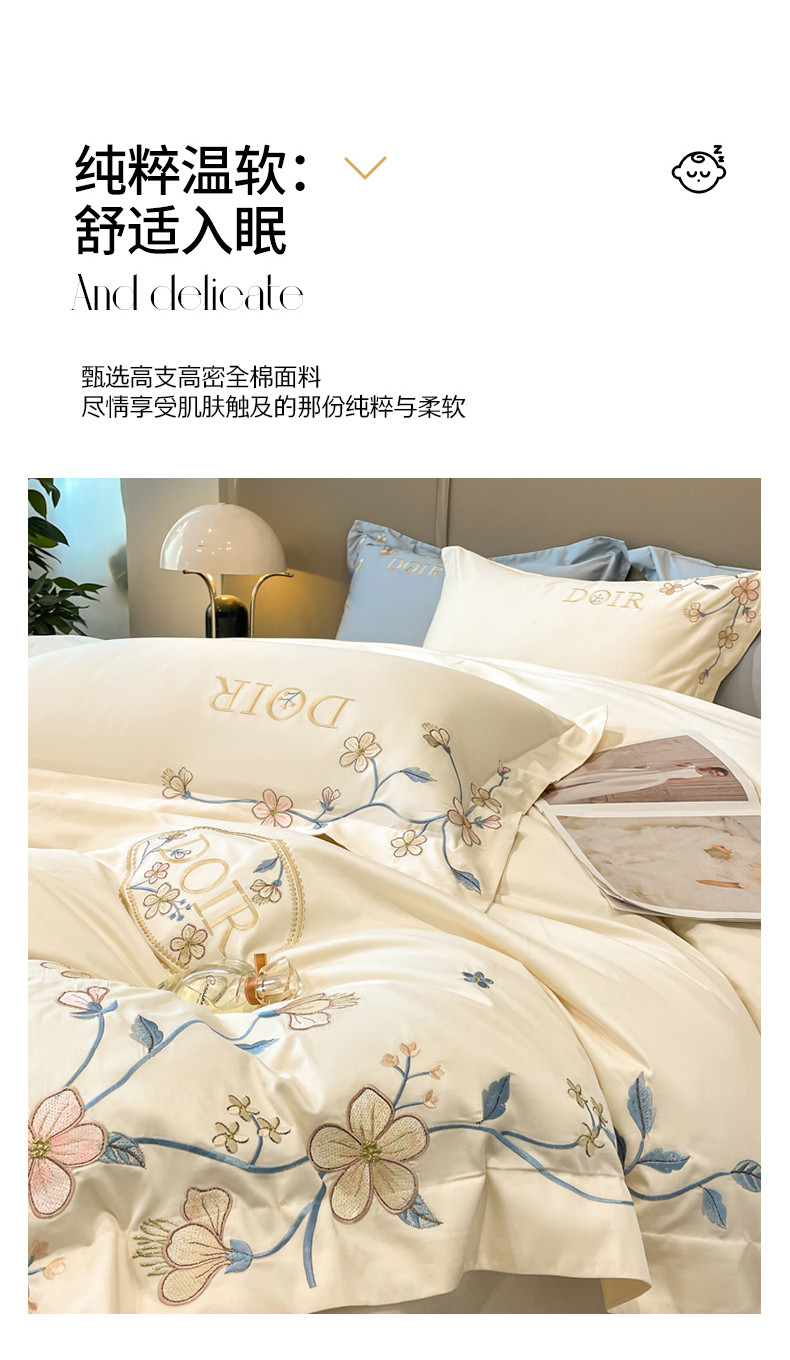 商品名称:丞音 高档礼盒2024新款长绒棉轻奢纯棉花卉刺绣四件套 香榭丽-奶昔白