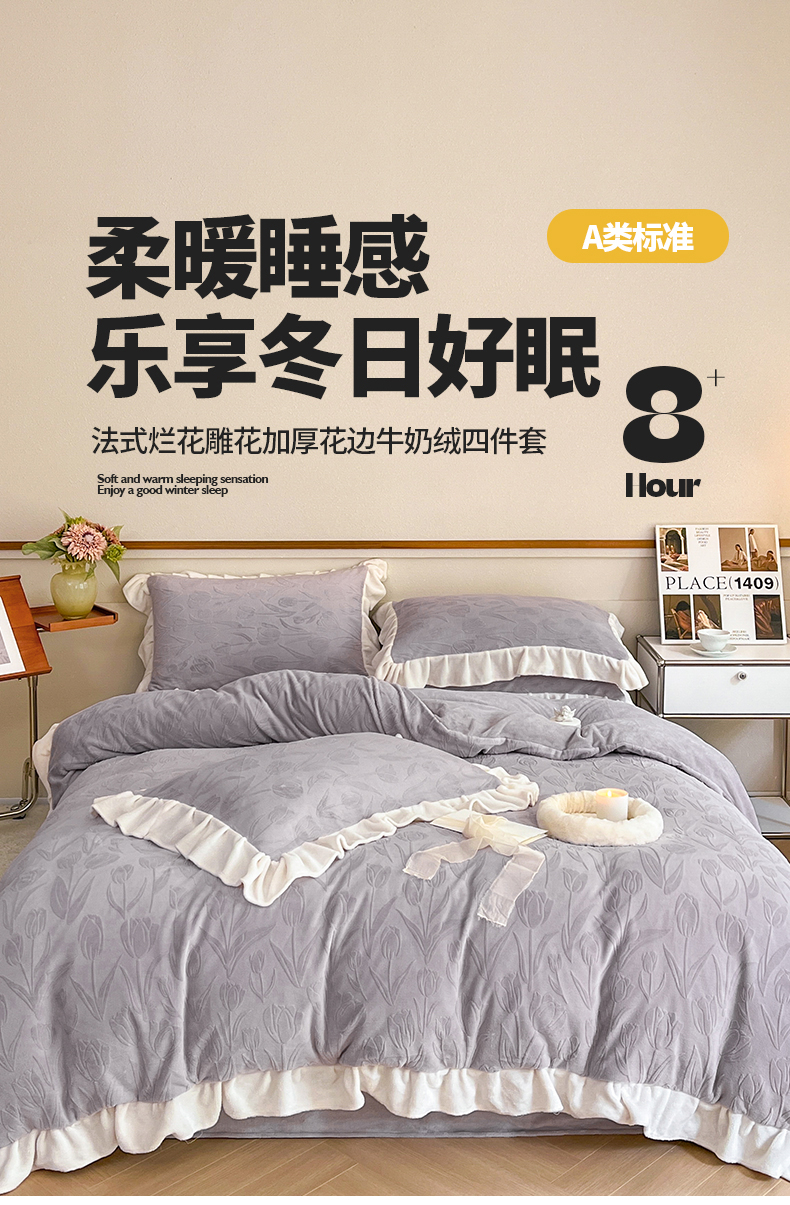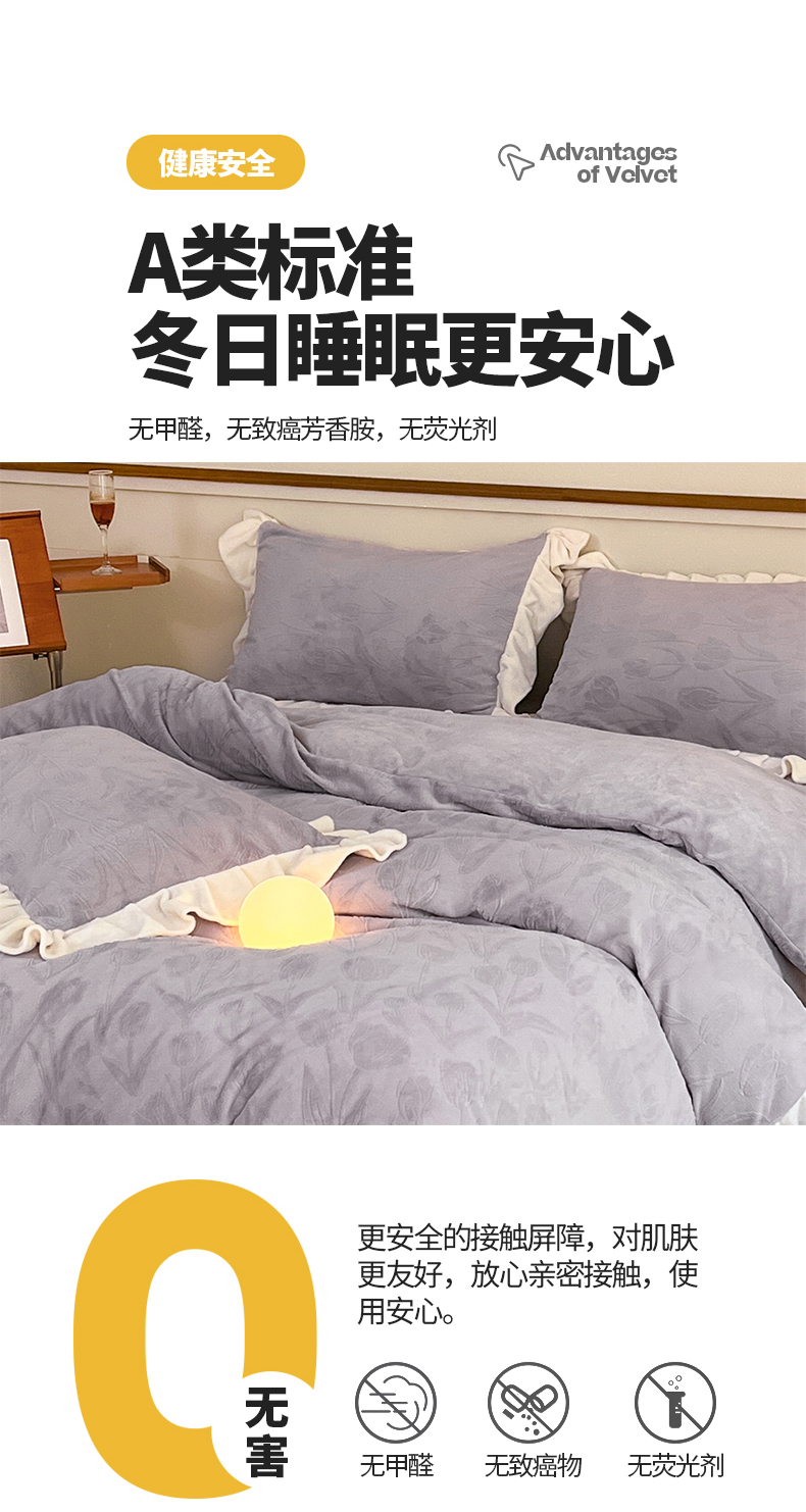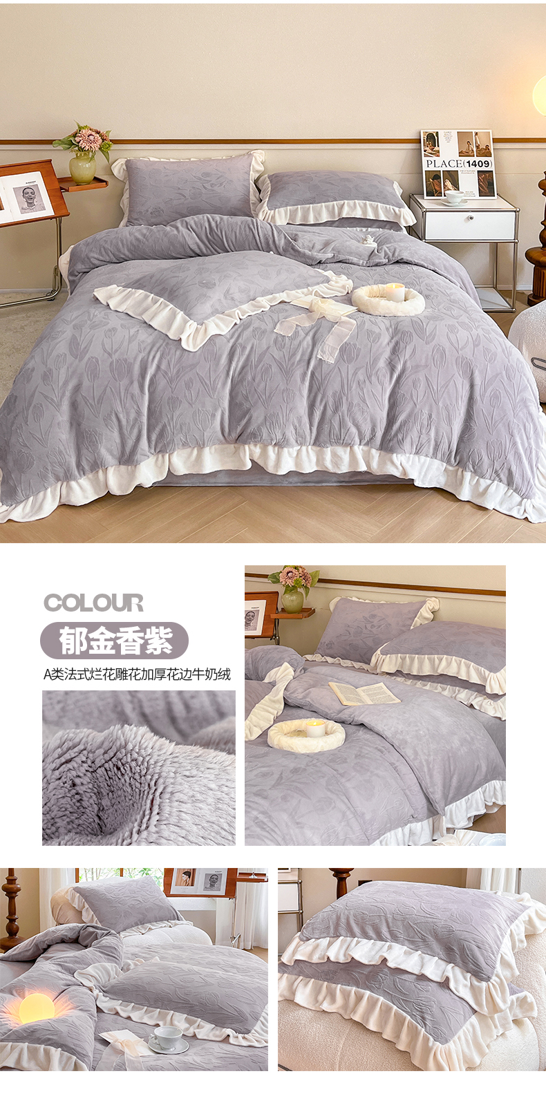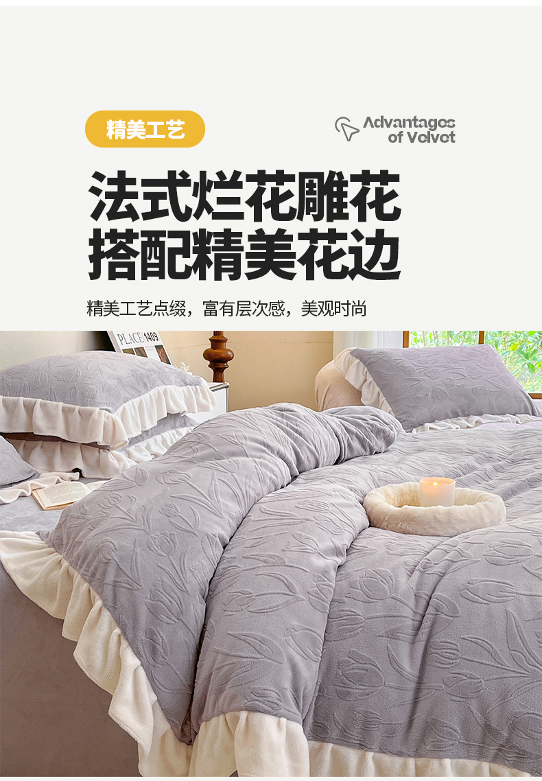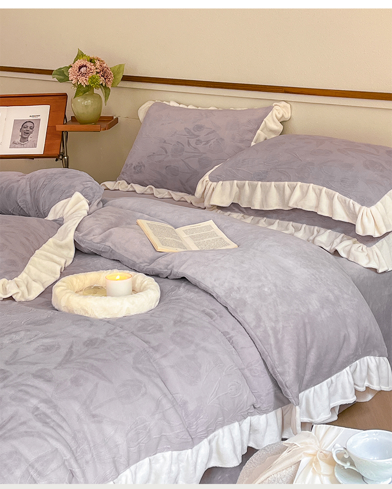 商品名称:桃子家居 2023新款A类高克重230克法式烂花雕花提花加厚韩版花边牛奶绒四件套 绒烂花-郁金香紫