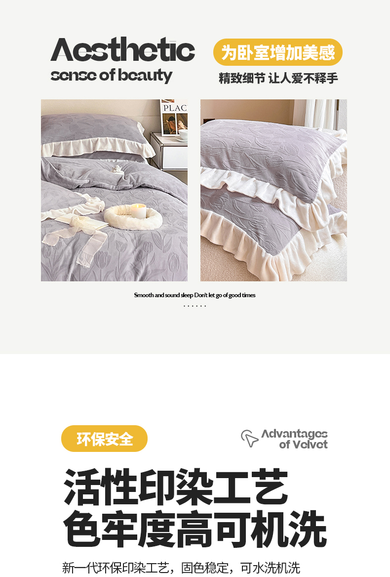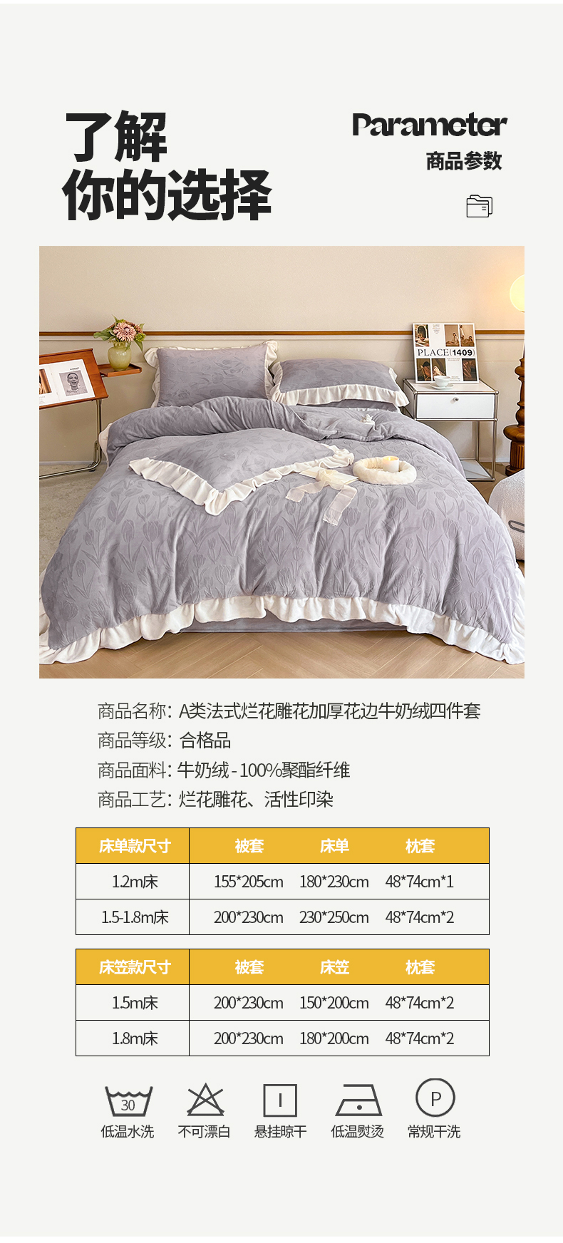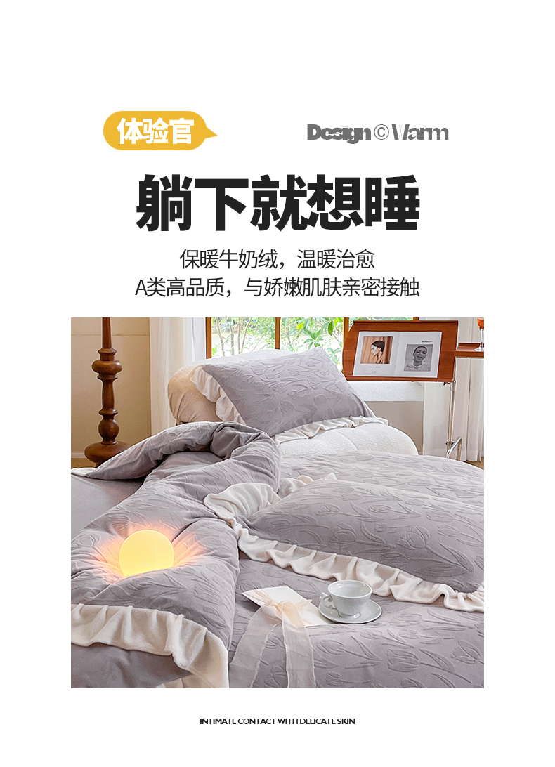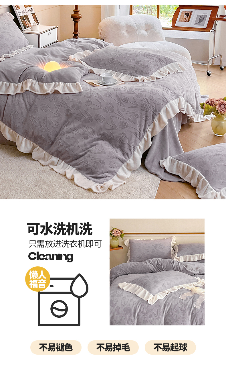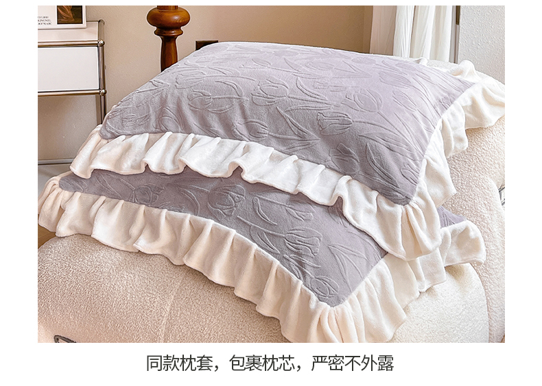 商品名称:桃子家居 2023新款A类高克重230克法式烂花雕花提花加厚韩版花边牛奶绒四件套 绒烂花-郁金香紫