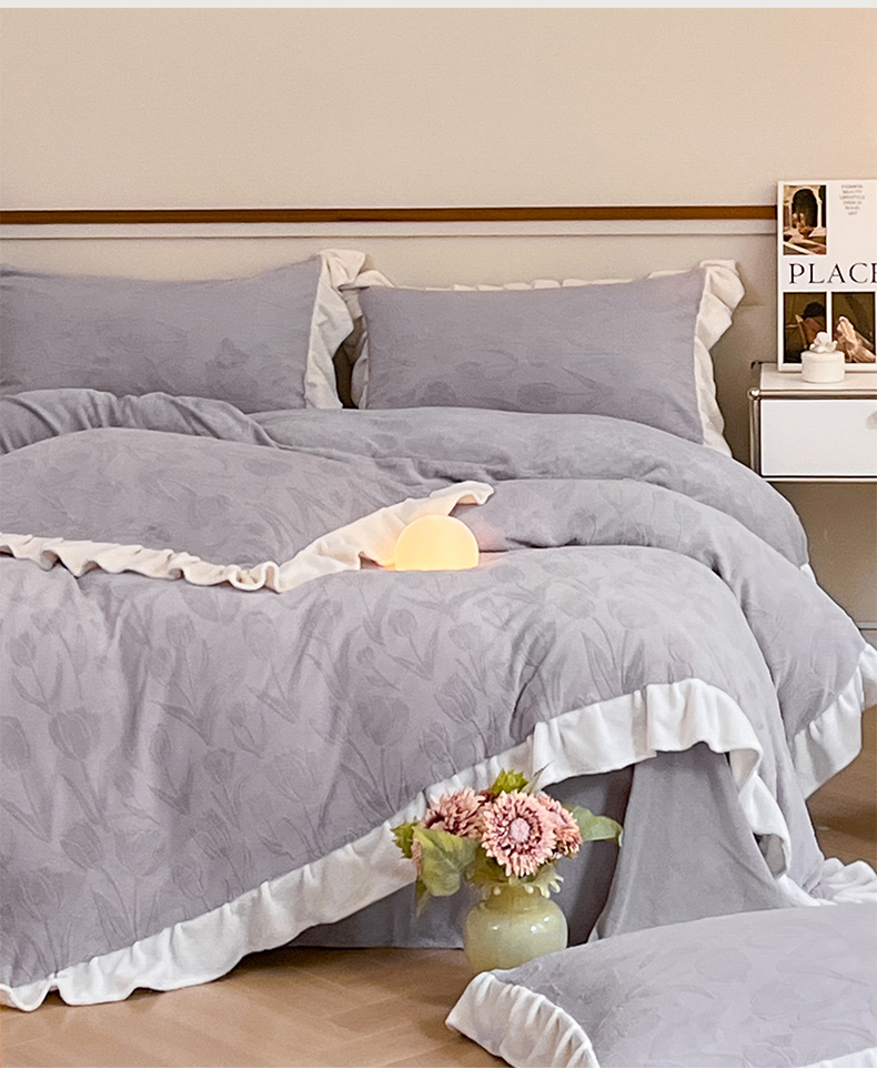 桃子家居 2023新款A类高克重230克法式烂花雕花提花加厚韩版花边牛奶绒四件套 绒烂花-郁金香紫