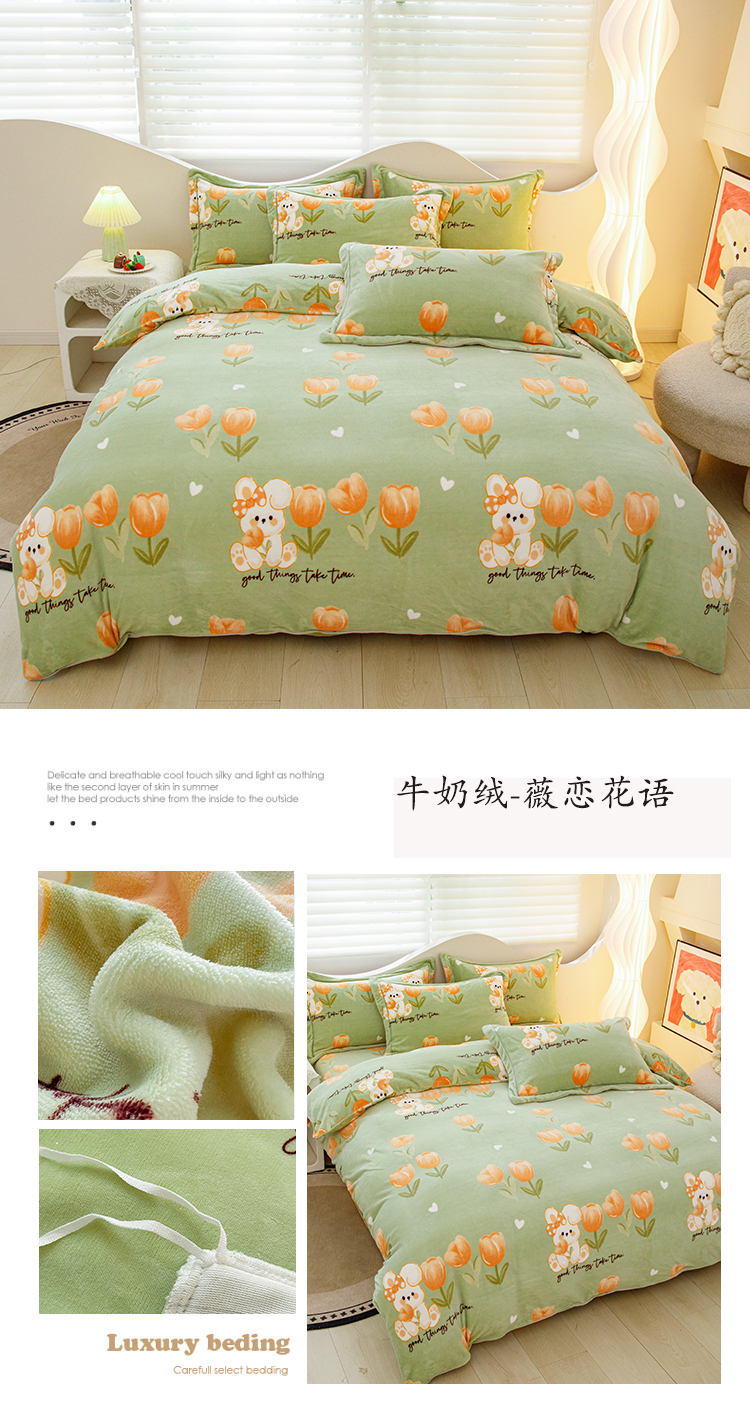 商品名称:尚品凤凰2025新款高克重印花牛奶绒四件套-工艺款兔然郁见你-果绿