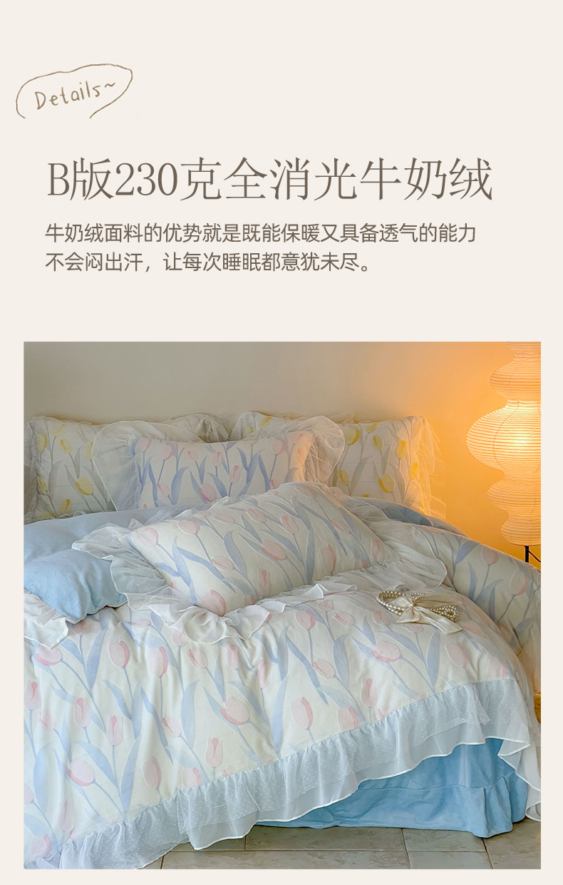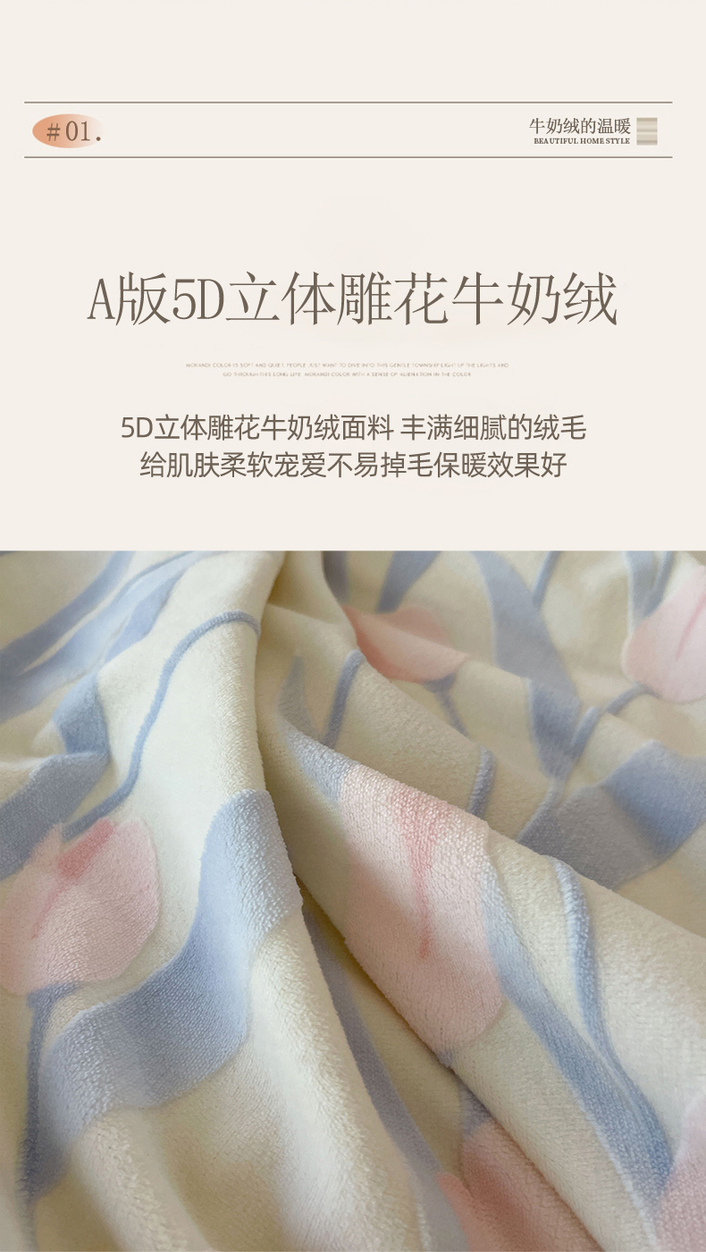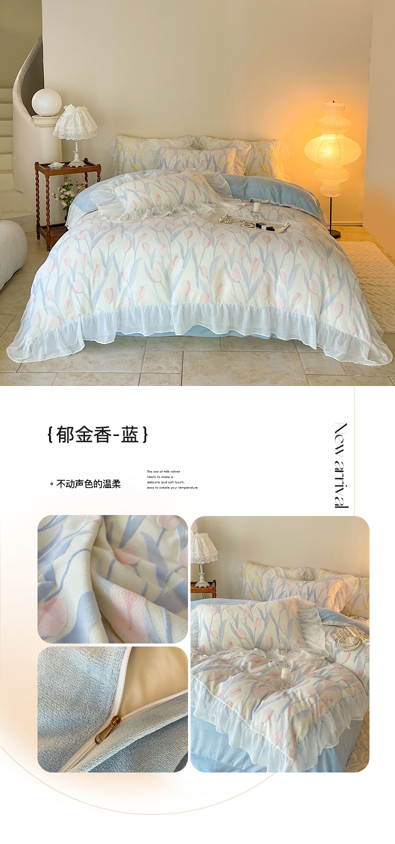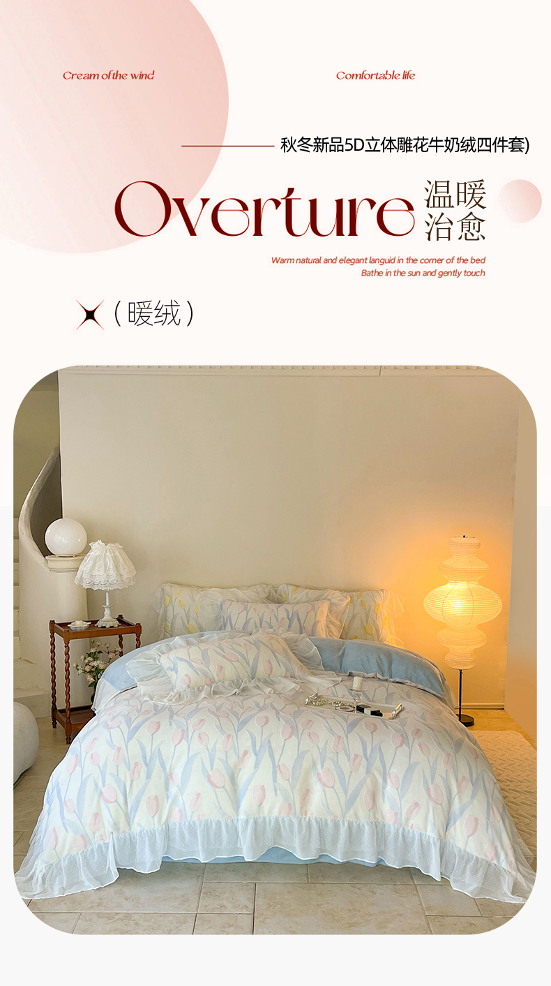 商品名称:玛奇朵2023新款秋冬新品5D立体雕花牛奶绒四件套 郁金香-蓝
