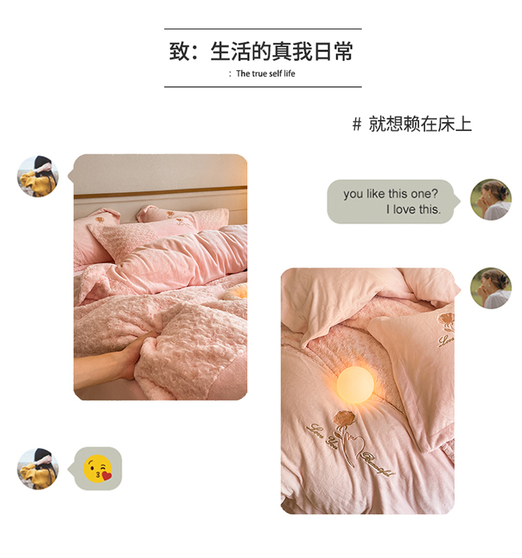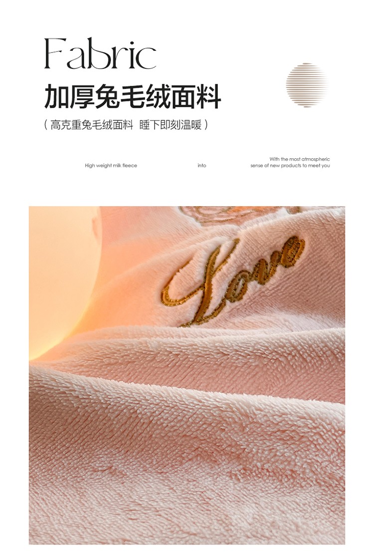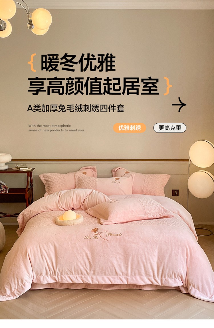 商品名称:嗯呢23新款高克重双拼兔毛绒牛奶绒保暖刺绣绒四件套 玫瑰之恋-樱花粉