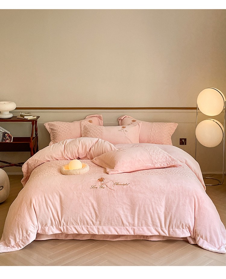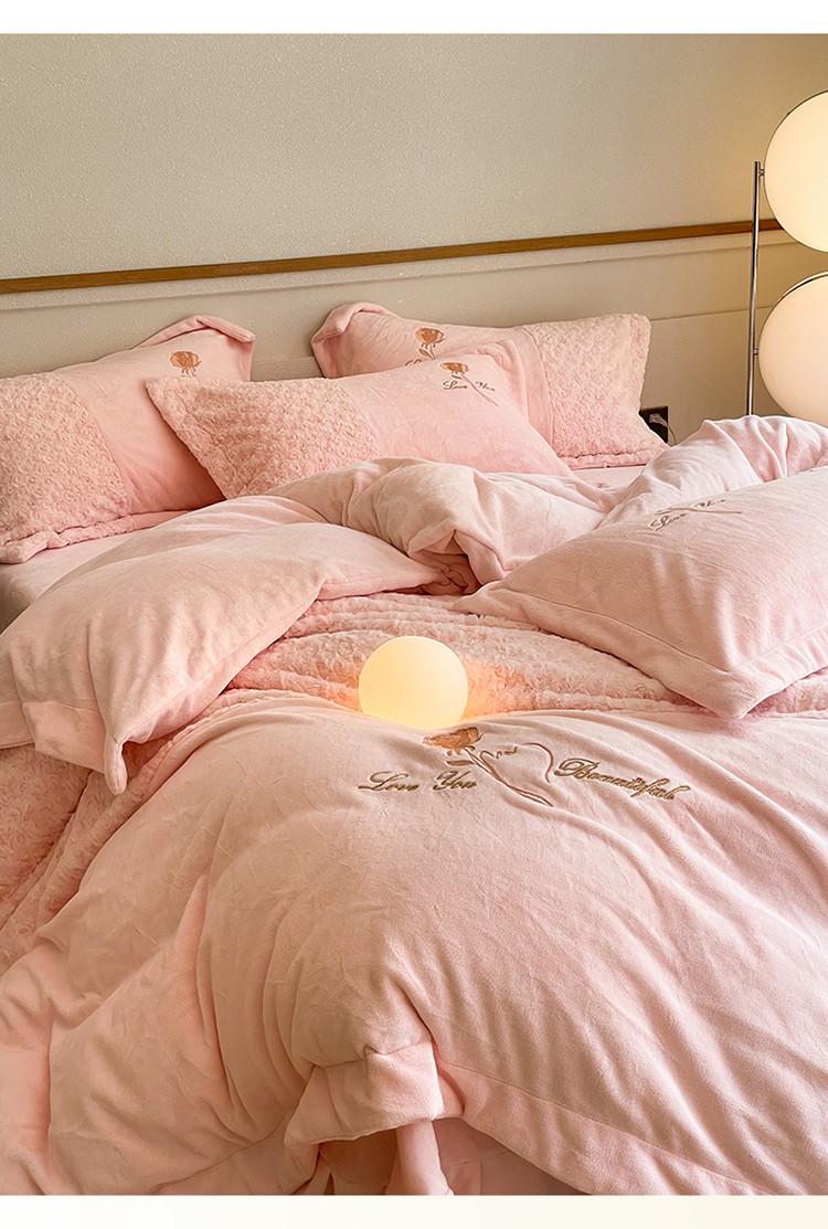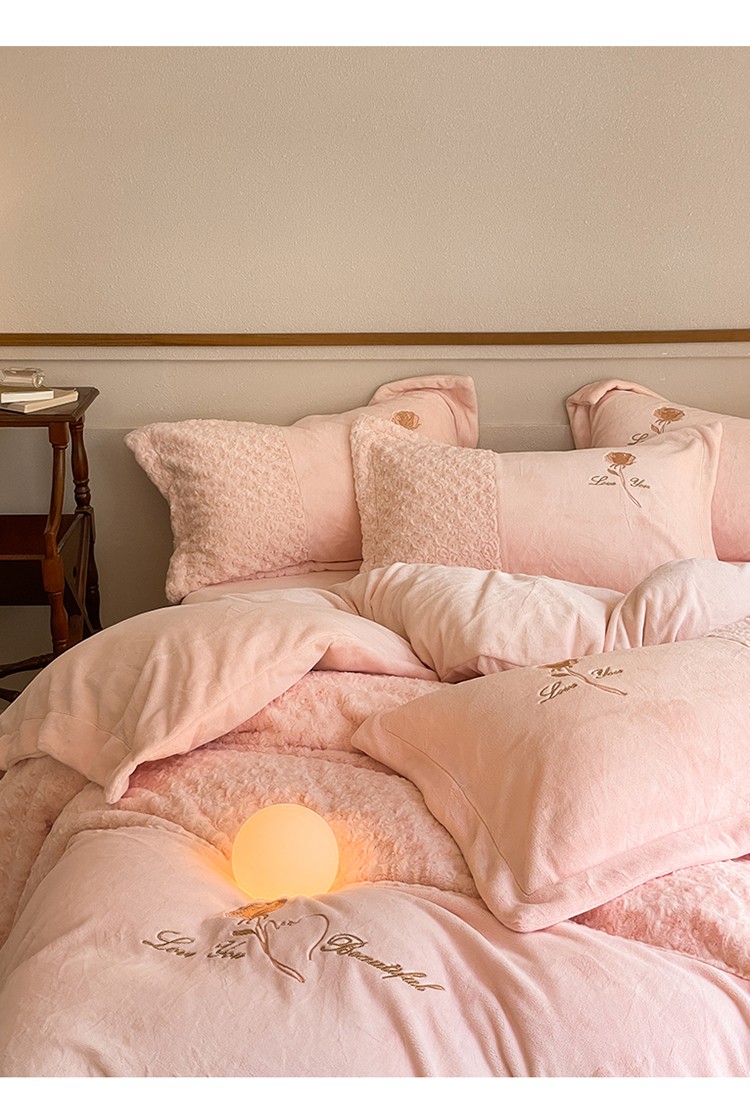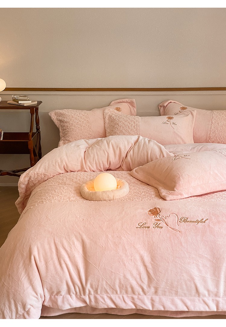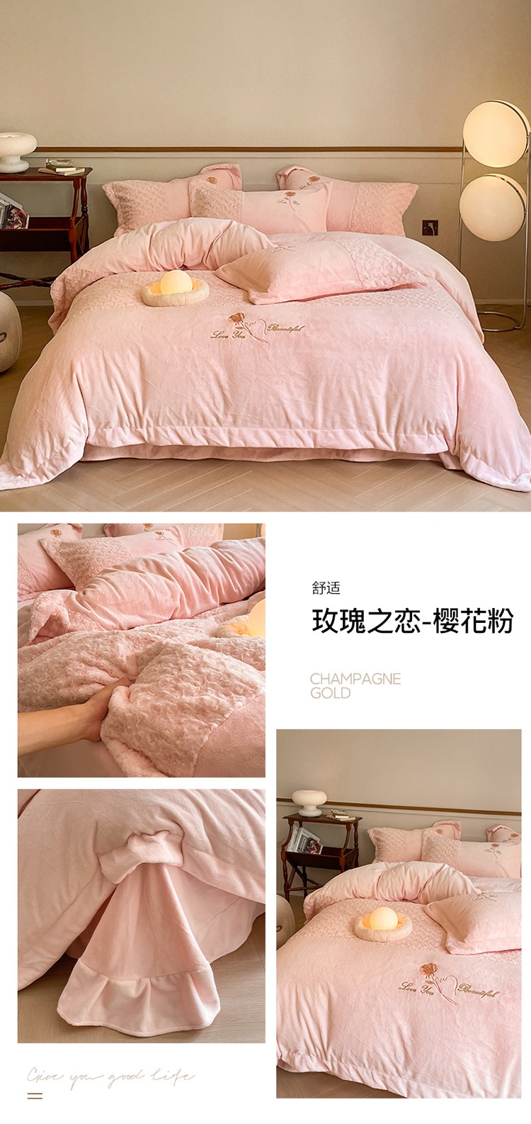 嗯呢23新款高克重双拼兔毛绒牛奶绒保暖刺绣绒四件套 玫瑰之恋-樱花粉