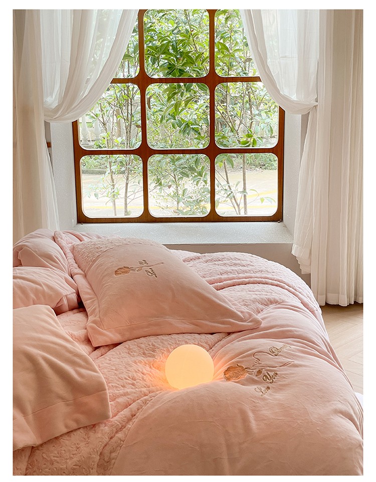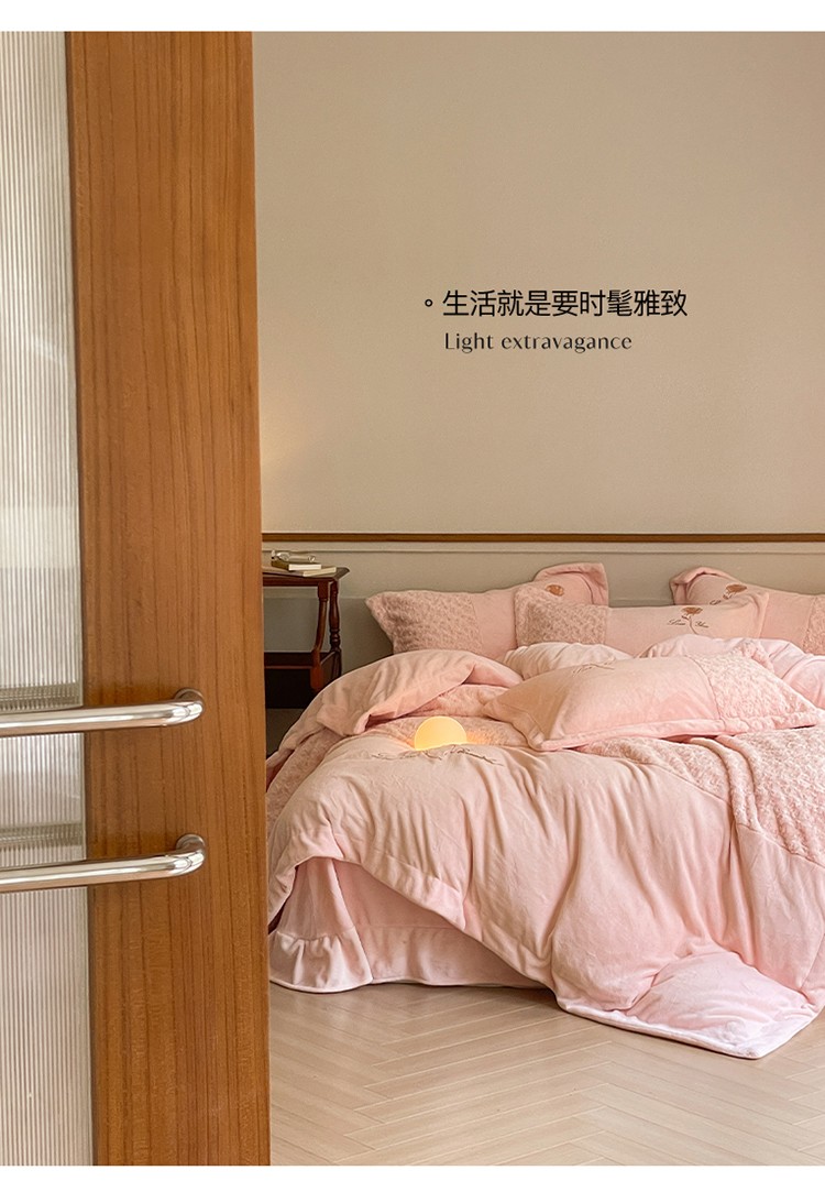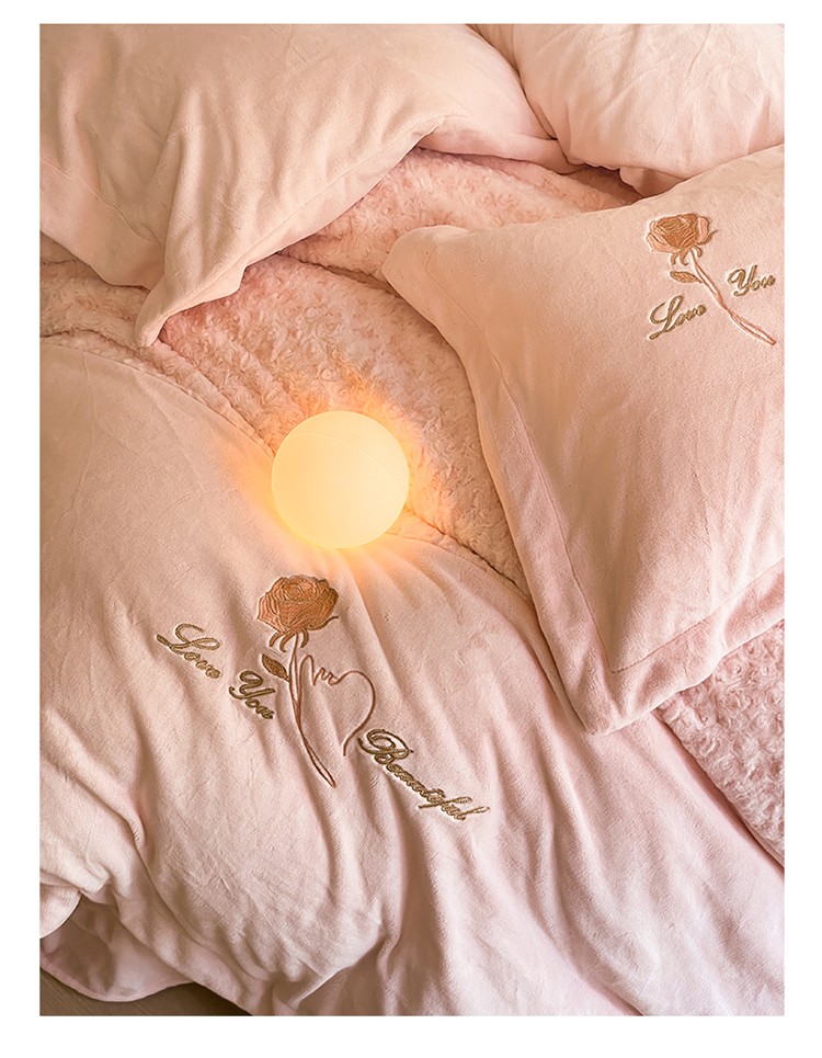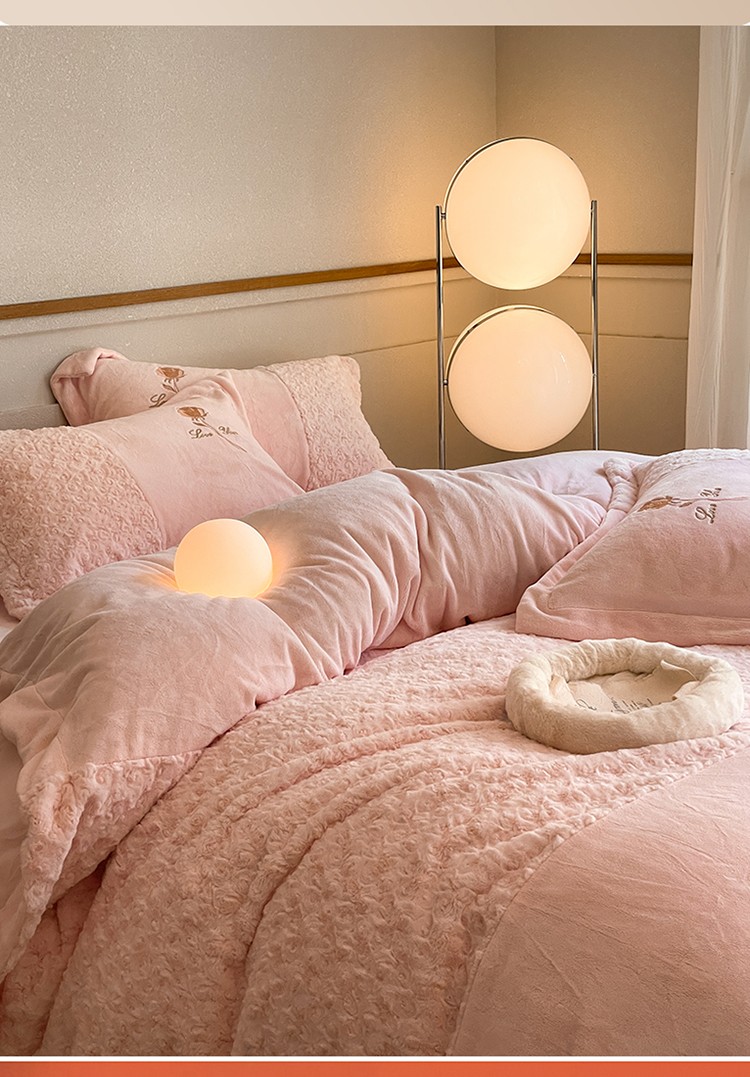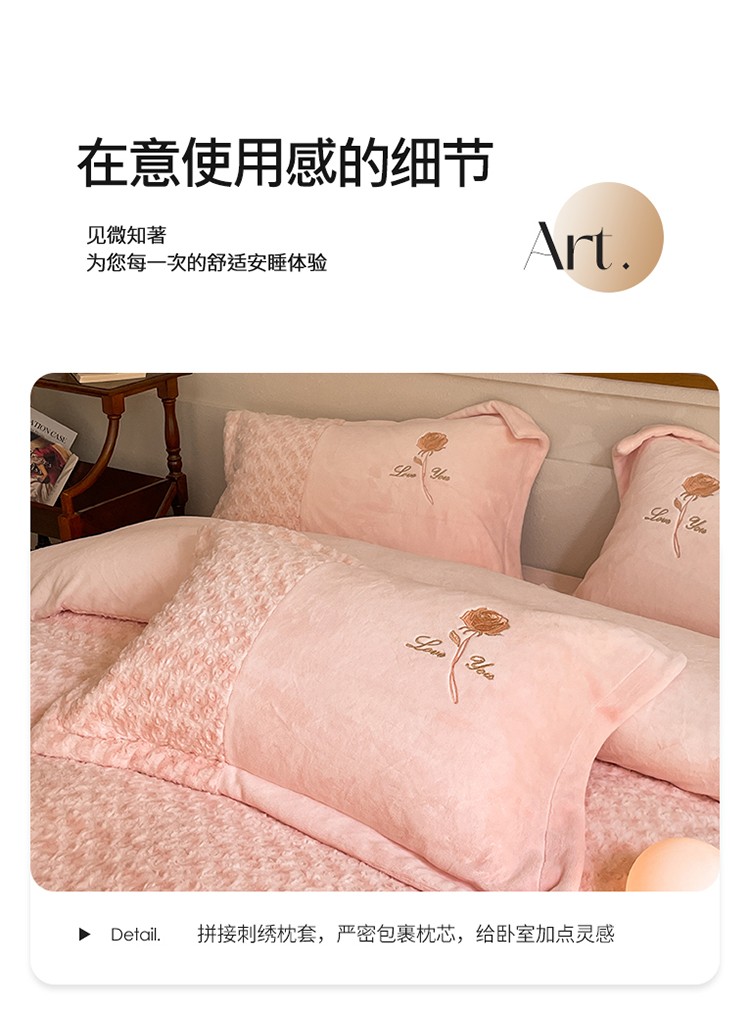 嗯呢23新款高克重双拼兔毛绒牛奶绒保暖刺绣绒四件套 玫瑰之恋-樱花粉