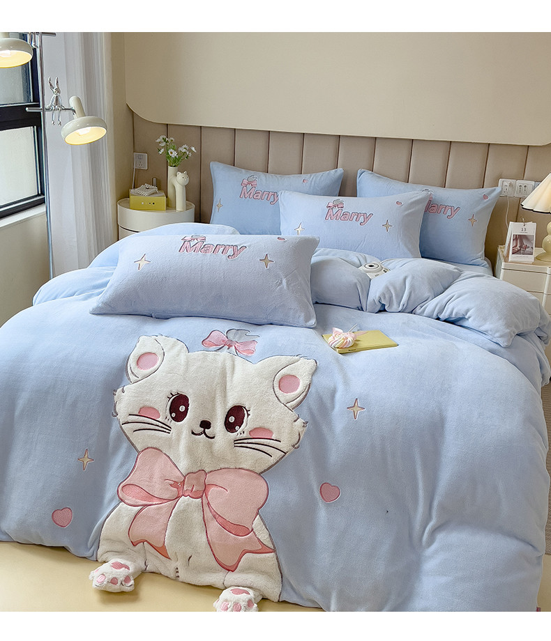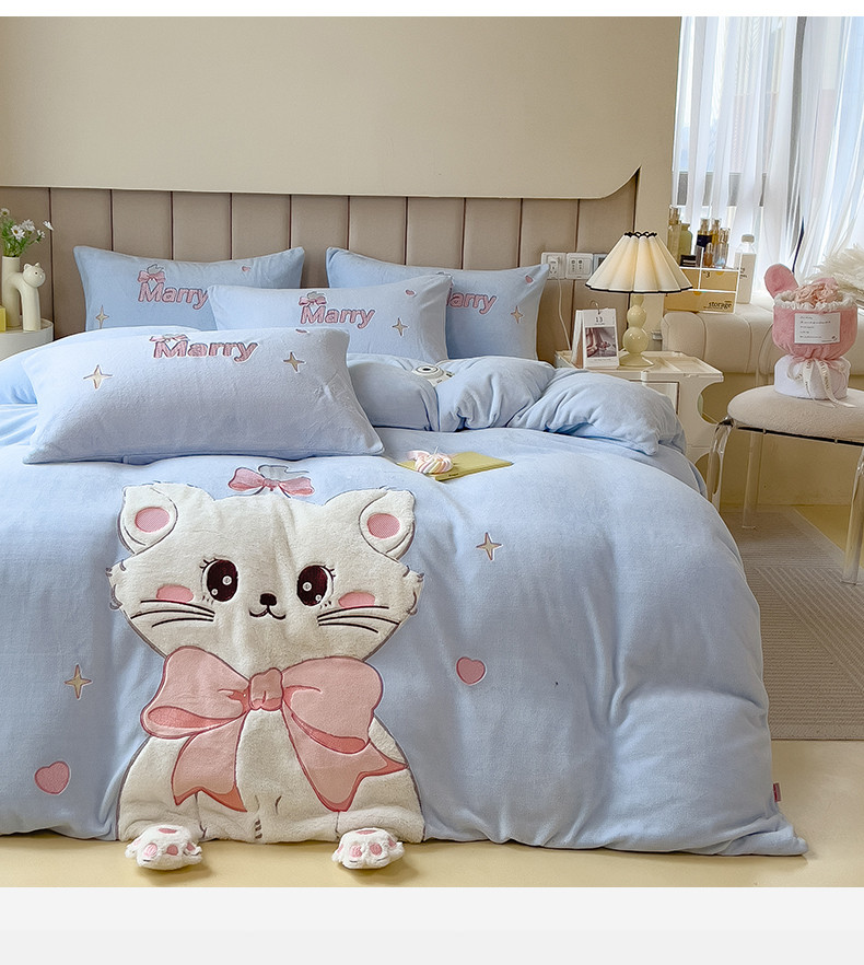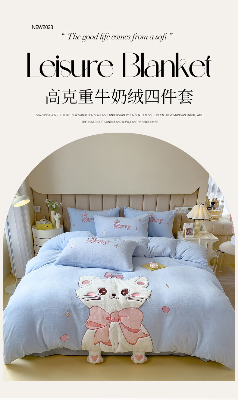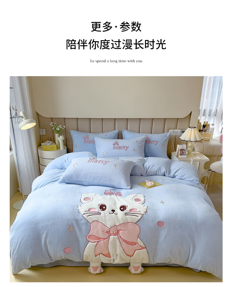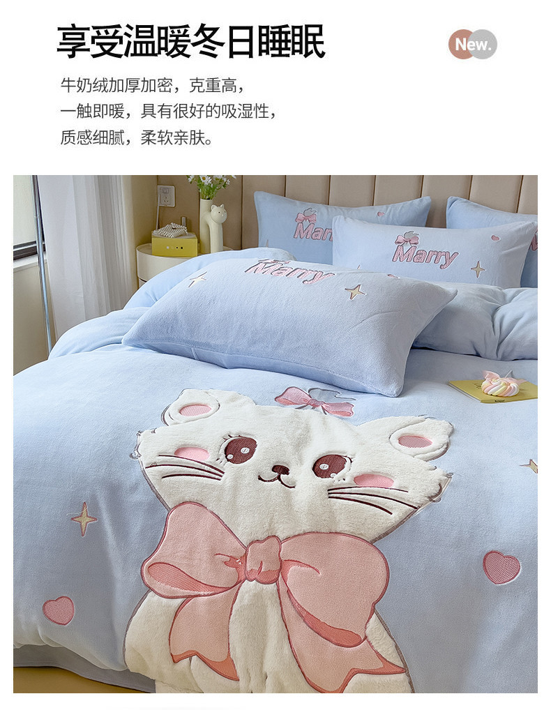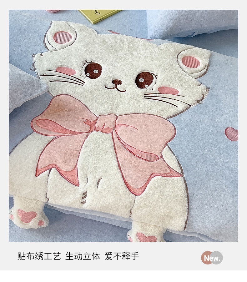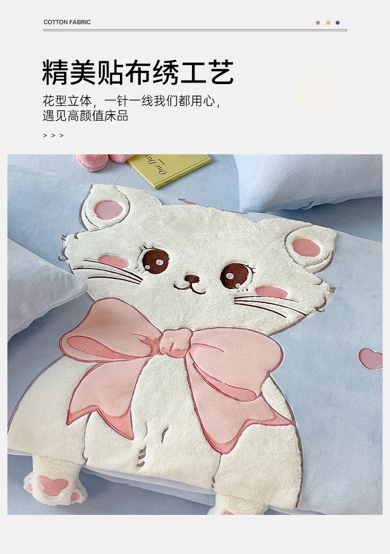 (总)金绣美居 2025新款卡通贴布绣款牛奶绒四件套-招财猫,招财猫-蓝,招财猫-粉