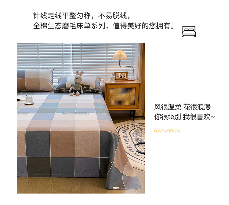• 91家纺网 家纺一手货源 找家纺 芃成家纺 2023磨毛单床单 青春格-蓝