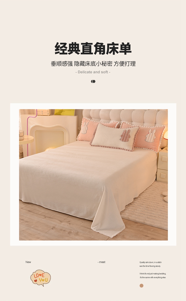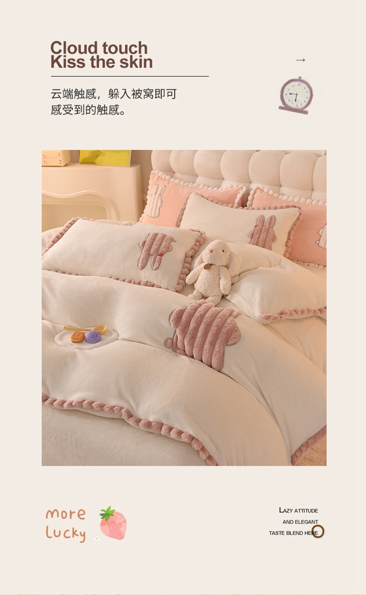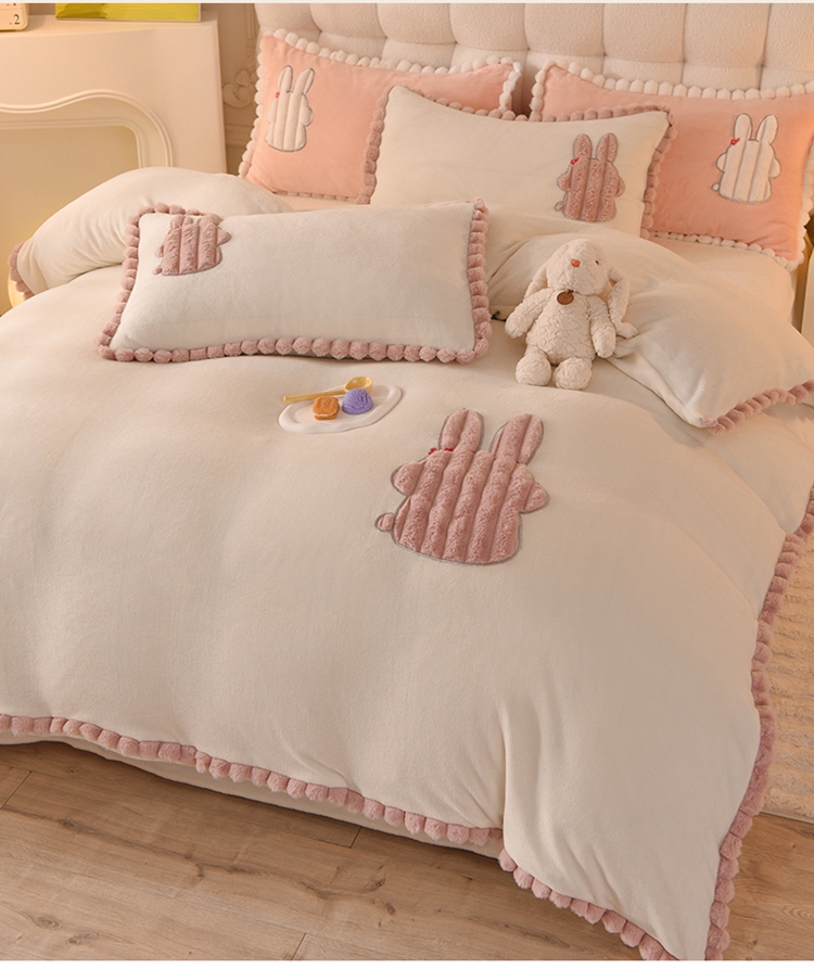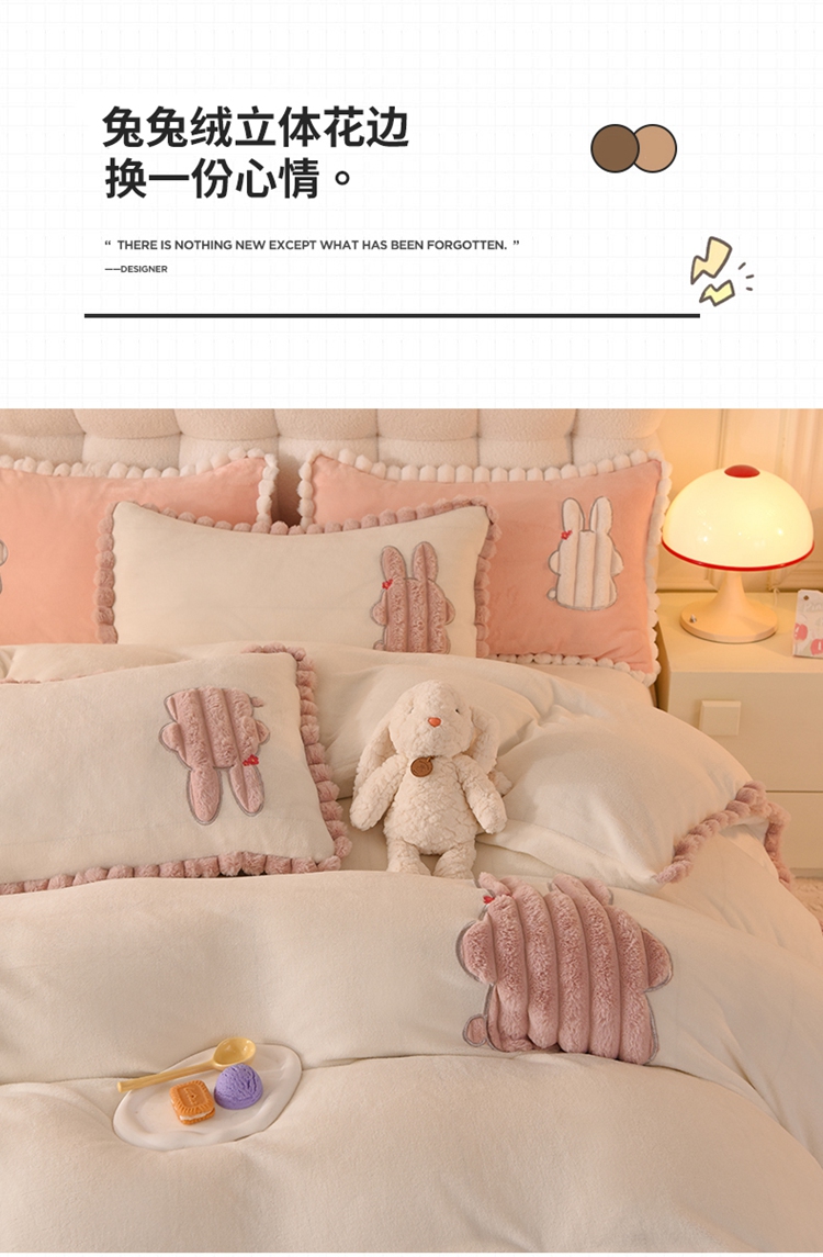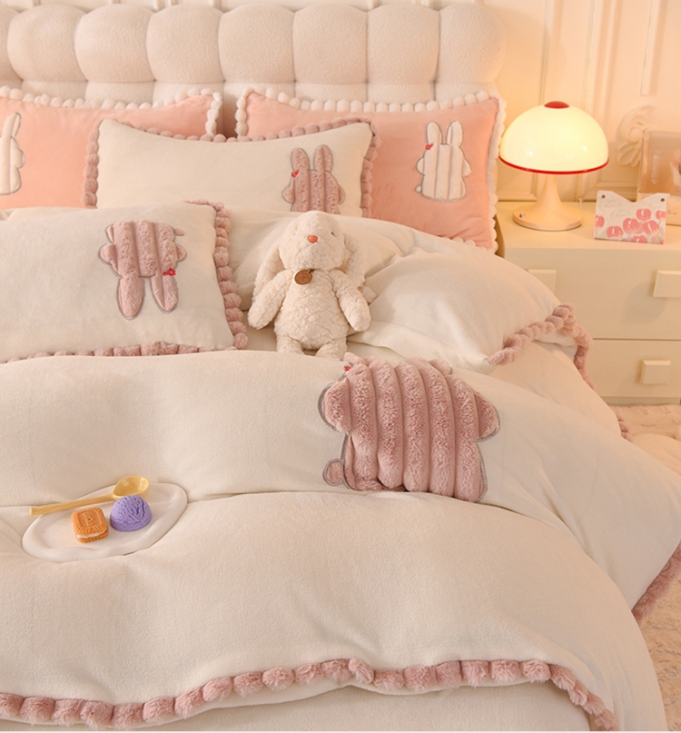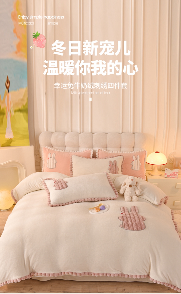 艾米家居 2023新款秋冬牛奶绒刺绣花边四件套-幸运兔 白色