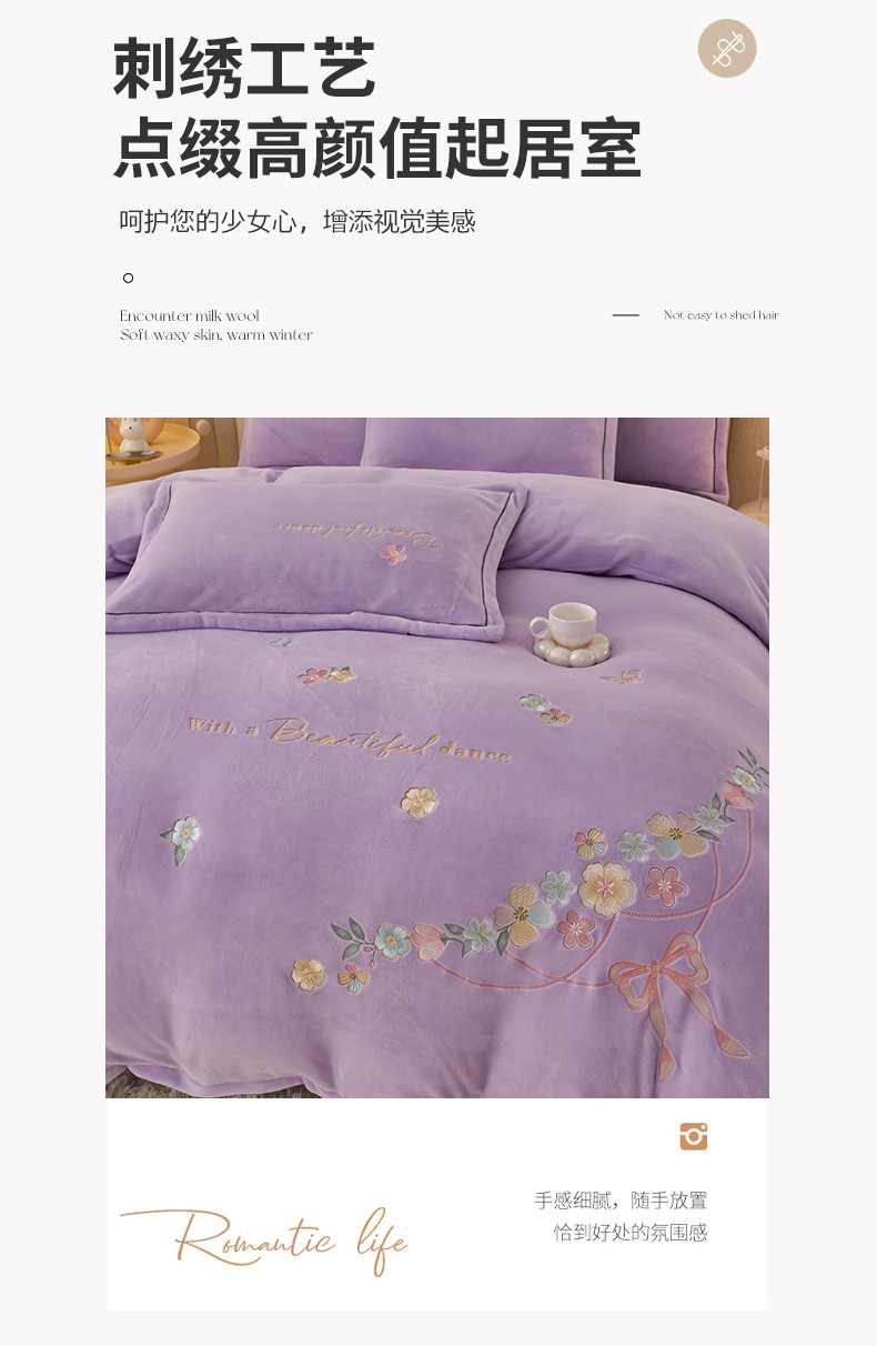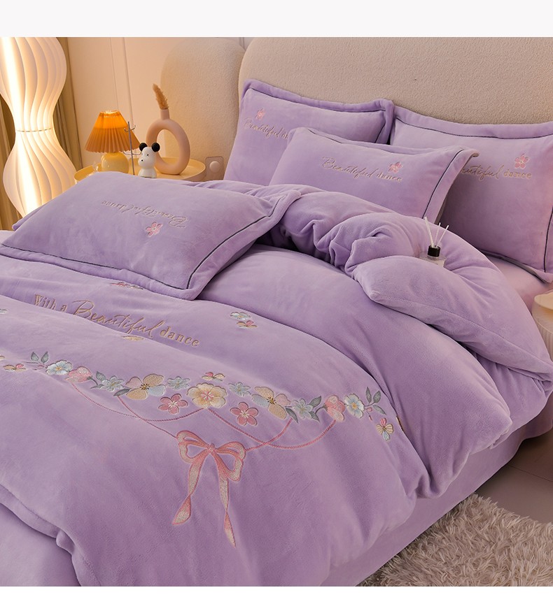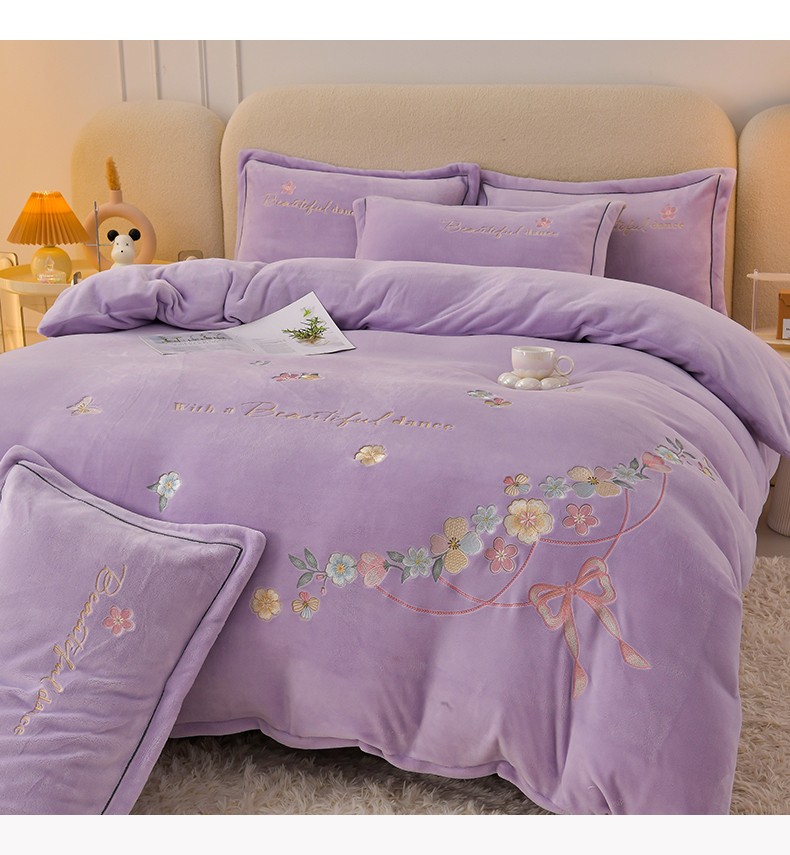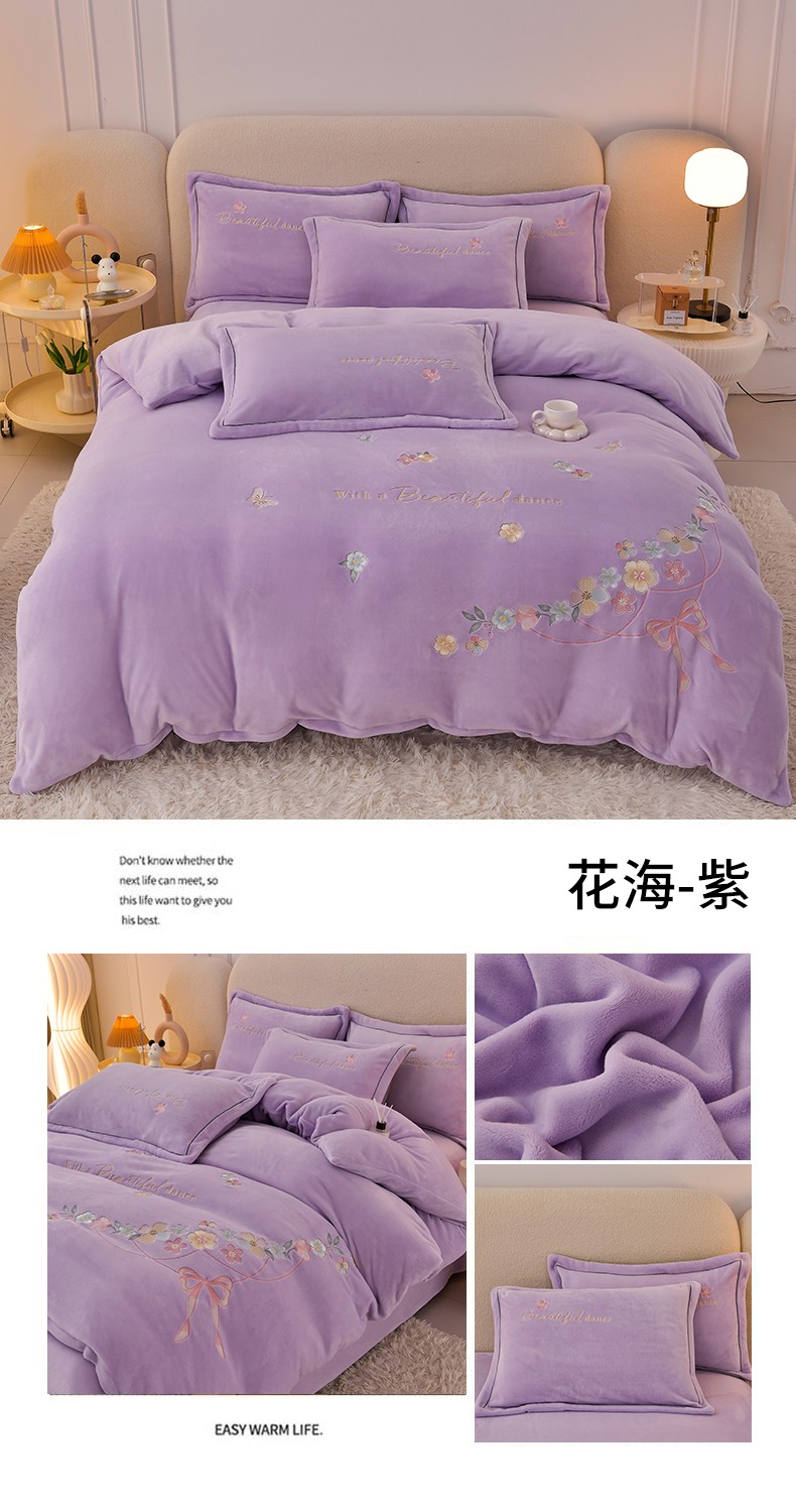 畅畅家纺 2023高克重牛奶绒刺绣花四件套金貂法莱宝宝水晶雪花绒四件套 花海-紫