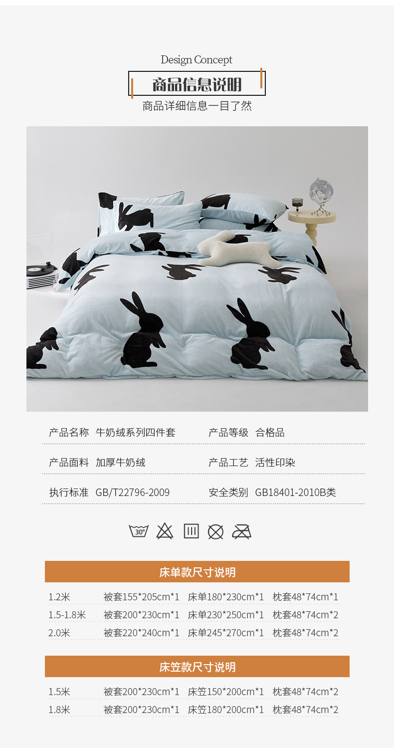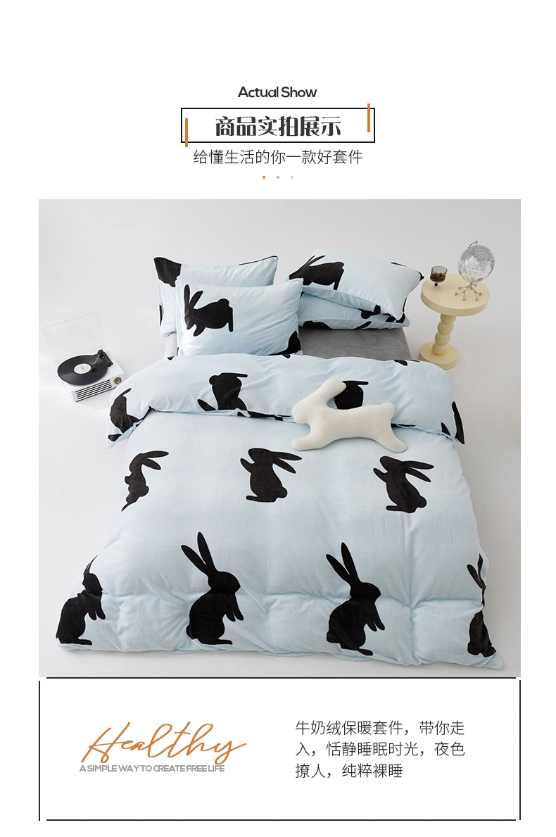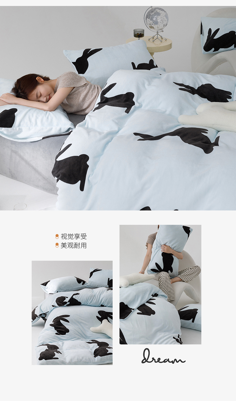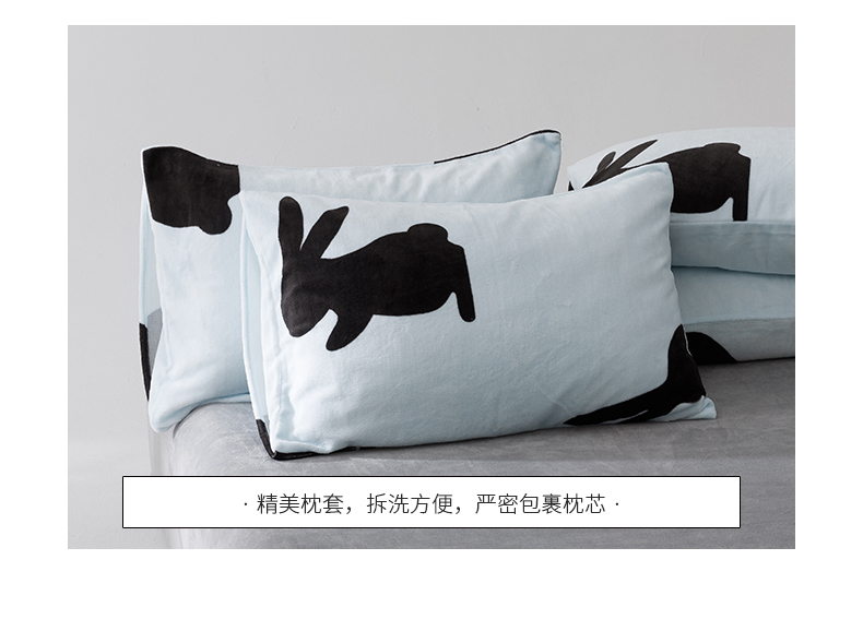 商品名称:桃子2023新款ins轻奢简约潮派极简高级时尚兔本兔高克重牛奶绒系列四件套 绒兔本兔-水蓝