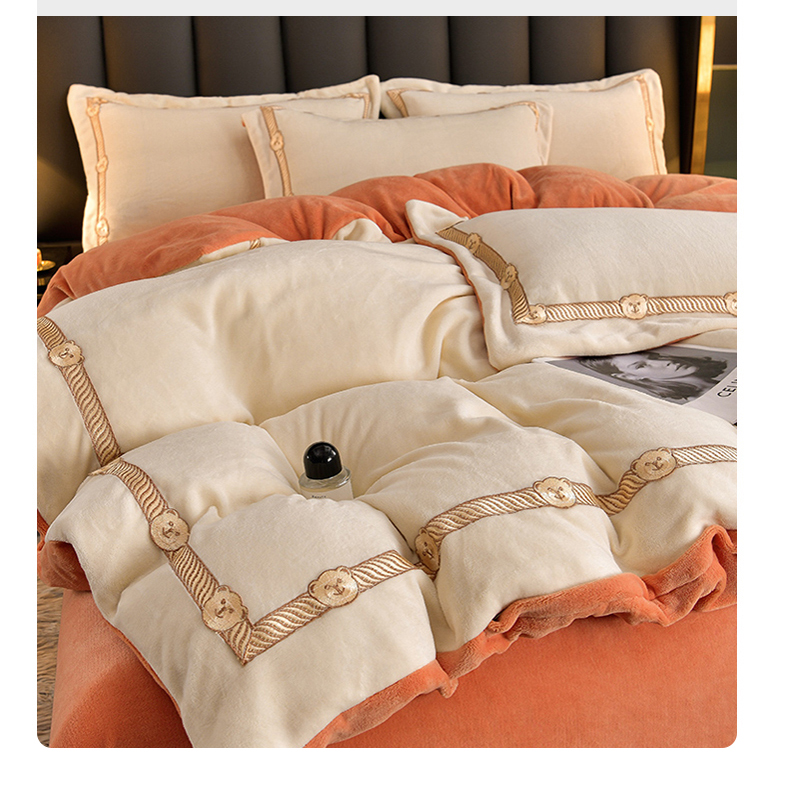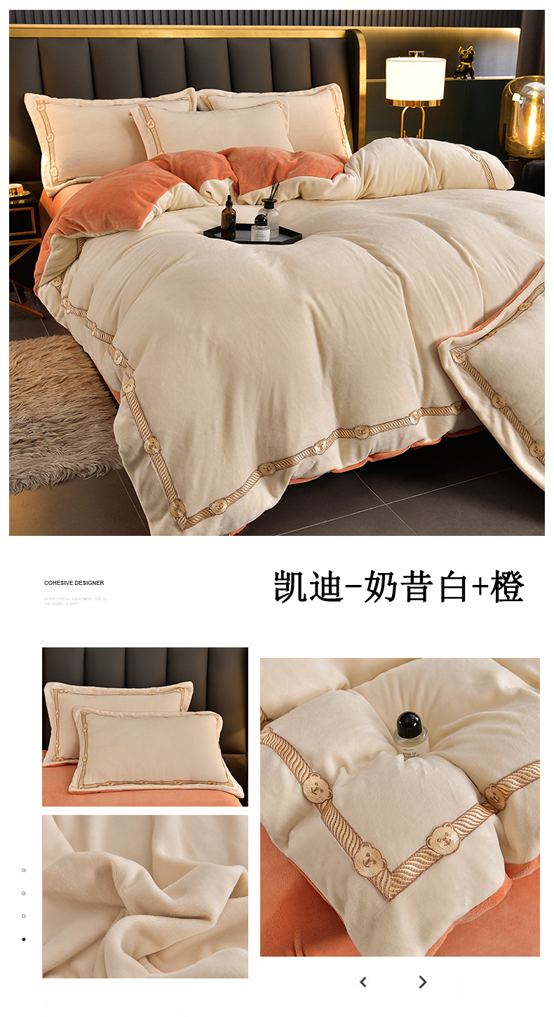商品名称:云家 (包含买家秀)2023新款高克重牛奶绒纯色双拼刺绣四件套珊瑚绒 凯迪系列 凯迪-奶昔白+橙