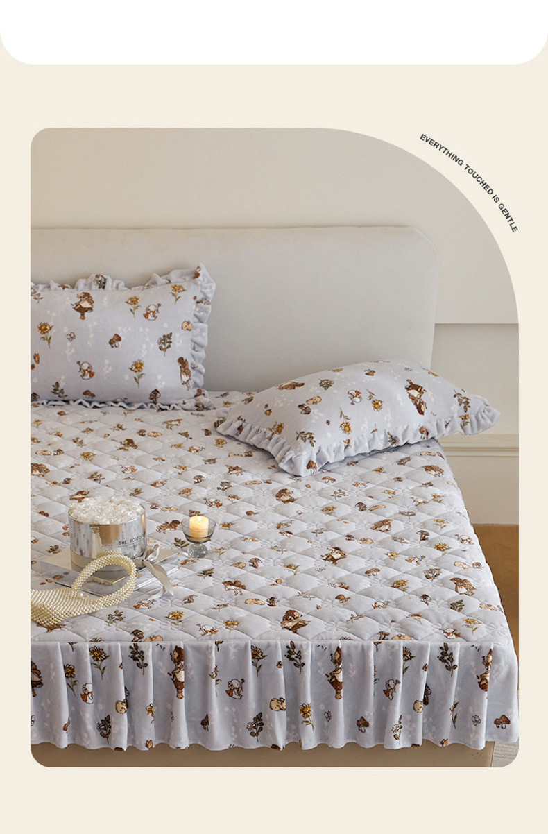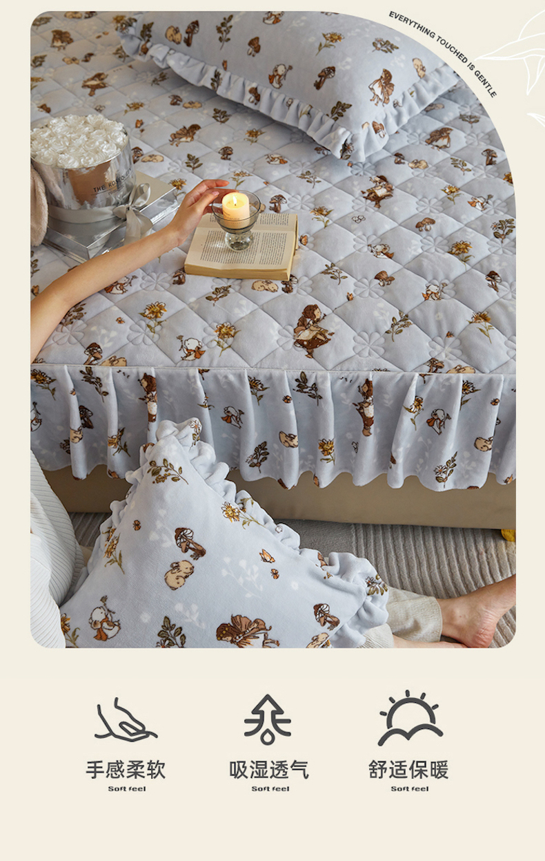 铭动家纺 2023新款牛奶绒花边款床笠大豆夹棉加厚床罩三件套床裙款床笠 紫嫣