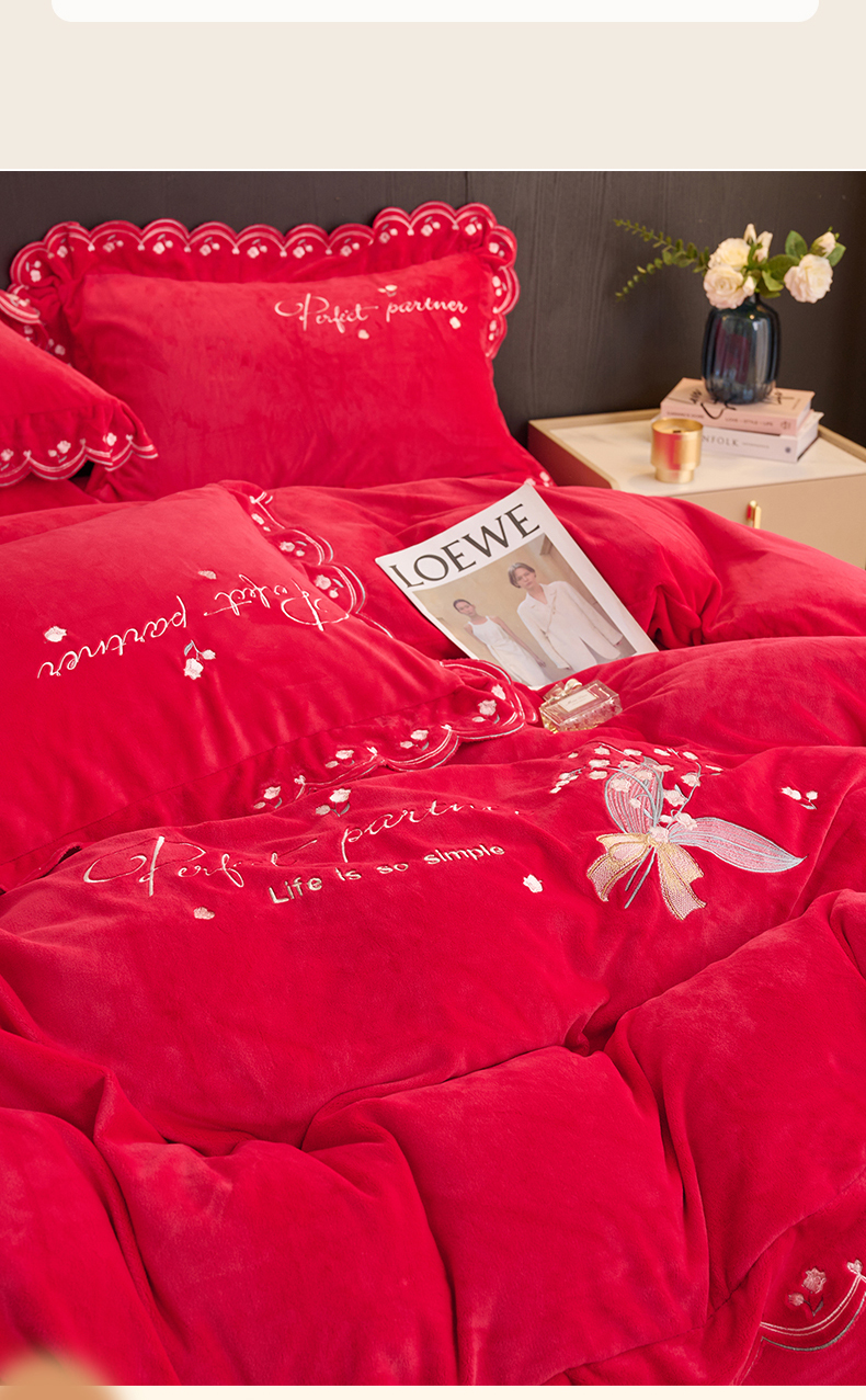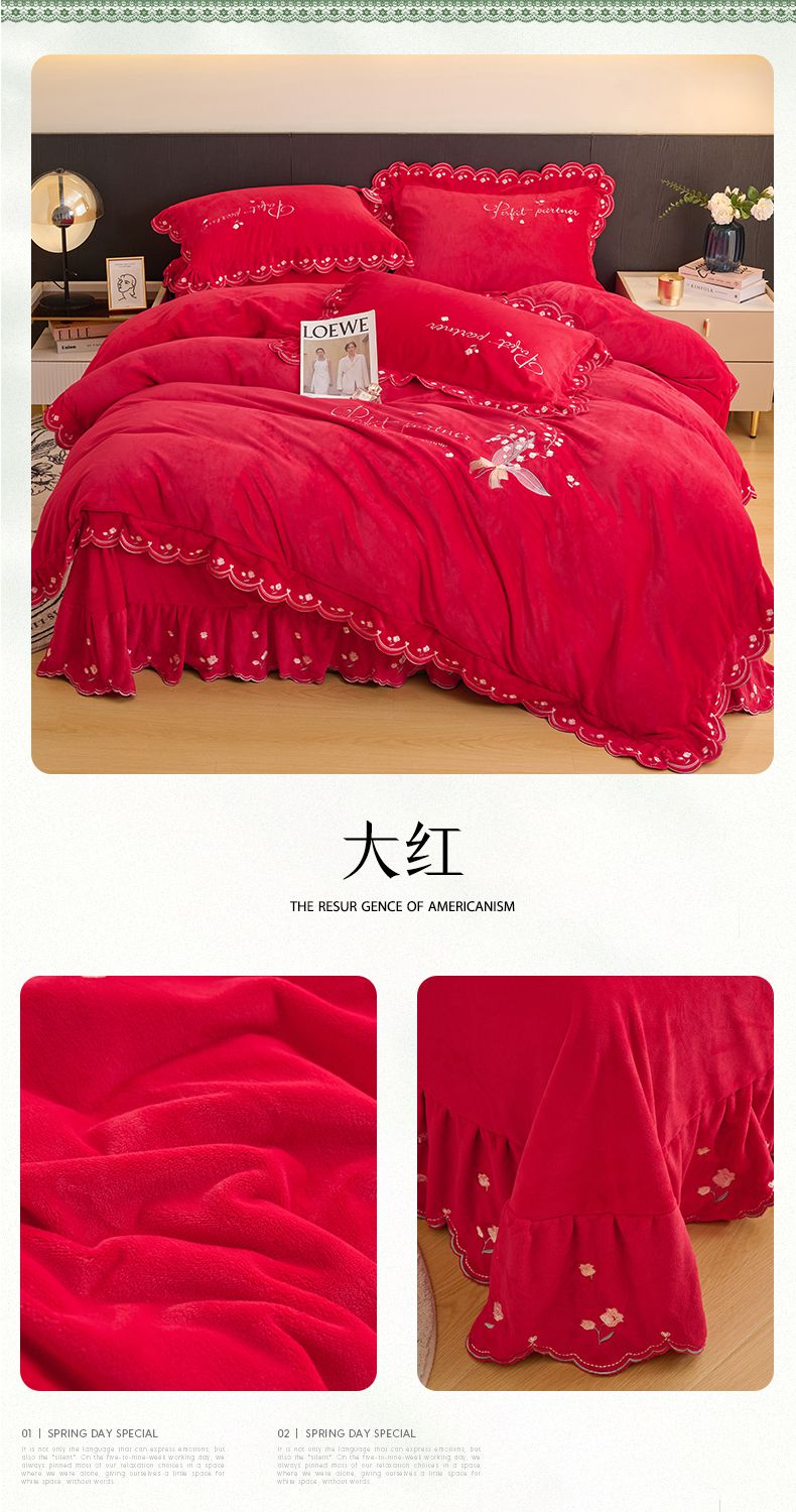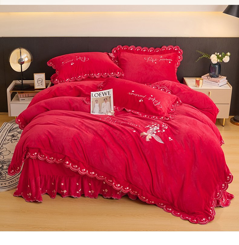 商品名称:恒爱2023新款加厚双面牛奶绒绣花花边款四件套-铃兰花 大红