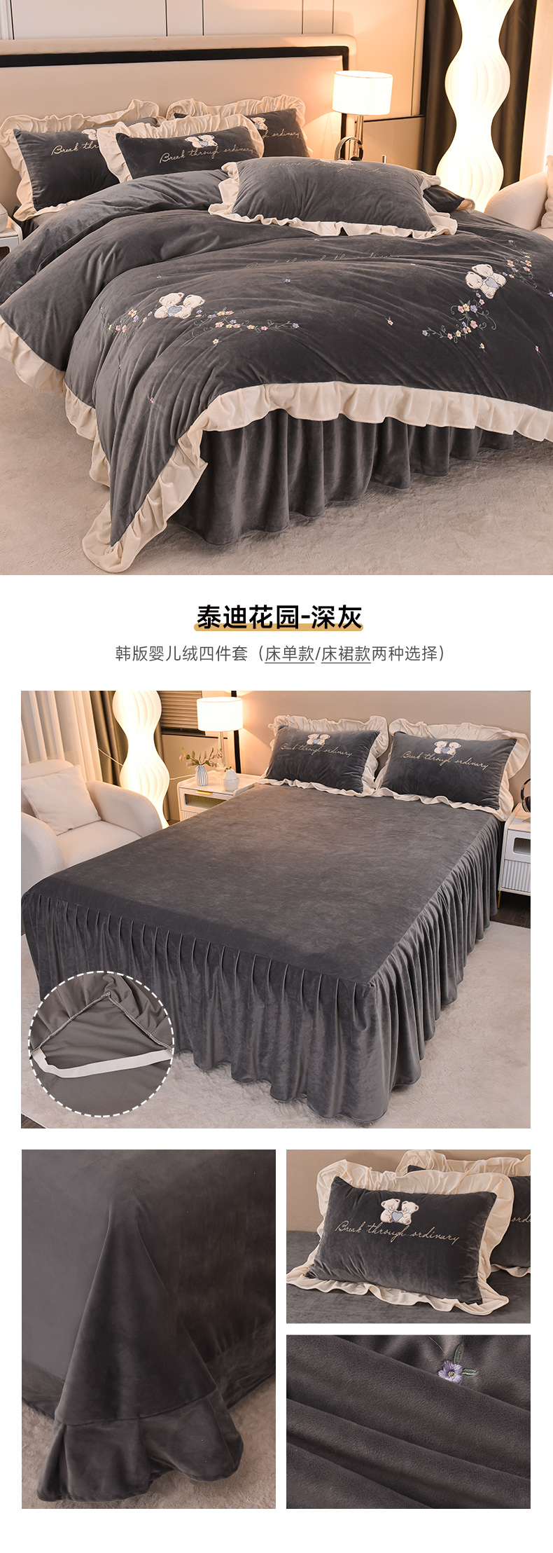 当前位置: 91家纺网 > 商品网购 > 床品套件 > 四件套 > 宝宝绒四件套 > 库里梦家纺 2024新款韩版婴儿绒绣花四件套-泰迪花园 泰迪花园-深灰