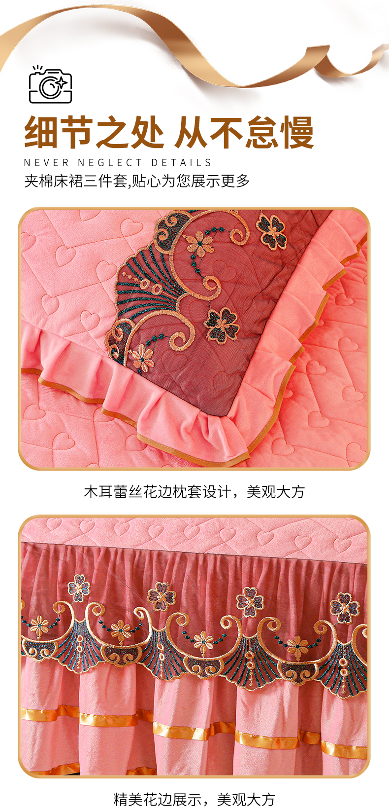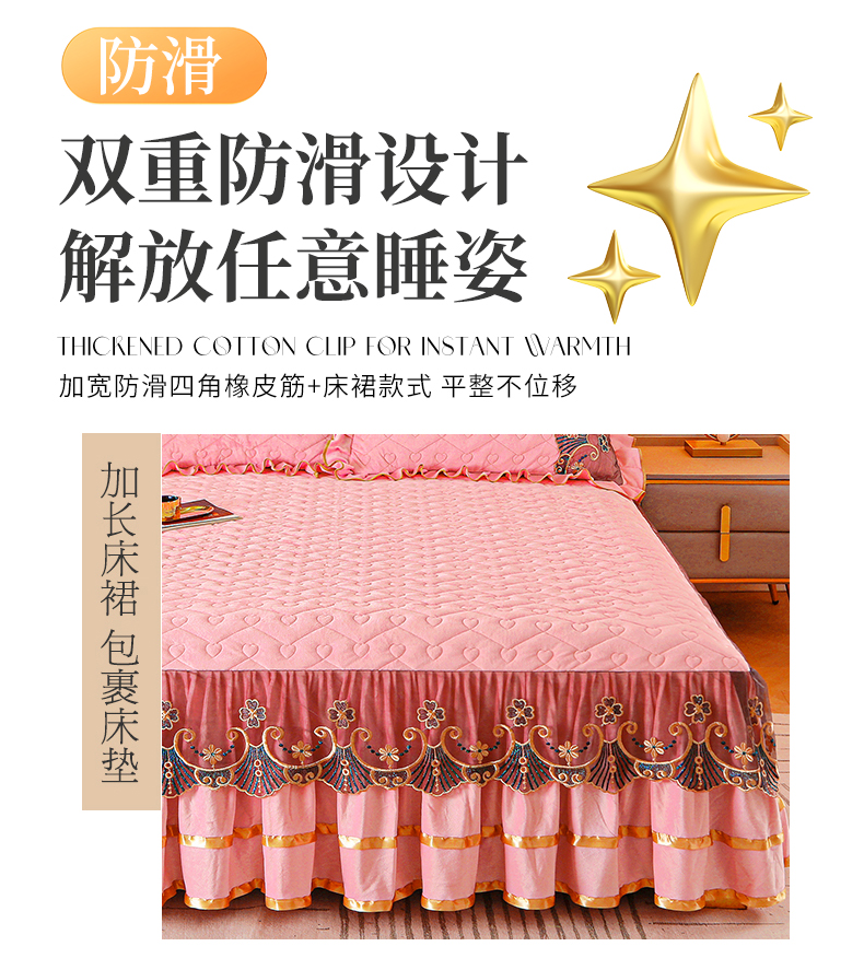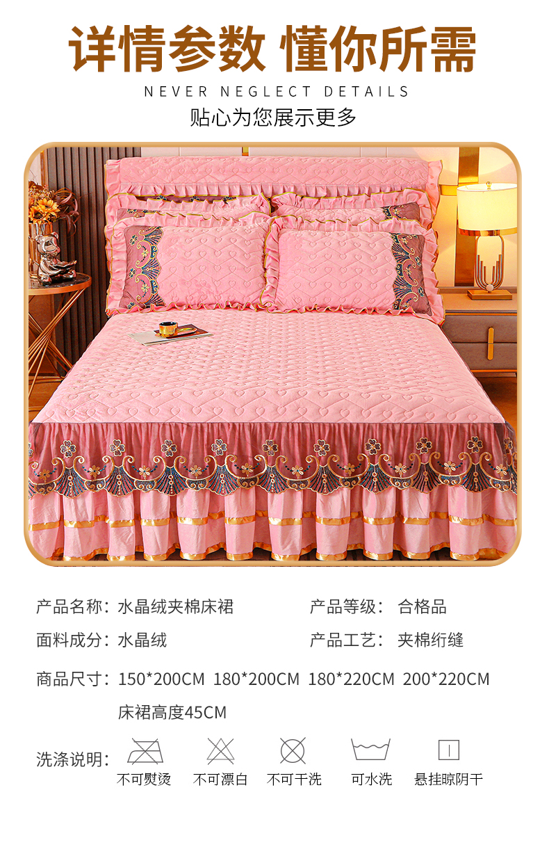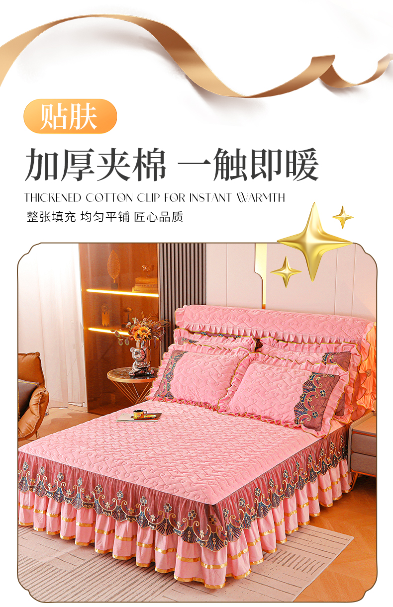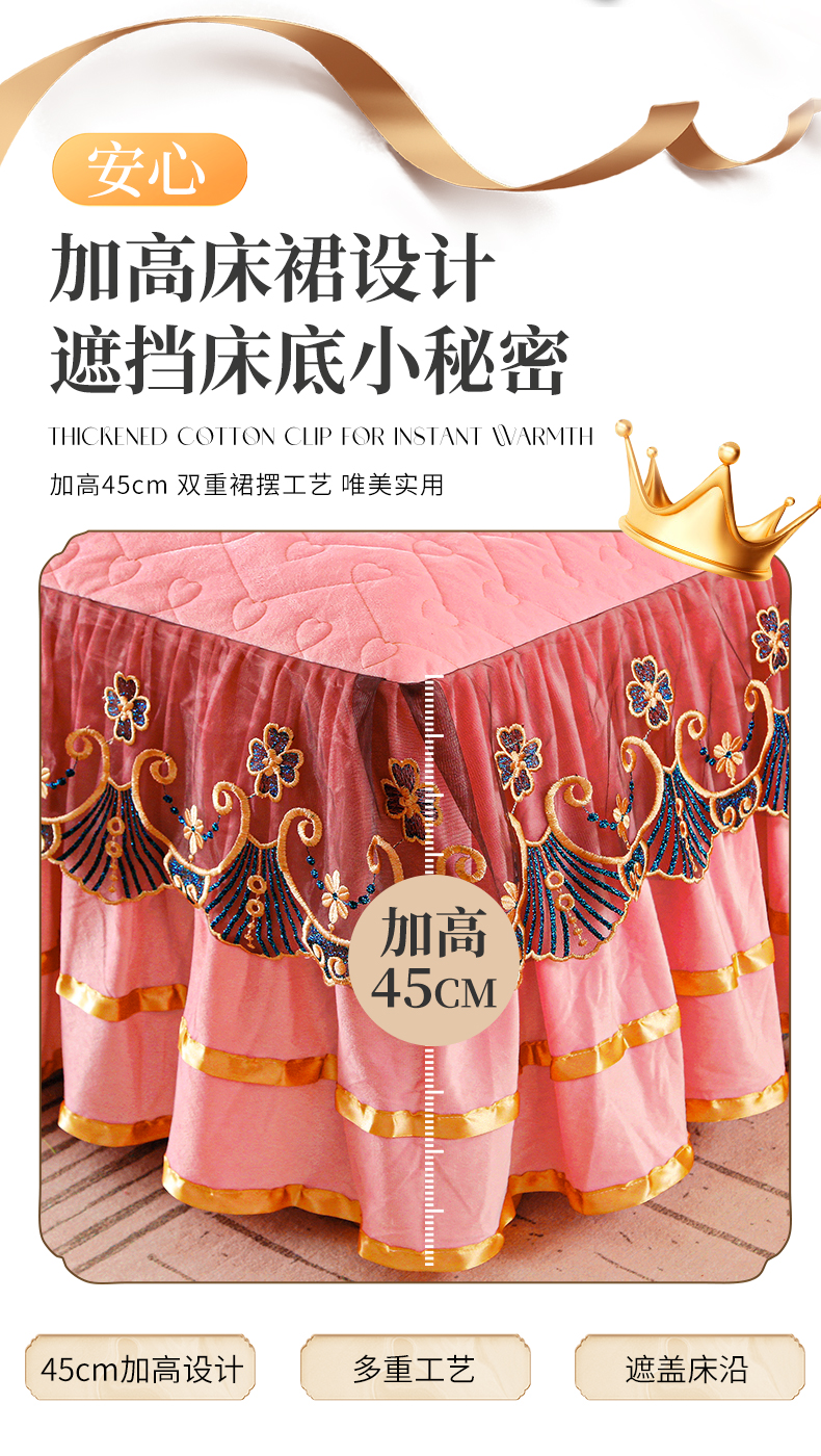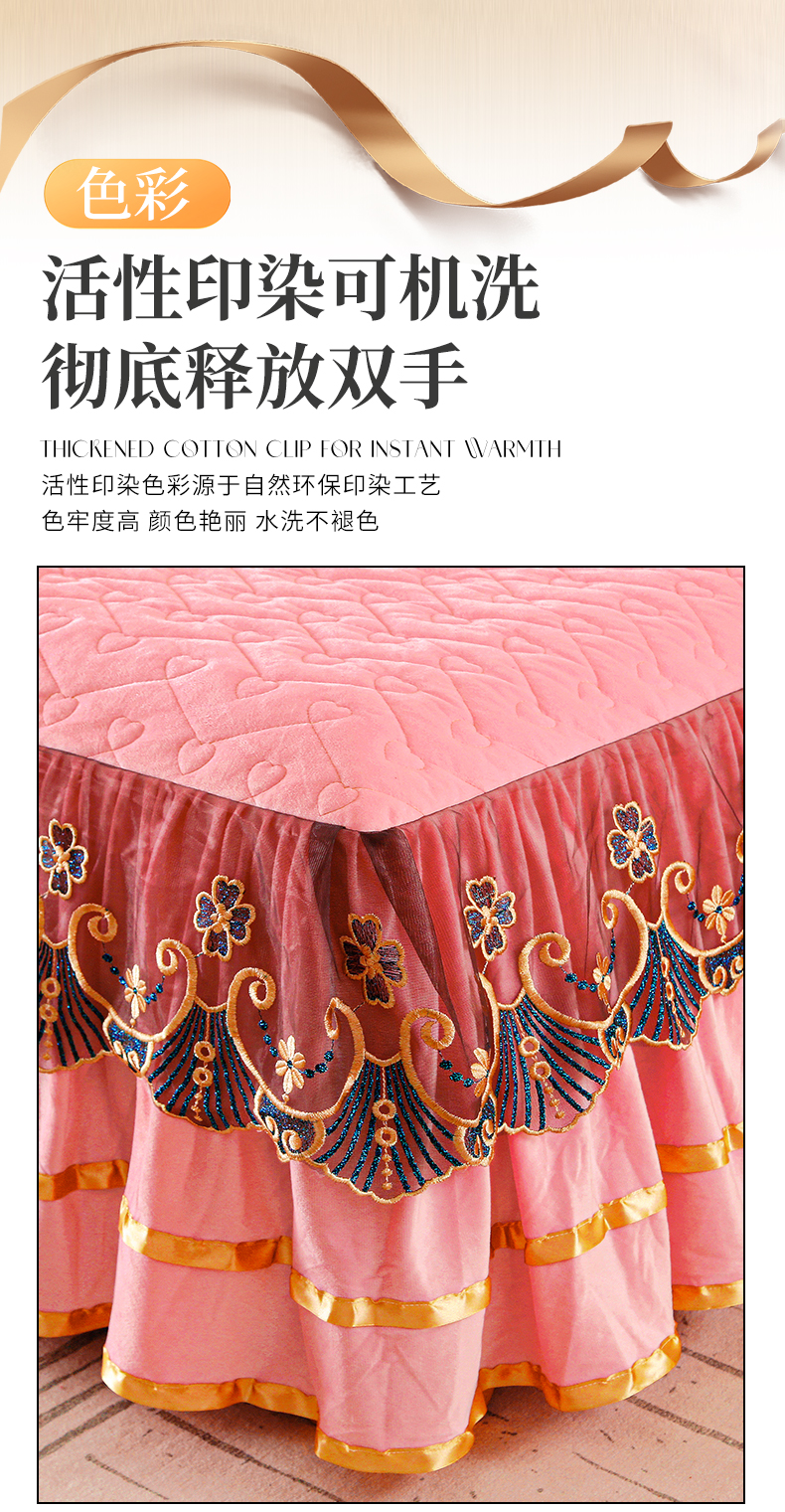 (总)屹成家纺2025新款水晶绒夹棉绗缝蕾丝床裙三件套(塞纳河畔)床裙单件起售价不低于105元,大红,豆沙,翡翠绿,粉玉,橄榄绿,蔚蓝,银灰