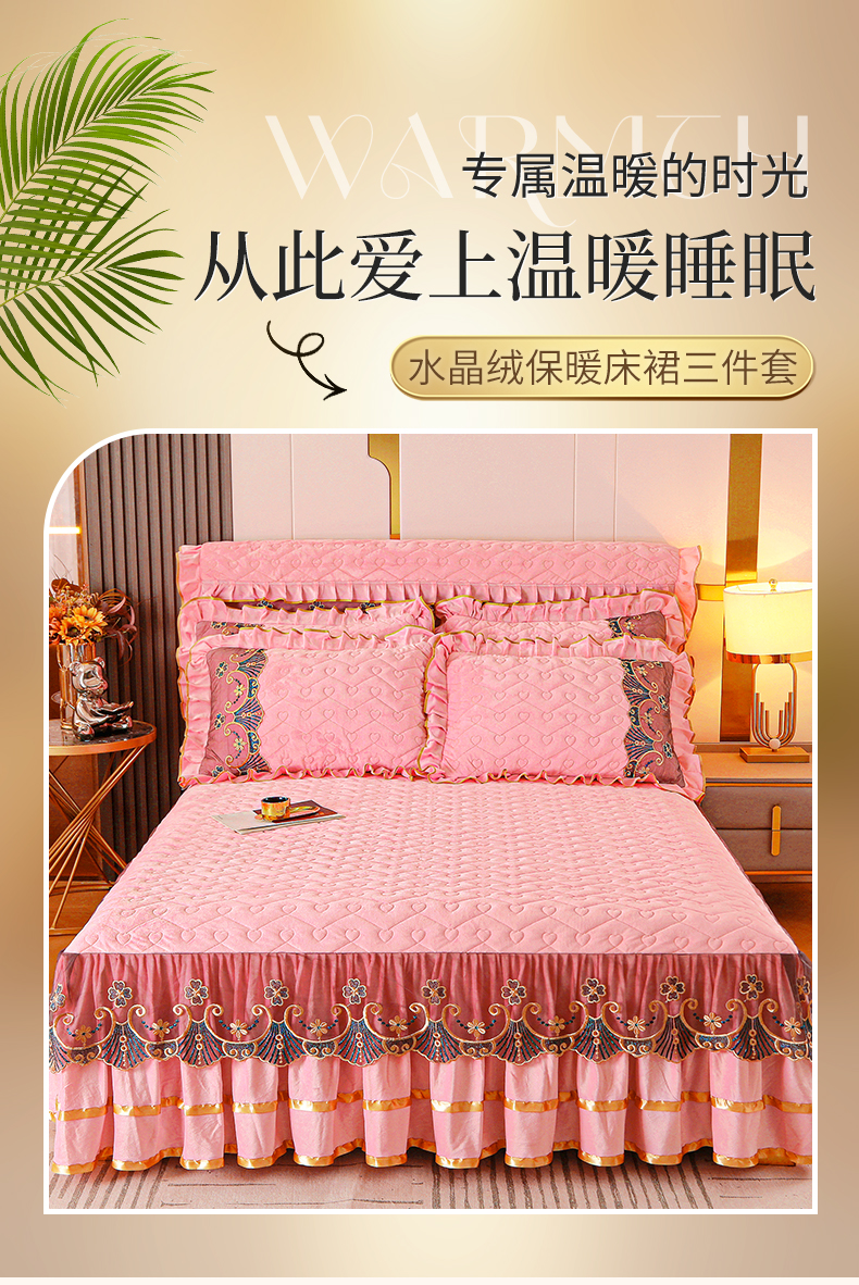 • 91家纺网 家纺一手货源 找家纺 (总)屹成家纺2025新款水晶绒夹棉绗缝蕾丝床裙三件套(塞纳河畔)床裙单件起售价不低于105元,大红,豆沙,翡翠绿,粉玉,橄榄绿,蔚蓝,银灰