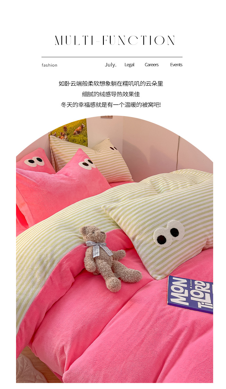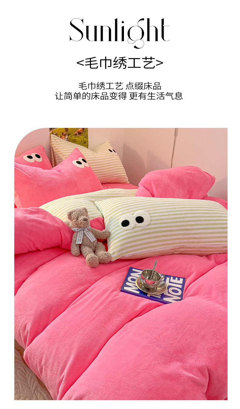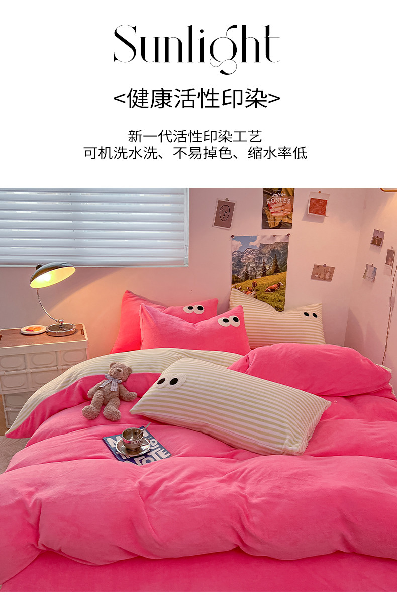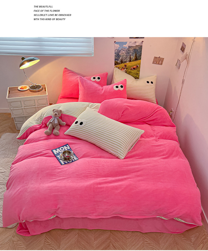 商品名称:韩都家居 2023新款加厚牛奶绒拼色四件套 大眼-玫红