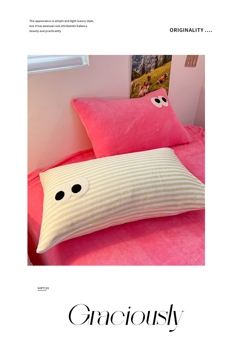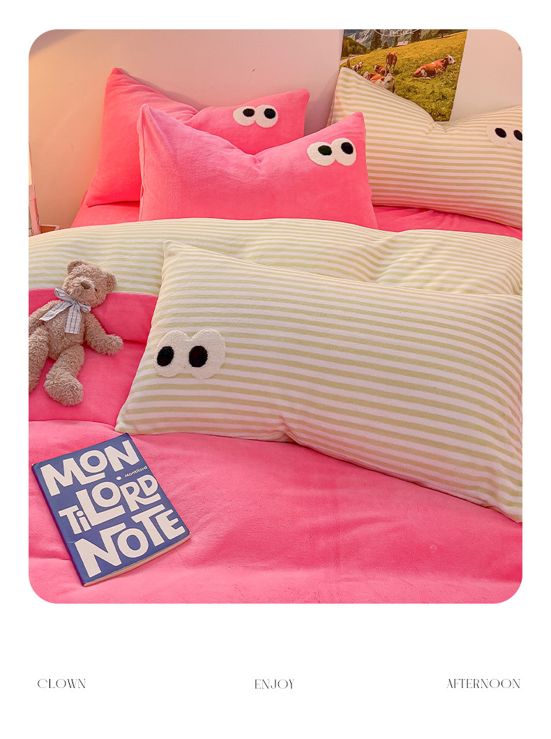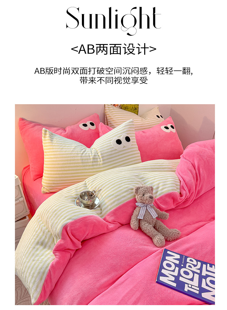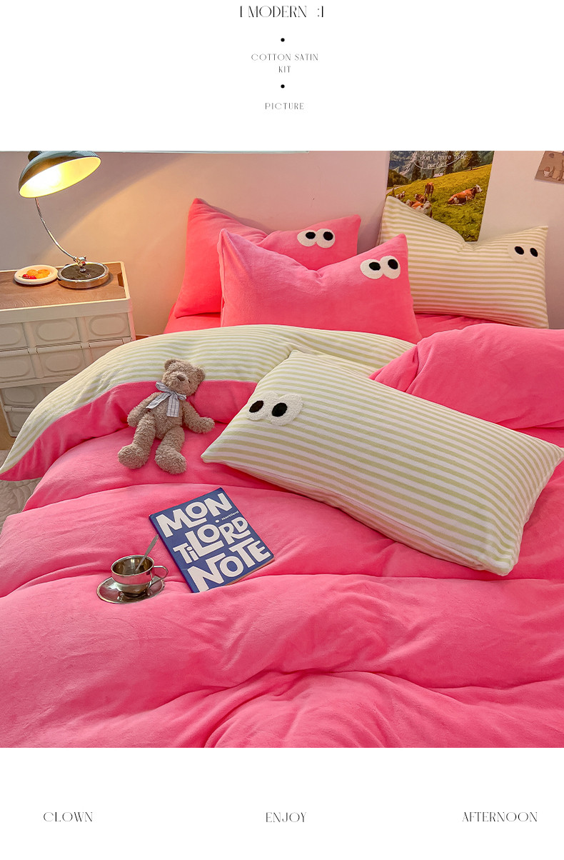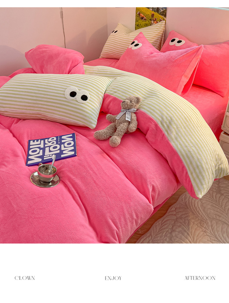 韩都家居 2023新款加厚牛奶绒拼色四件套 大眼-玫红
