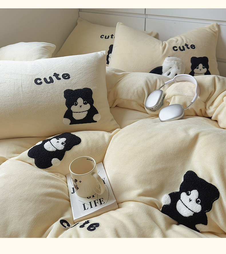 山茶家纺 2023新款高克重牛奶绒贴布绣毛巾绣四件套 欧气小狗-米黄