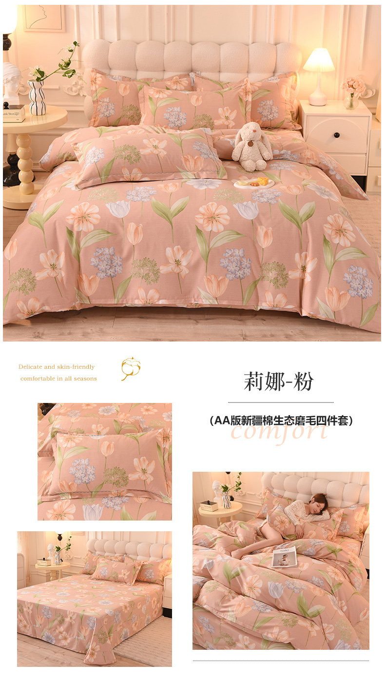 当前位置: 91家纺网 > 商品网购 > 床品套件 > 四件套 > 全棉普通四件套 > 巧玲珑 2023新款高支高密A版生态四件套 莉娜-粉