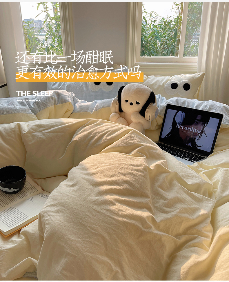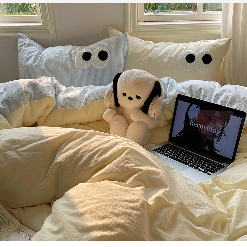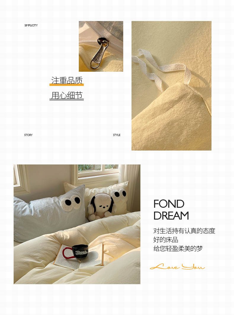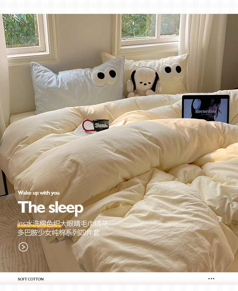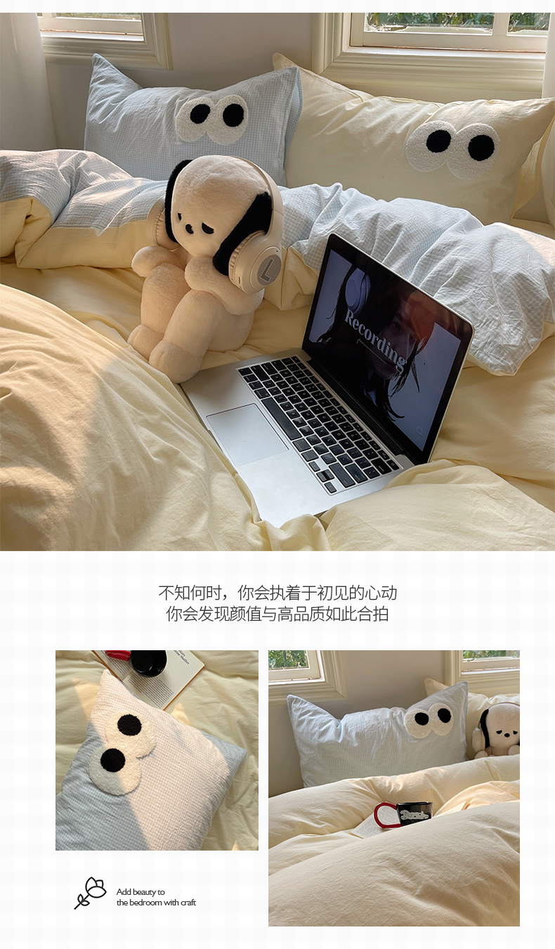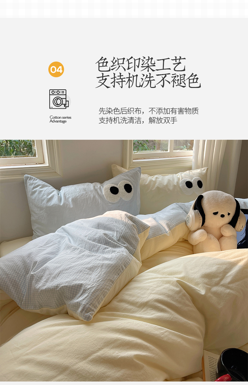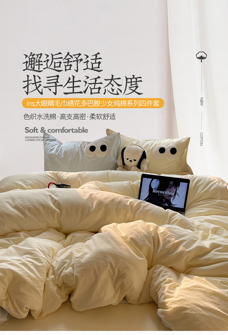 商品名称:2023新款ins水洗棉色织大眼睛毛巾绣花多巴胺少女纯棉系列四件套 水洗棉-大眼蓝黄2