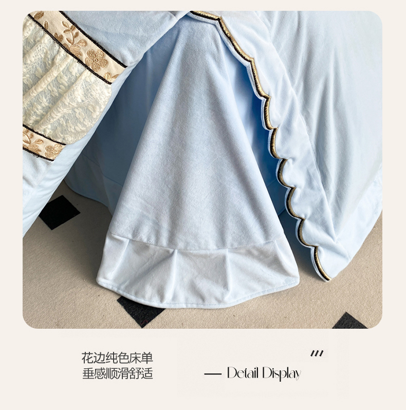 商品名称:2023莫奈花园冬季-A类母婴230g高克重牛奶绒婴儿绒宝宝绒法式蕾丝刺绣绣花四件套 莫奈花园-星河蓝