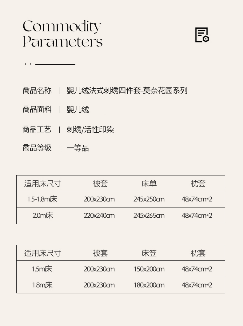 [{"sp_id":11,"sp_name":"\u989c\u8272\u5206\u7c7b","sp_format":2,"sp_list":[{"sp_value_id":47,"sp_value_name":"\u83ab\u5948\u82b1\u56ed-\u661f\u6cb3\u84dd","sp_value_image":{"id":999,"path":"https:\/\/img3.91jf.com\/ghelp\/2023\/20231124\/fb0fc95b-e151-4d7d-9624-c35d88a7a9d620231124142028871.JPG_30_30.JPG"},"sp_value_video":{"id":0,"img":"","path":"","time":0,"download_num":0,"play_num":0},"price":"215.00","storage":499,"weight":"4.400","is_check_weight":0,"plus_price":"","sp_sort":191890098}]},{"sp_id":10,"sp_name":"\u9002\u7528\u5e8a\u5c3a\u5bf8","sp_format":1,"sp_list":[{"sp_value_id":40,"sp_value_name":"1.5m\u5e8a\u5355\u6b3e\u56db\u4ef6\u5957","sp_value_image":{"id":0,"path":""},"sp_value_video":{"id":0,"img":"","path":"","time":0,"download_num":0,"play_num":0},"price":"215.00","storage":100,"weight":"4.400","is_check_weight":0,"plus_price":"","sp_sort":191890098},{"sp_value_id":41,"sp_value_name":"1.8m\u5e8a\u5355\u6b3e\u56db\u4ef6\u5957","sp_value_image":{"id":0,"path":""},"sp_value_video":{"id":0,"img":"","path":"","time":0,"download_num":0,"play_num":0},"price":"215.00","storage":99,"weight":"4.400","is_check_weight":0,"plus_price":"","sp_sort":191890099},{"sp_value_id":42,"sp_value_name":"2.0m\u5e8a\u5355\u6b3e\u56db\u4ef6\u5957","sp_value_image":{"id":0,"path":""},"sp_value_video":{"id":0,"img":"","path":"","time":0,"download_num":0,"play_num":0},"price":"235.00","storage":100,"weight":"4.900","is_check_weight":0,"plus_price":"","sp_sort":191890100},{"sp_value_id":736,"sp_value_name":"1.5m\u5e8a\u7b20\u6b3e\u56db\u4ef6\u5957","sp_value_image":{"id":0,"path":""},"sp_value_video":{"id":0,"img":"","path":"","time":0,"download_num":0,"play_num":0},"price":"225.00","storage":100,"weight":"4.400","is_check_weight":0,"plus_price":"","sp_sort":191890101},{"sp_value_id":766,"sp_value_name":"1.8m\u5e8a\u7b20\u6b3e\u56db\u4ef6\u5957","sp_value_image":{"id":0,"path":""},"sp_value_video":{"id":0,"img":"","path":"","time":0,"download_num":0,"play_num":0},"price":"225.00","storage":100,"weight":"4.400","is_check_weight":0,"plus_price":"","sp_sort":191890102}]}]