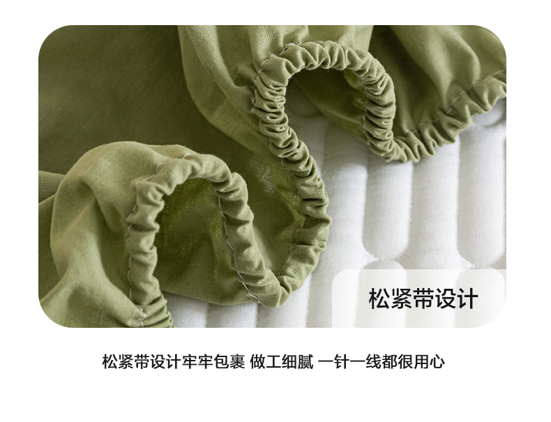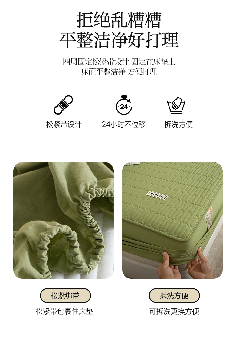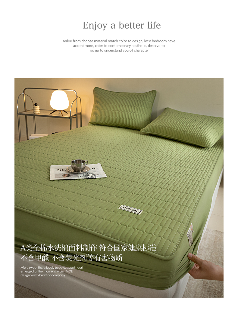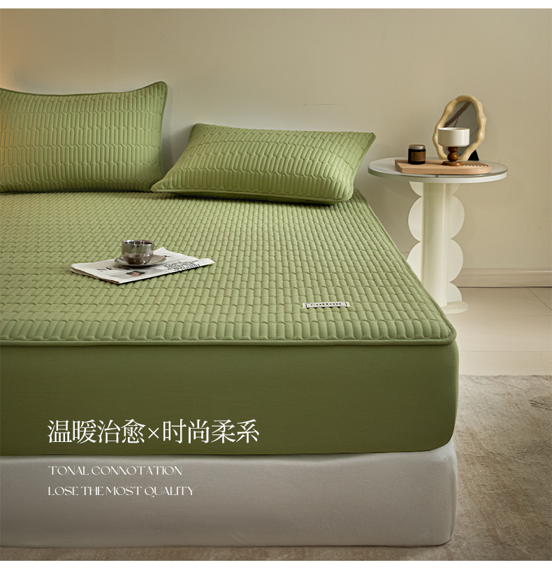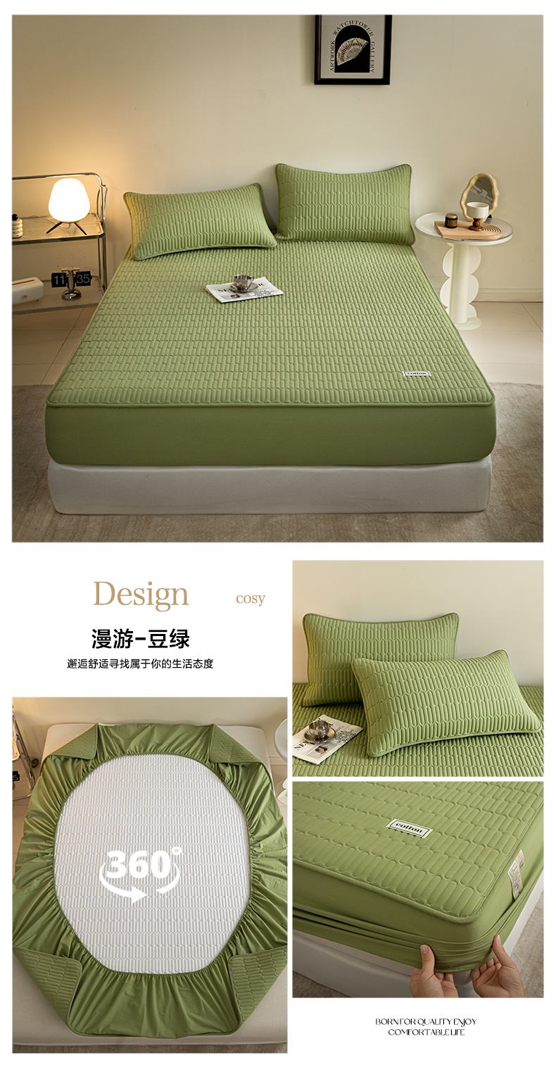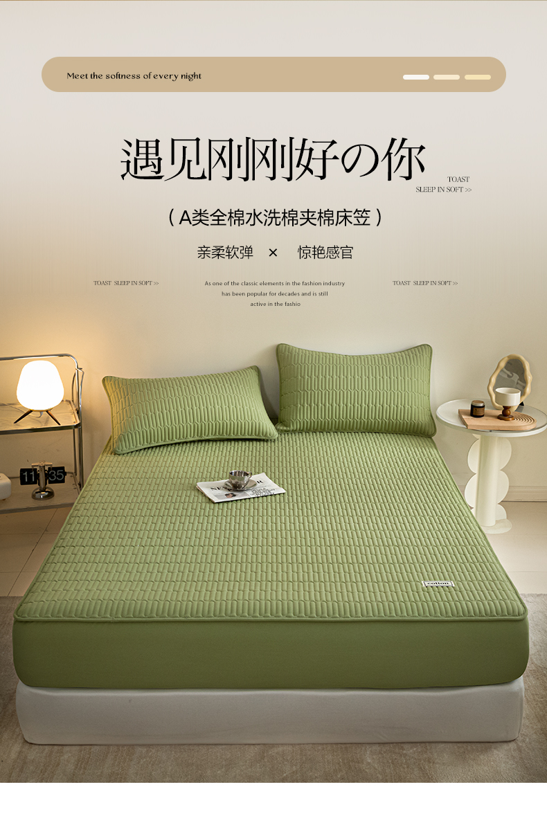 • 91家纺网 家纺一手货源 找家纺 芬晴家纺 2024新款纯棉水洗棉纯色夹棉床笠 漫游-豆绿