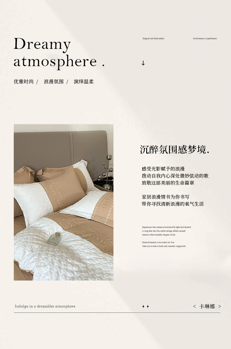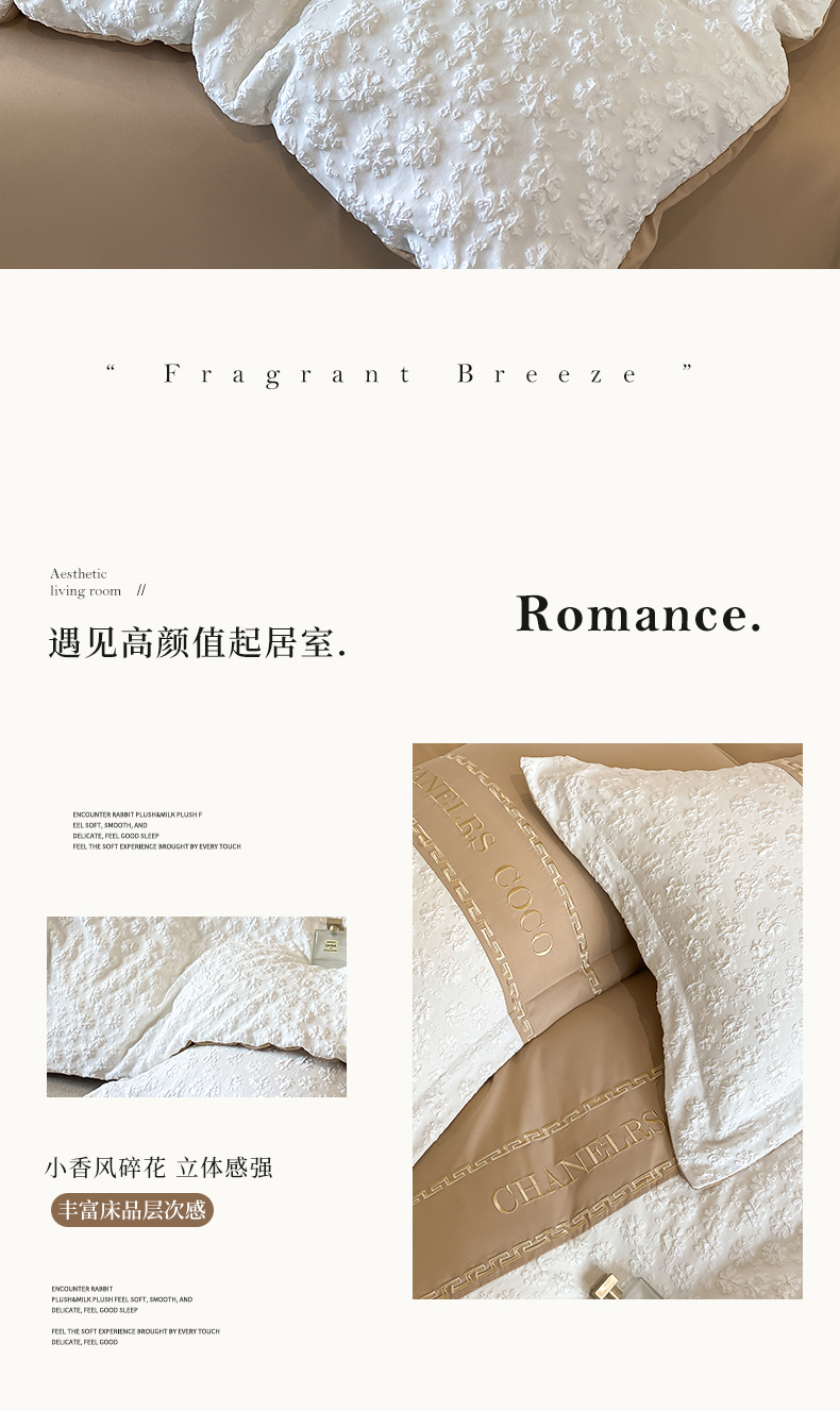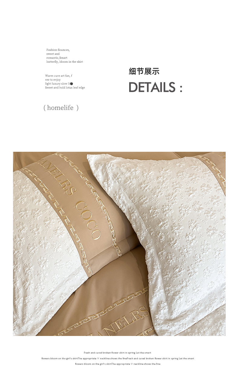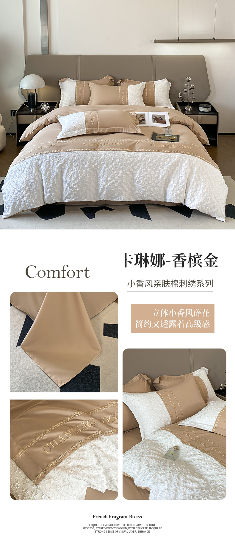 商品名称:苏源家居 2024新款亲肤棉拼接立体浮雕碎花公主风四件套-卡琳娜系列 卡琳娜-香槟金