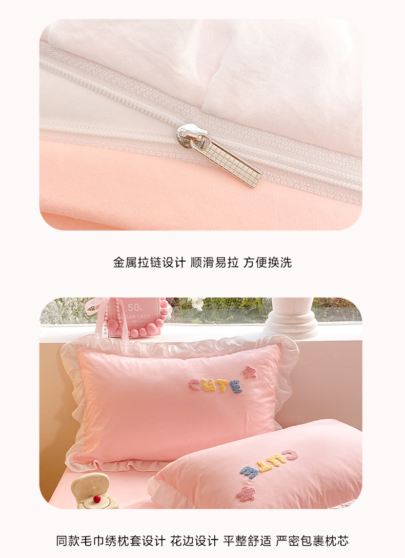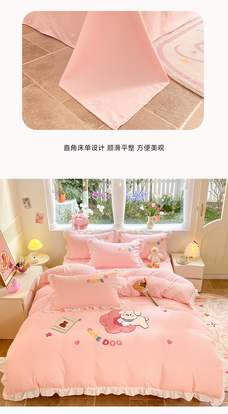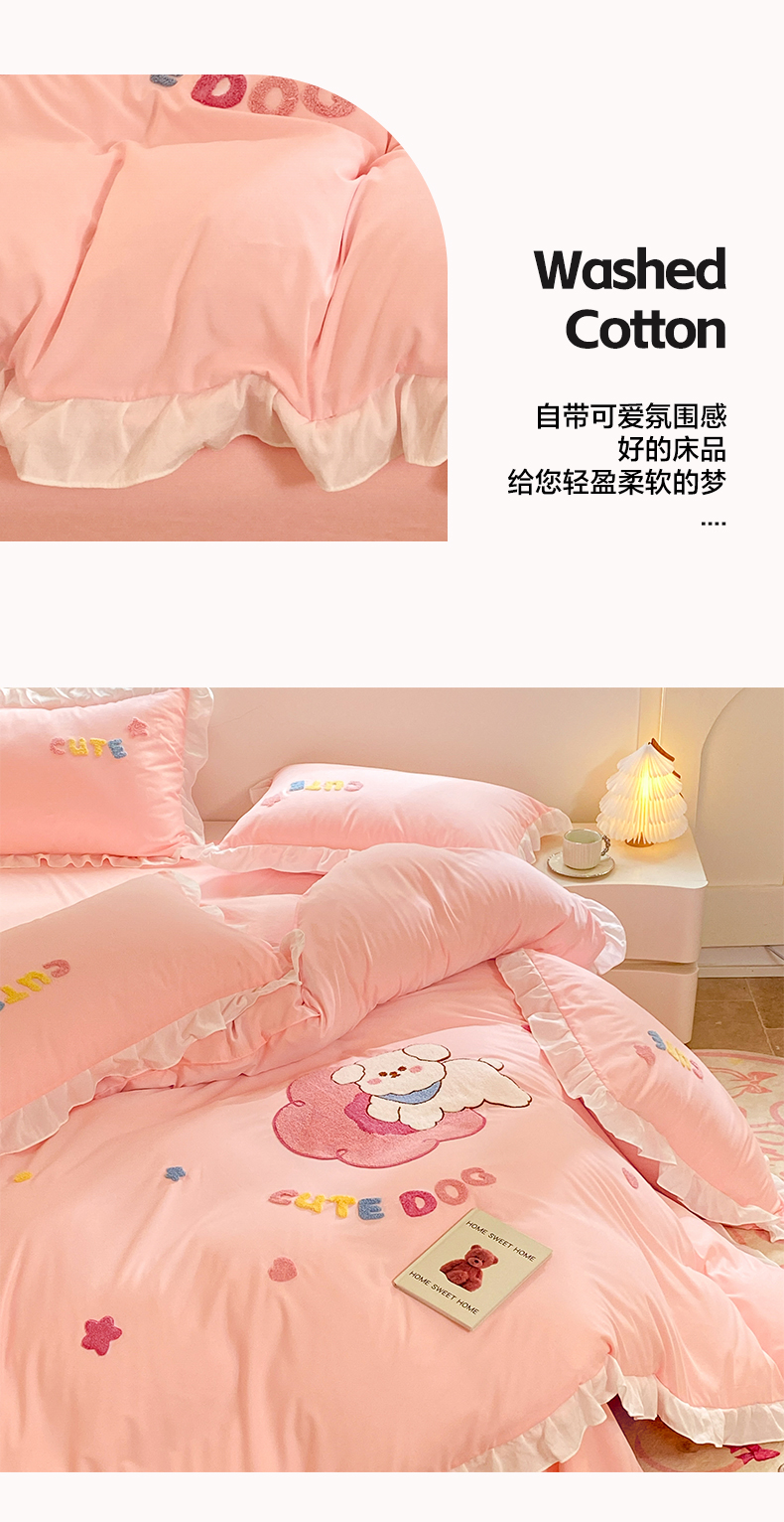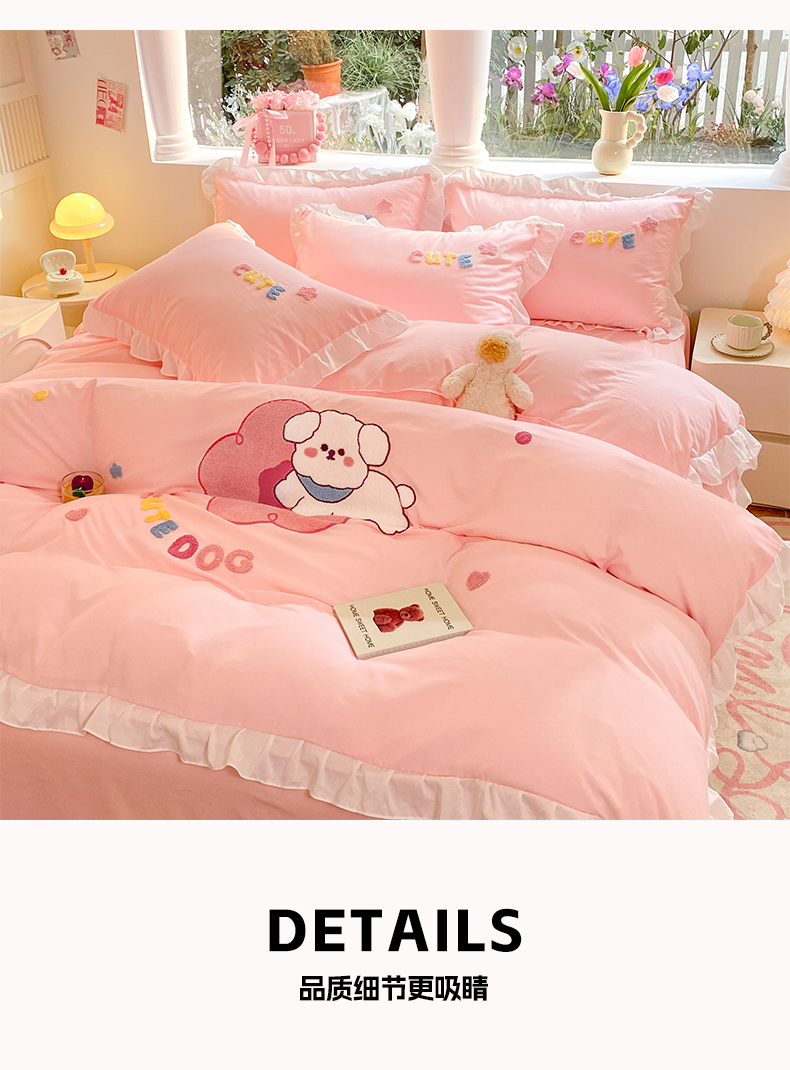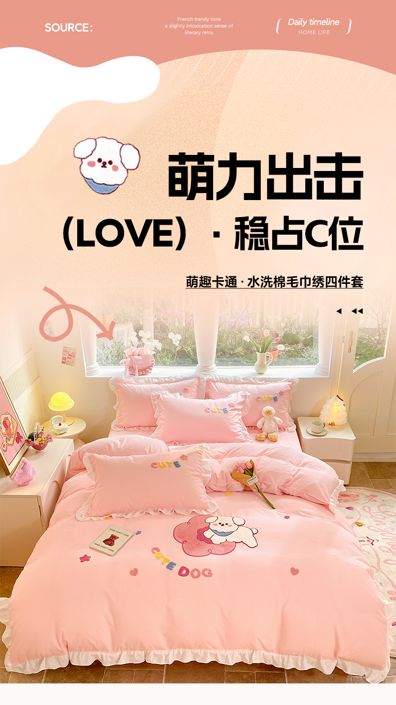 当前位置: 91家纺网 > 商品网购 > 床品套件 > 四件套 > 毛巾绣四件套 > 易禾家纺 2024新款专板花型亲肤水洗棉毛巾绣四件套-跳跳狗 跳跳狗-粉