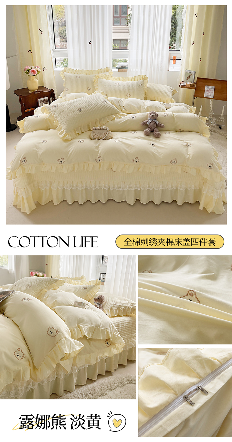 宜凡家纺 2024新款全棉夹棉绣花花边系列床盖四件套 露娜熊 淡黄