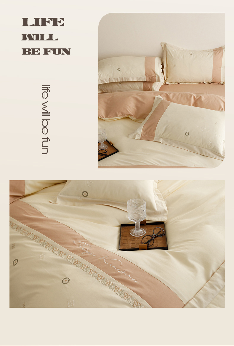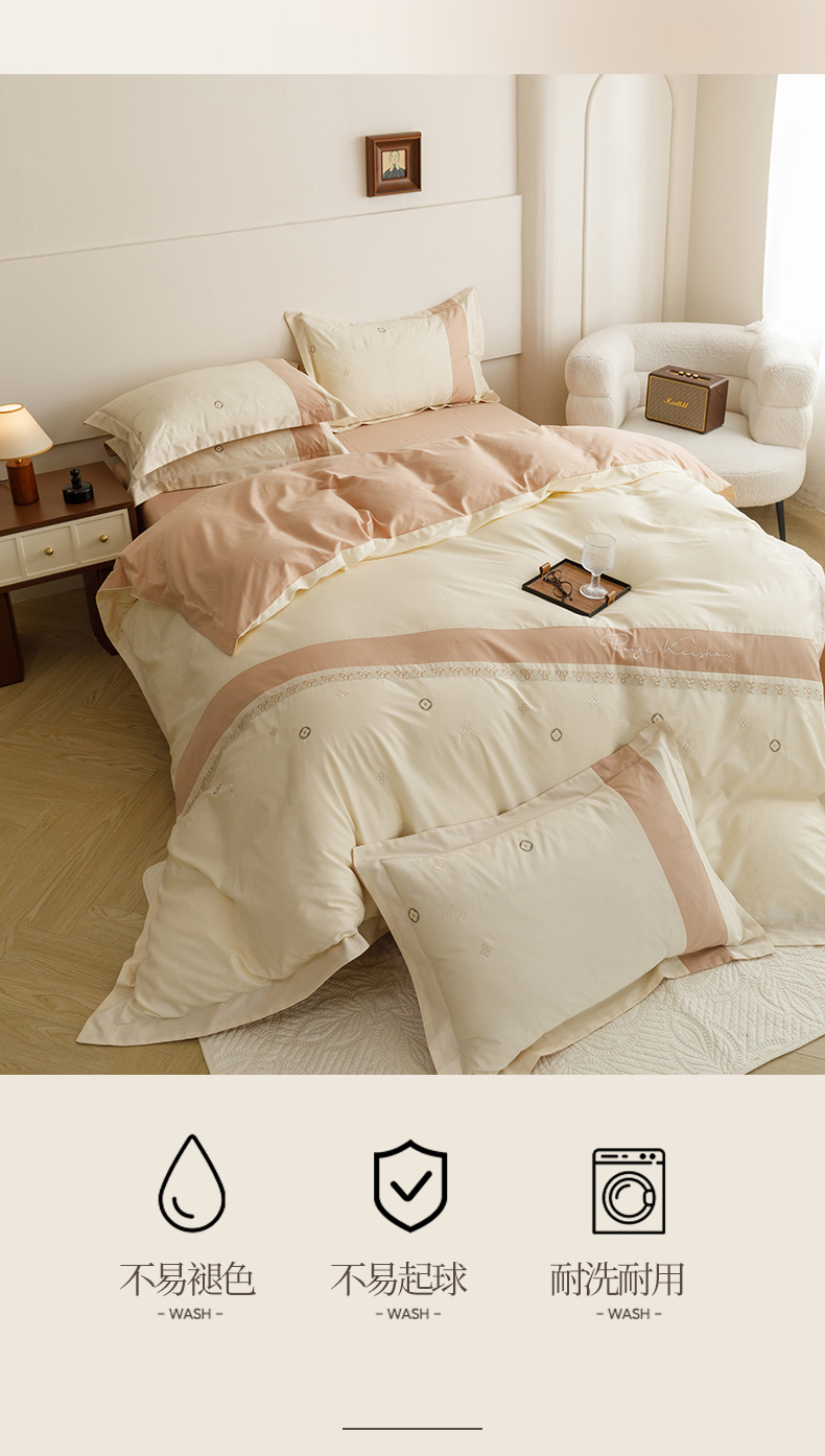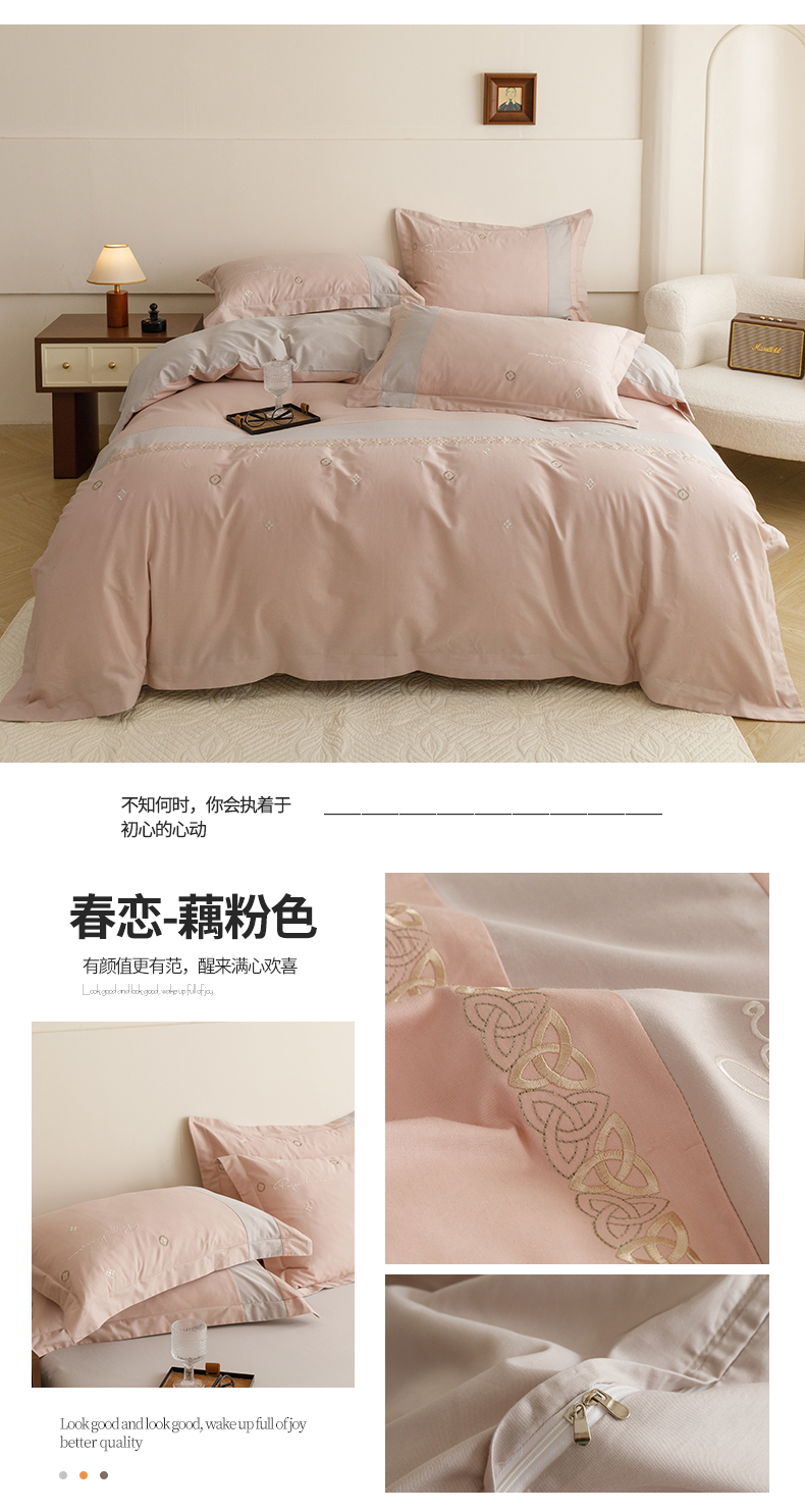 商品名称:(总)艾莱家纺 2024新款A类全棉长绒棉加厚刺绣+宽边+撞色拼接四件套--春恋系列