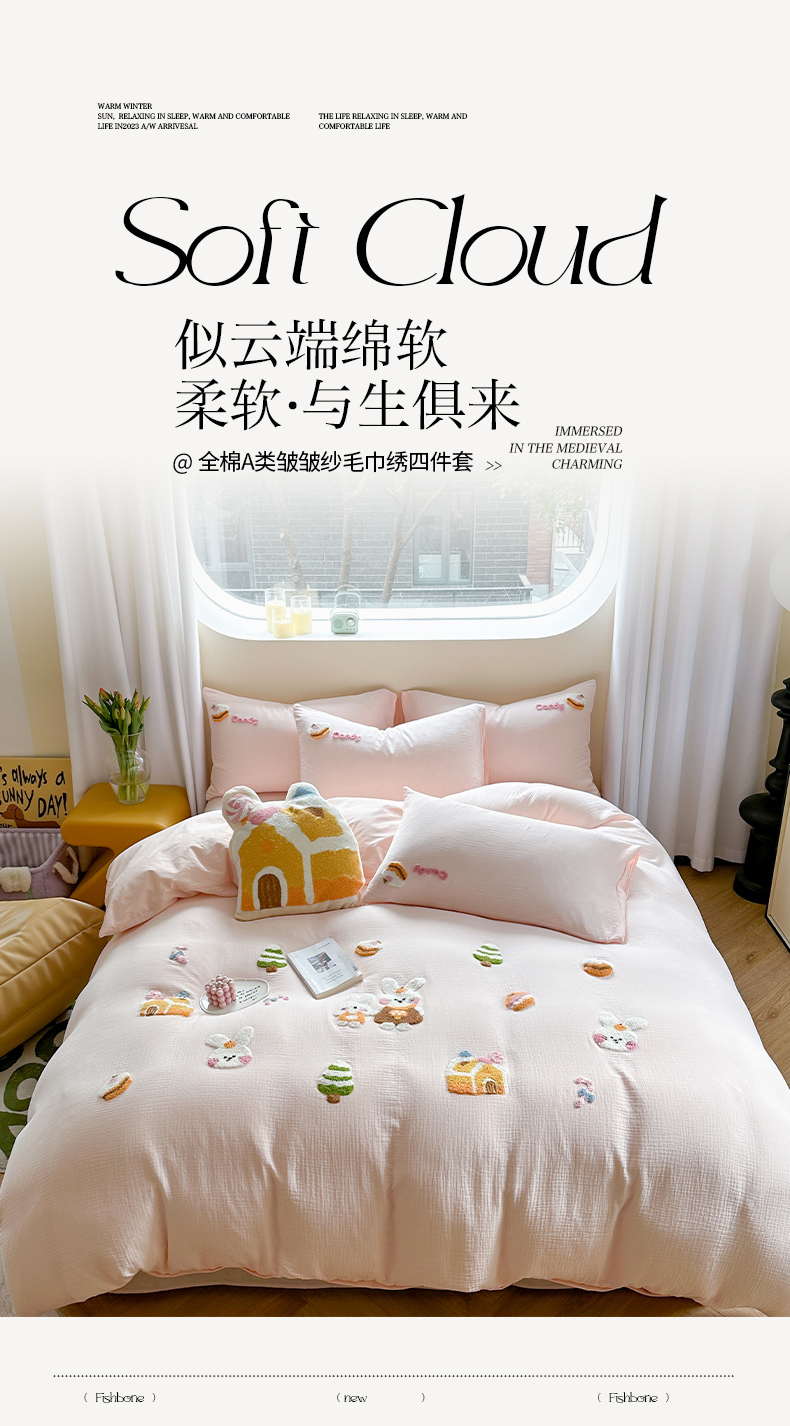 眠屿 2024全棉A类皱皱纱毛巾绣四件套 兔兔糖果屋