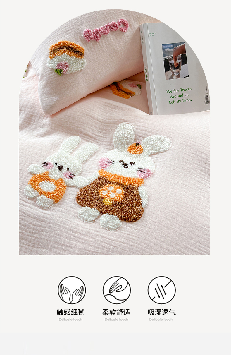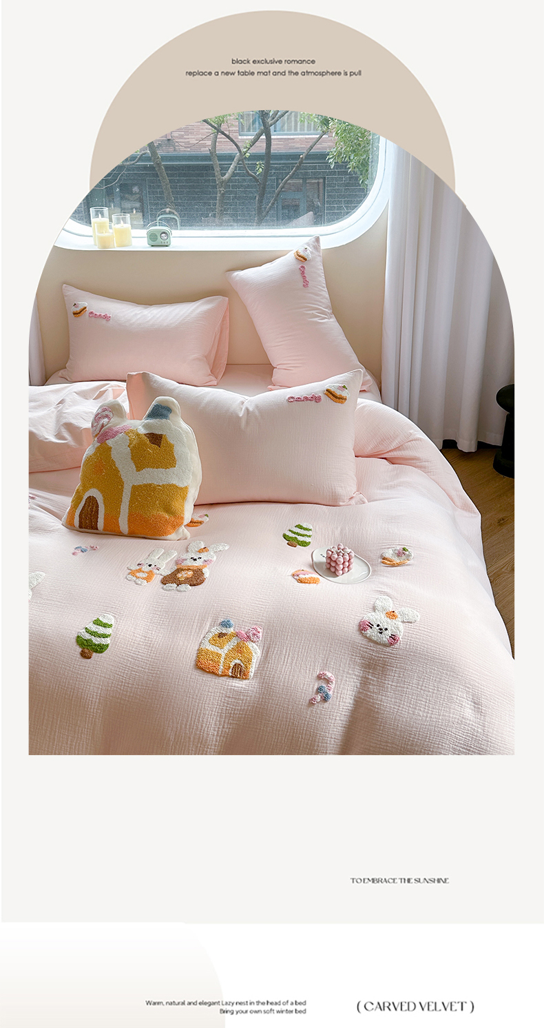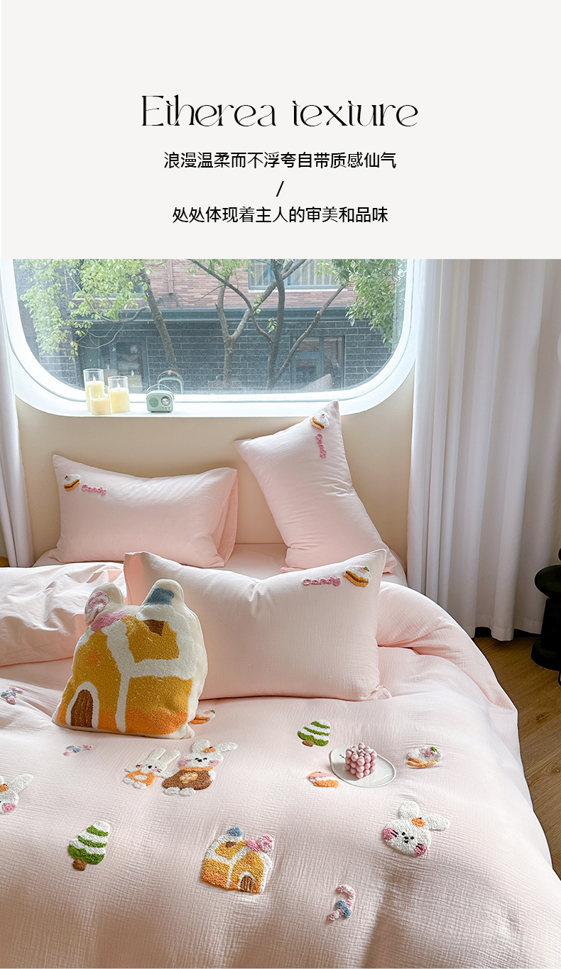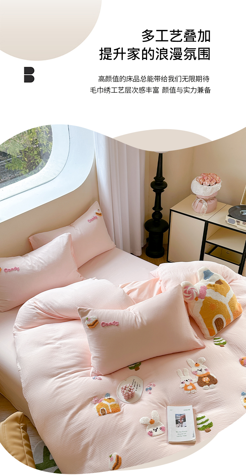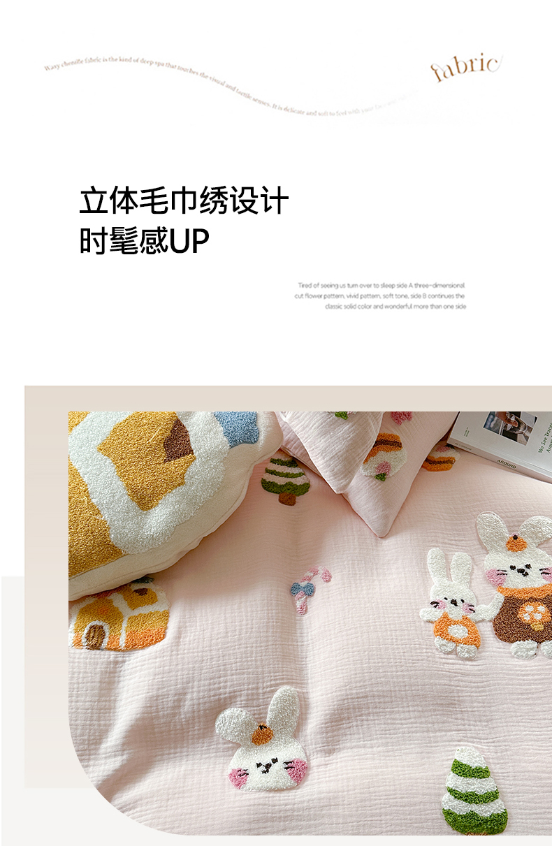 商品名称:眠屿 2024全棉A类皱皱纱毛巾绣四件套 兔兔糖果屋