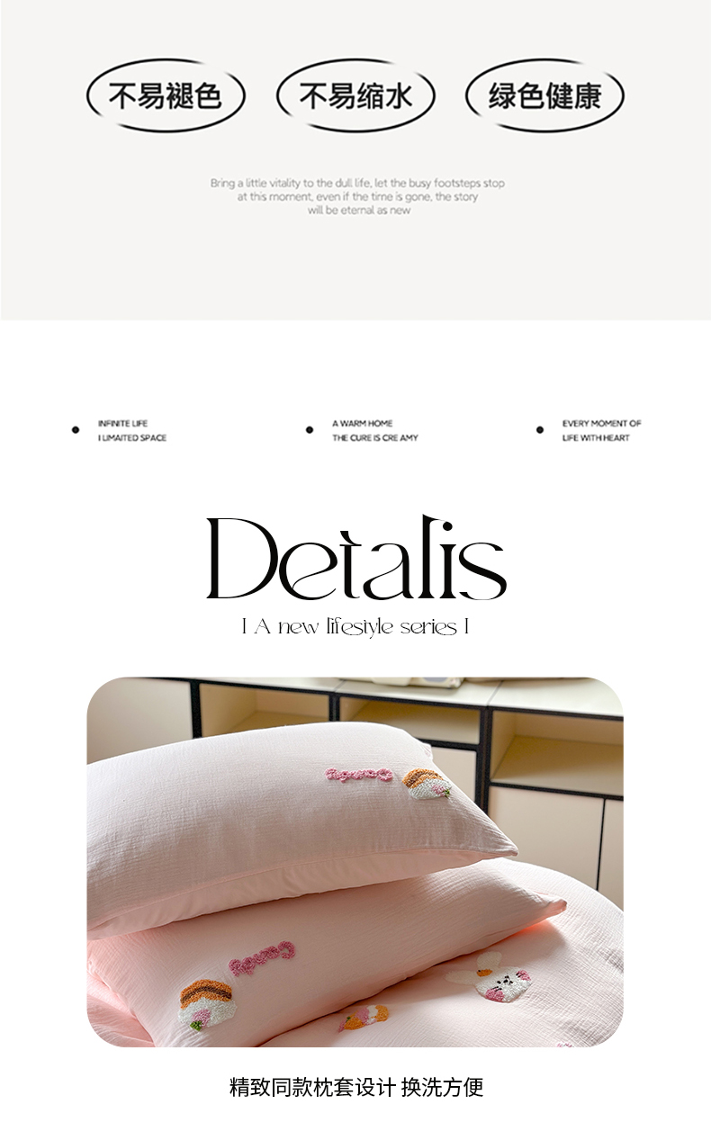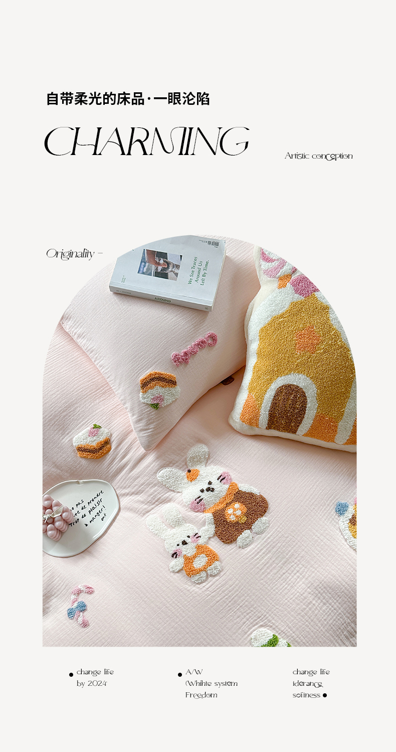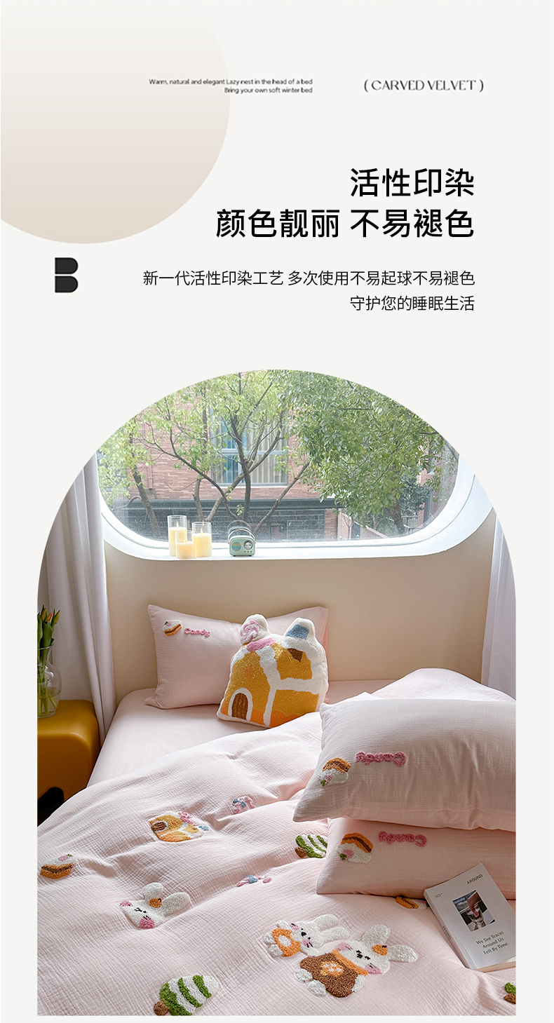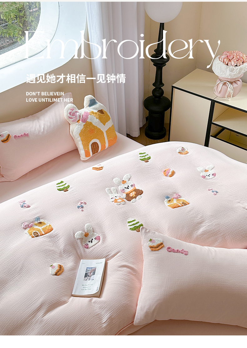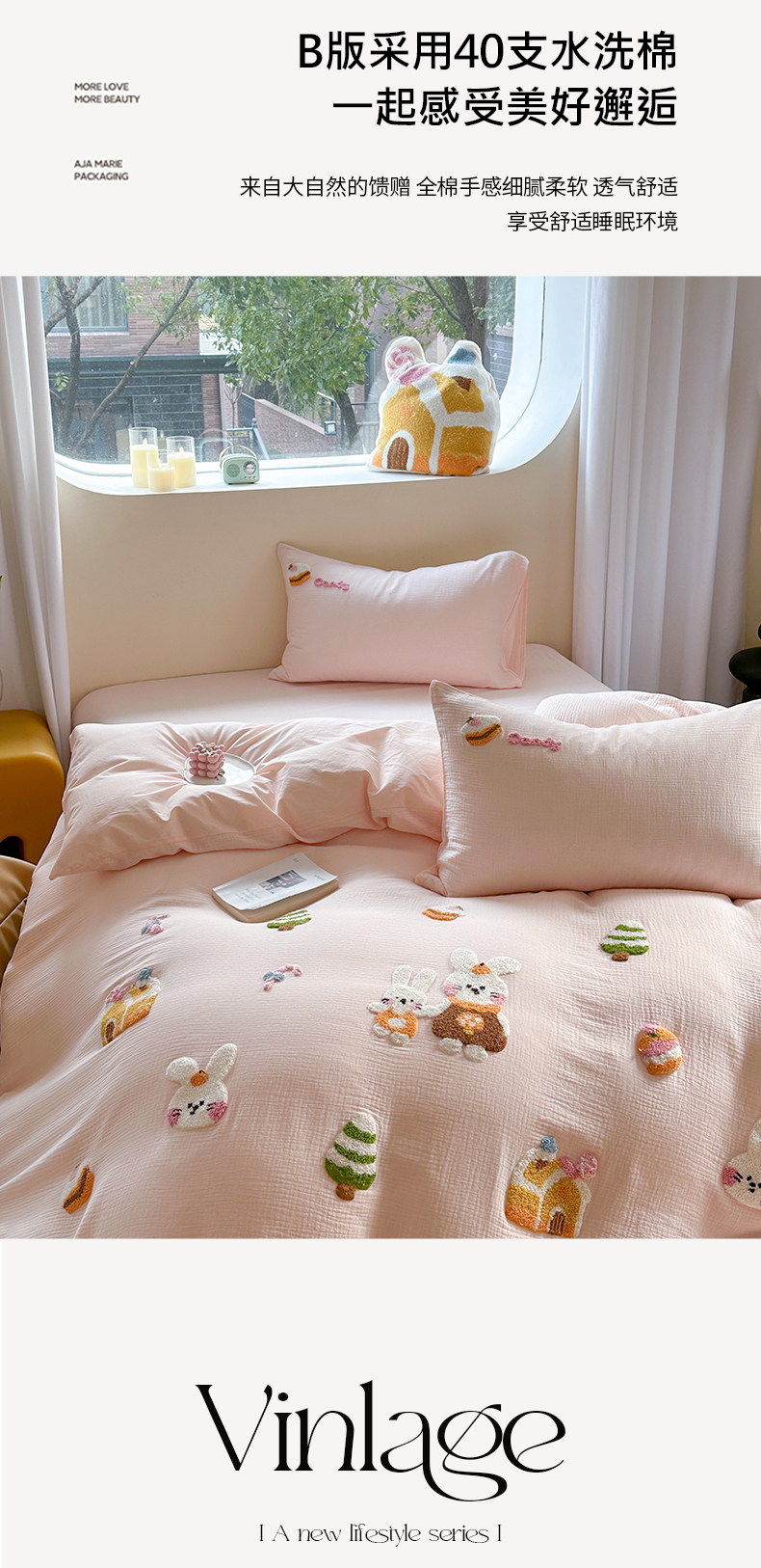 商品名称:眠屿 2024全棉A类皱皱纱毛巾绣四件套 兔兔糖果屋