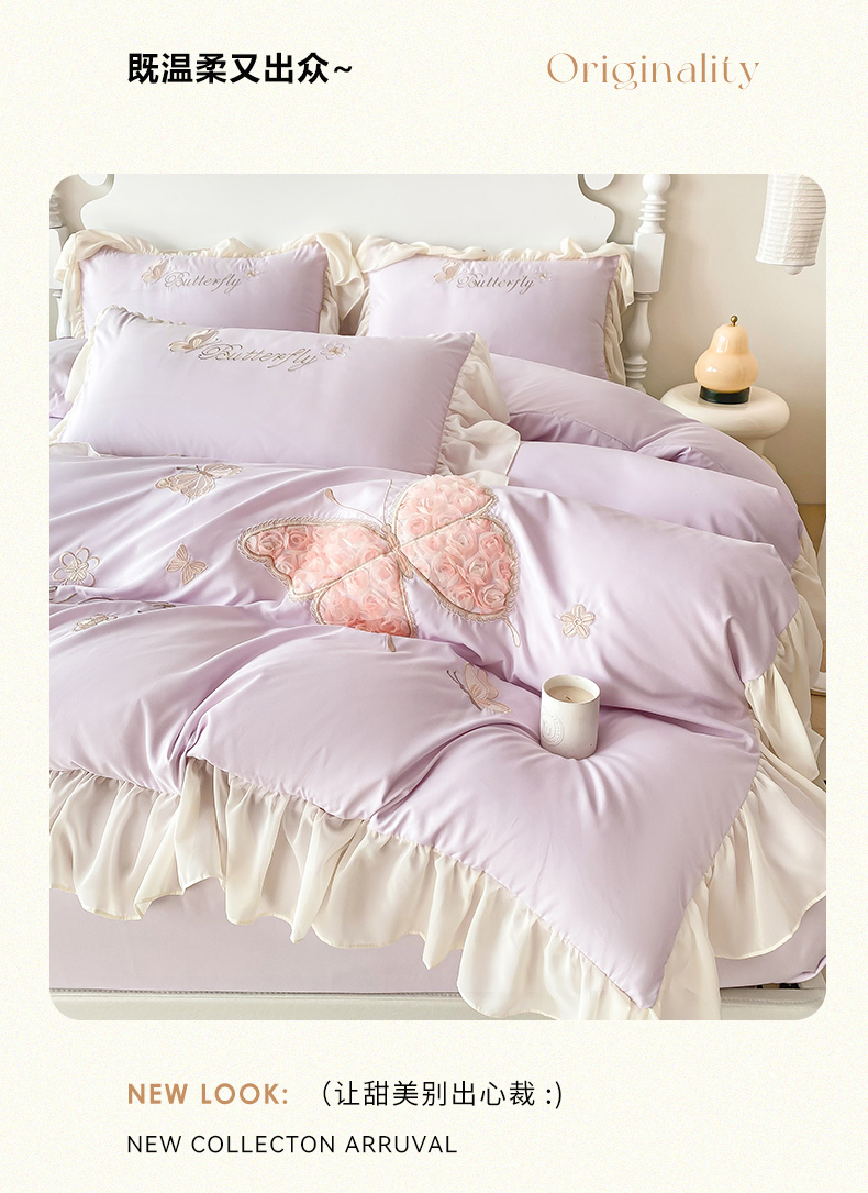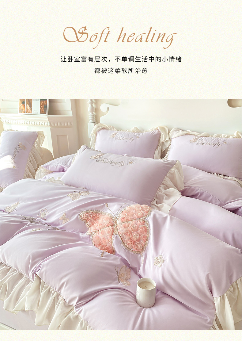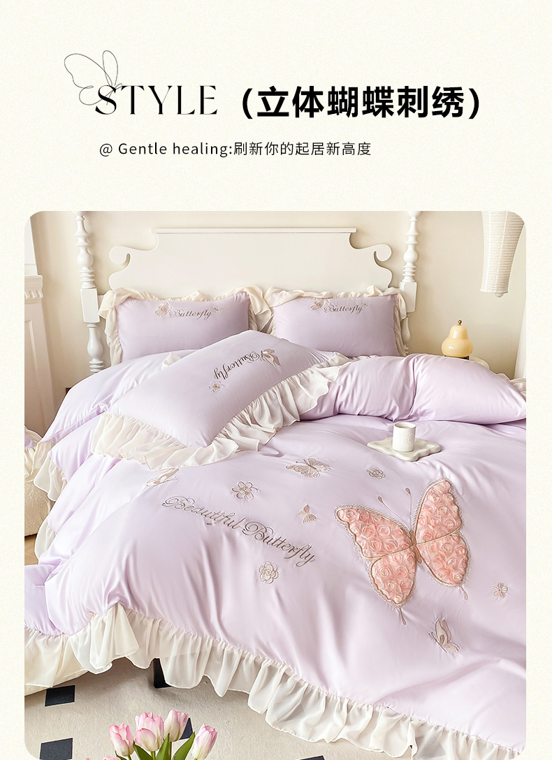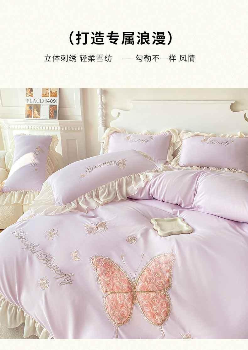 商品名称:富盛 2024新款水洗亲肤棉立体刺绣四件套公主风四件套-蝴蝶系列 蝴蝶-紫