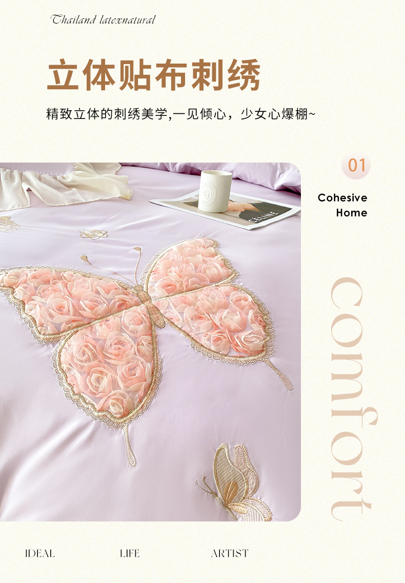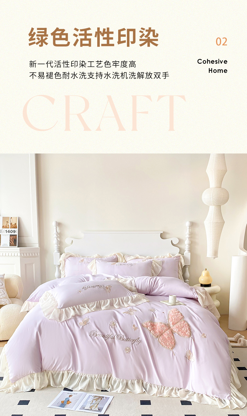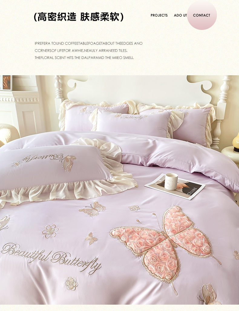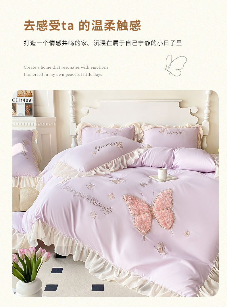 商品名称:富盛 2024新款水洗亲肤棉立体刺绣四件套公主风四件套-蝴蝶系列 蝴蝶-紫