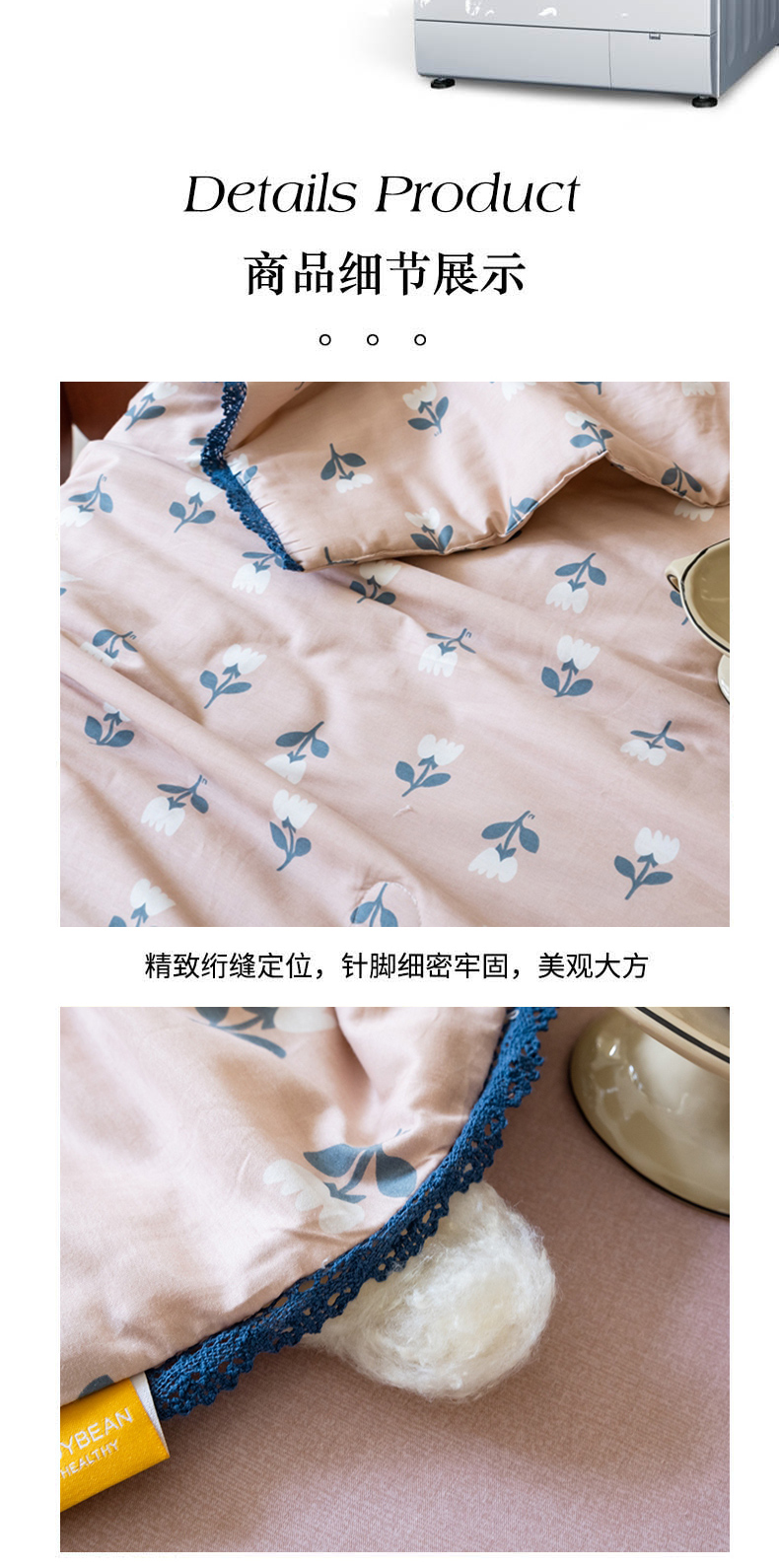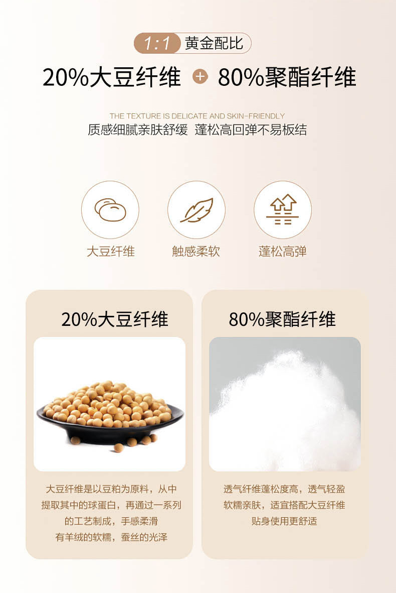• 填充纤维种类: 大豆蛋白改性聚酯纤维