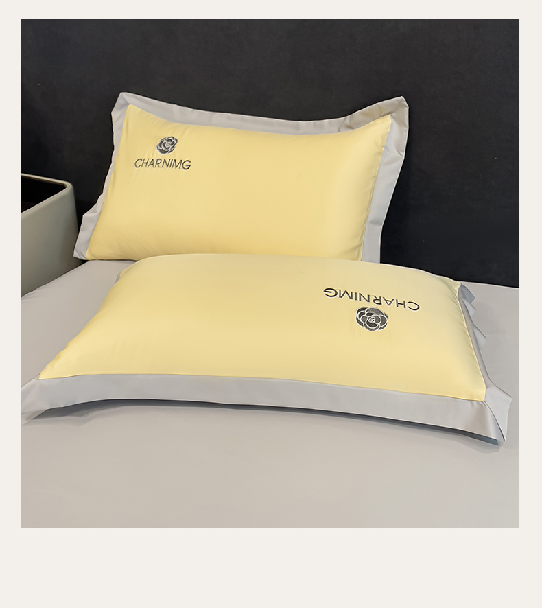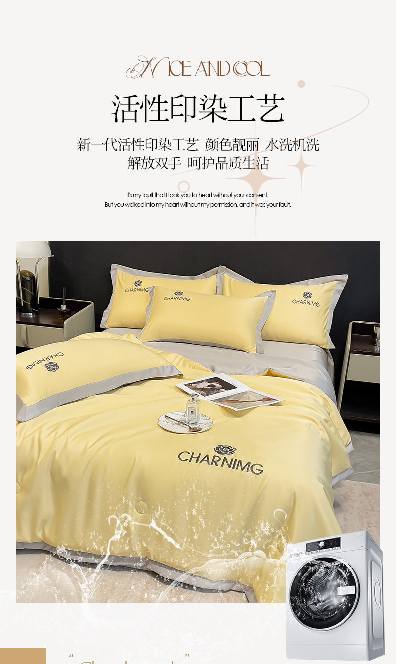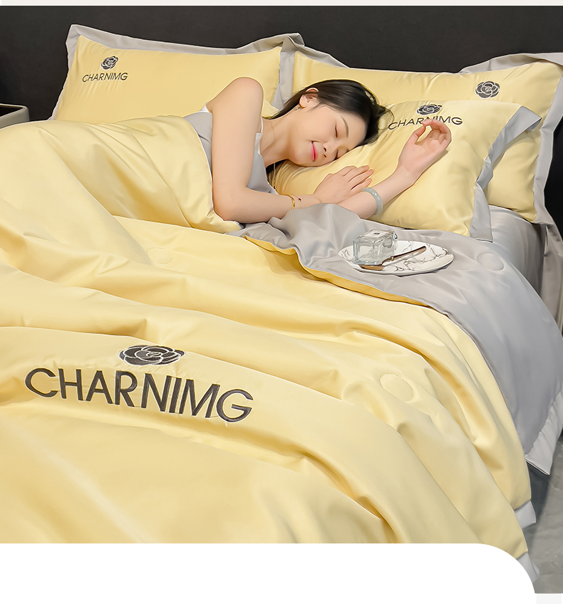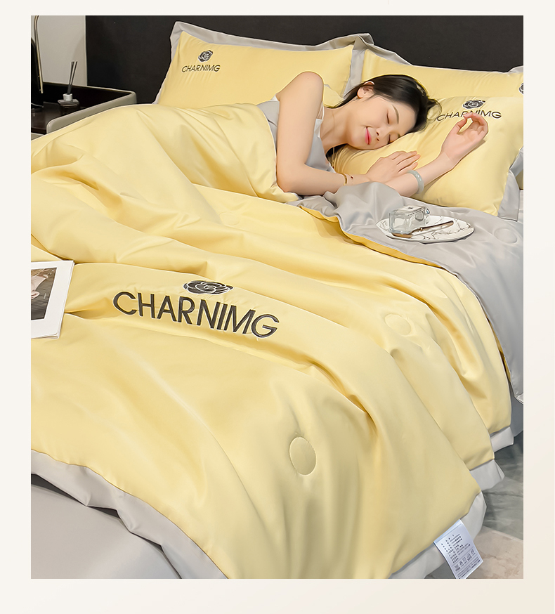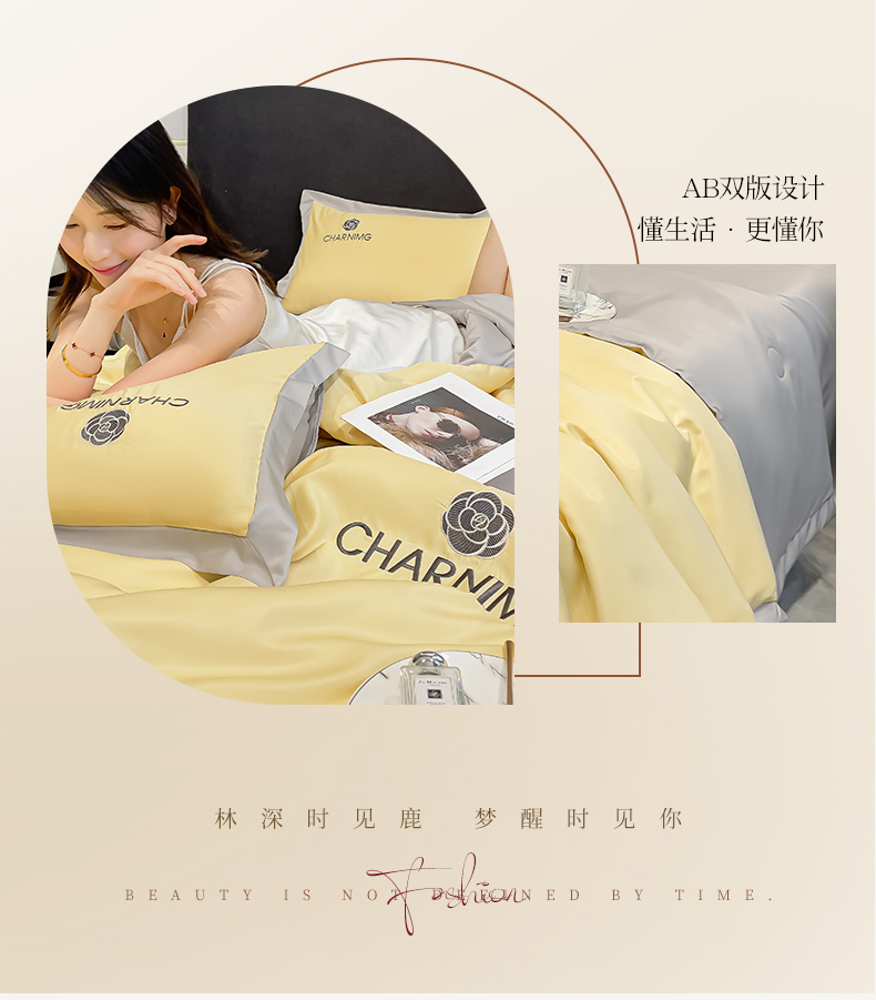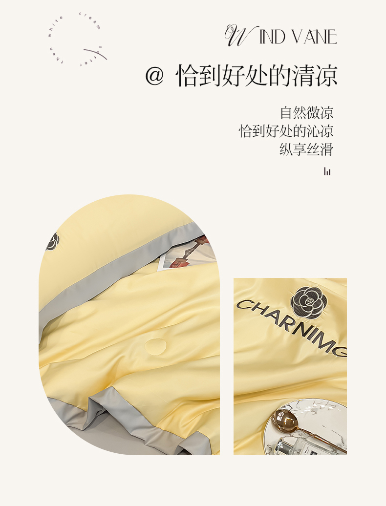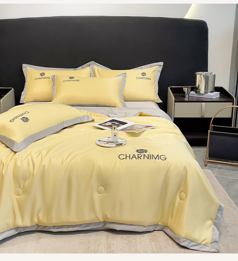 江暮云家纺 2025新款A类水洗真丝刺绣夏被四件套-百丽儿 百丽儿芝士黄-山灰