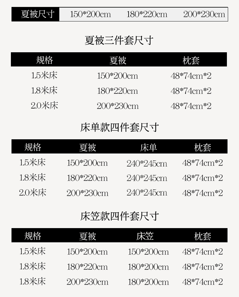 [{"sp_id":1,"sp_name":"\u989c\u8272\u5206\u7c7b","sp_format":2,"sp_list":[{"sp_value_id":4,"sp_value_name":"\u767e\u4e3d\u513f\u829d\u58eb\u9ec4-\u5c71\u7070","sp_value_image":{"id":999,"path":"https:\/\/img3.91jf.com\/ghelp\/2024\/20240401\/5676055f-46ba-4865-b35f-126d331dabf320240401115438864.JPG_30_30.JPG"},"sp_value_video":{"id":0,"img":"","path":"","time":0,"download_num":0,"play_num":0},"price":"40.00","storage":1900,"weight":"1.000","is_check_weight":0,"plus_price":"","sp_sort":11}]},{"sp_id":27,"sp_name":"\u5c3a\u5bf8","sp_format":1,"sp_list":[{"sp_value_id":1443,"sp_value_name":"150x200cm\u5355\u590f\u88ab","sp_value_image":{"id":0,"path":""},"sp_value_video":{"id":0,"img":"","path":"","time":0,"download_num":0,"play_num":0},"price":"40.00","storage":100,"weight":"1.000","is_check_weight":0,"plus_price":"","sp_sort":29},{"sp_value_id":1444,"sp_value_name":"180x220cm\u5355\u590f\u88ab","sp_value_image":{"id":0,"path":""},"sp_value_video":{"id":0,"img":"","path":"","time":0,"download_num":0,"play_num":0},"price":"45.00","storage":100,"weight":"1.200","is_check_weight":0,"plus_price":"","sp_sort":29},{"sp_value_id":1445,"sp_value_name":"200X230cm\u5355\u590f\u88ab","sp_value_image":{"id":0,"path":""},"sp_value_video":{"id":0,"img":"","path":"","time":0,"download_num":0,"play_num":0},"price":"50.00","storage":100,"weight":"1.500","is_check_weight":0,"plus_price":"","sp_sort":29},{"sp_value_id":789,"sp_value_name":"150x200cm\u5e8a\u5355\u4e09\u4ef6\u5957","sp_value_image":{"id":0,"path":""},"sp_value_video":{"id":0,"img":"","path":"","time":0,"download_num":0,"play_num":0},"price":"55.00","storage":100,"weight":"1.600","is_check_weight":0,"plus_price":"","sp_sort":31},{"sp_value_id":790,"sp_value_name":"180x220cm\u5e8a\u5355\u4e09\u4ef6\u5957","sp_value_image":{"id":0,"path":""},"sp_value_video":{"id":0,"img":"","path":"","time":0,"download_num":0,"play_num":0},"price":"60.00","storage":100,"weight":"1.800","is_check_weight":0,"plus_price":"","sp_sort":32},{"sp_value_id":791,"sp_value_name":"200X230cm\u5e8a\u5355\u4e09\u4ef6\u5957","sp_value_image":{"id":0,"path":""},"sp_value_video":{"id":0,"img":"","path":"","time":0,"download_num":0,"play_num":0},"price":"65.00","storage":100,"weight":"2.000","is_check_weight":0,"plus_price":"","sp_sort":33},{"sp_value_id":793,"sp_value_name":"150x200cm\u5e8a\u5355\u56db\u4ef6\u5957","sp_value_image":{"id":0,"path":""},"sp_value_video":{"id":0,"img":"","path":"","time":0,"download_num":0,"play_num":0},"price":"70.00","storage":100,"weight":"2.000","is_check_weight":0,"plus_price":"","sp_sort":35},{"sp_value_id":794,"sp_value_name":"180x220cm\u5e8a\u5355\u56db\u4ef6\u5957","sp_value_image":{"id":0,"path":""},"sp_value_video":{"id":0,"img":"","path":"","time":0,"download_num":0,"play_num":0},"price":"75.00","storage":100,"weight":"2.200","is_check_weight":0,"plus_price":"","sp_sort":36},{"sp_value_id":821,"sp_value_name":"200X230cm\u5e8a\u5355\u56db\u4ef6\u5957","sp_value_image":{"id":0,"path":""},"sp_value_video":{"id":0,"img":"","path":"","time":0,"download_num":0,"play_num":0},"price":"80.00","storage":100,"weight":"2.400","is_check_weight":0,"plus_price":"","sp_sort":37},{"sp_value_id":823,"sp_value_name":"1.5m\u5355\u88ab1.5m\u5e8a\u7b20\u56db\u4ef6\u5957","sp_value_image":{"id":0,"path":""},"sp_value_video":{"id":0,"img":"","path":"","time":0,"download_num":0,"play_num":0},"price":"78.00","storage":100,"weight":"2.200","is_check_weight":0,"plus_price":"","sp_sort":39},{"sp_value_id":855,"sp_value_name":"1.5m\u5355\u88ab1.8m\u5e8a\u7b20\u56db\u4ef6\u5957","sp_value_image":{"id":0,"path":""},"sp_value_video":{"id":0,"img":"","path":"","time":0,"download_num":0,"play_num":0},"price":"80.00","storage":100,"weight":"2.200","is_check_weight":0,"plus_price":"","sp_sort":40},{"sp_value_id":858,"sp_value_name":"1.8m\u5355\u88ab1.5m\u5e8a\u7b20\u56db\u4ef6\u5957","sp_value_image":{"id":0,"path":""},"sp_value_video":{"id":0,"img":"","path":"","time":0,"download_num":0,"play_num":0},"price":"83.00","storage":100,"weight":"2.400","is_check_weight":0,"plus_price":"","sp_sort":43},{"sp_value_id":876,"sp_value_name":"1.8m\u5355\u88ab1.8m\u5e8a\u7b20\u56db\u4ef6\u5957","sp_value_image":{"id":0,"path":""},"sp_value_video":{"id":0,"img":"","path":"","time":0,"download_num":0,"play_num":0},"price":"85.00","storage":100,"weight":"2.400","is_check_weight":0,"plus_price":"","sp_sort":44},{"sp_value_id":879,"sp_value_name":"2.0m\u5355\u88ab1.5m\u5e8a\u7b20\u56db\u4ef6\u5957","sp_value_image":{"id":0,"path":""},"sp_value_video":{"id":0,"img":"","path":"","time":0,"download_num":0,"play_num":0},"price":"90.00","storage":100,"weight":"2.600","is_check_weight":0,"plus_price":"","sp_sort":47},{"sp_value_id":880,"sp_value_name":"2.0m\u5355\u88ab1.8m\u5e8a\u7b20\u56db\u4ef6\u5957","sp_value_image":{"id":0,"path":""},"sp_value_video":{"id":0,"img":"","path":"","time":0,"download_num":0,"play_num":0},"price":"90.00","storage":100,"weight":"2.600","is_check_weight":0,"plus_price":"","sp_sort":48},{"sp_value_id":883,"sp_value_name":"\u5355\u6795\u5957","sp_value_image":{"id":0,"path":""},"sp_value_video":{"id":0,"img":"","path":"","time":0,"download_num":0,"play_num":0},"price":"18.00","storage":100,"weight":"0.200","is_check_weight":0,"plus_price":"","sp_sort":51},{"sp_value_id":887,"sp_value_name":"240x245cm\u5355\u5e8a\u5355","sp_value_image":{"id":0,"path":""},"sp_value_video":{"id":0,"img":"","path":"","time":0,"download_num":0,"play_num":0},"price":"16.00","storage":100,"weight":"0.400","is_check_weight":0,"plus_price":"","sp_sort":55},{"sp_value_id":891,"sp_value_name":"150x200cm\u5e8a\u7b20","sp_value_image":{"id":0,"path":""},"sp_value_video":{"id":0,"img":"","path":"","time":0,"download_num":0,"play_num":0},"price":"20.00","storage":100,"weight":"0.800","is_check_weight":0,"plus_price":"","sp_sort":59},{"sp_value_id":895,"sp_value_name":"180x200cm\u5e8a\u7b20","sp_value_image":{"id":0,"path":""},"sp_value_video":{"id":0,"img":"","path":"","time":0,"download_num":0,"pl