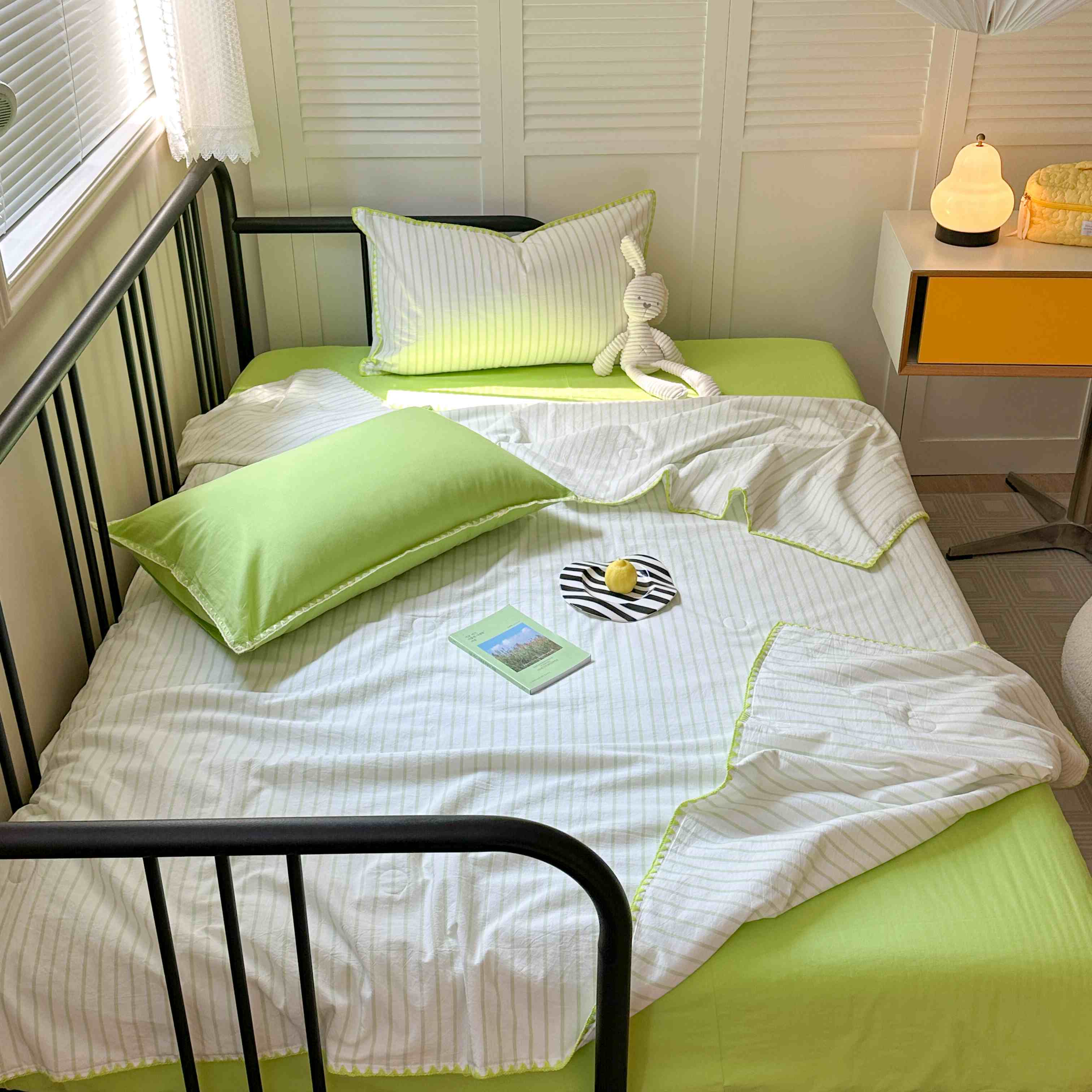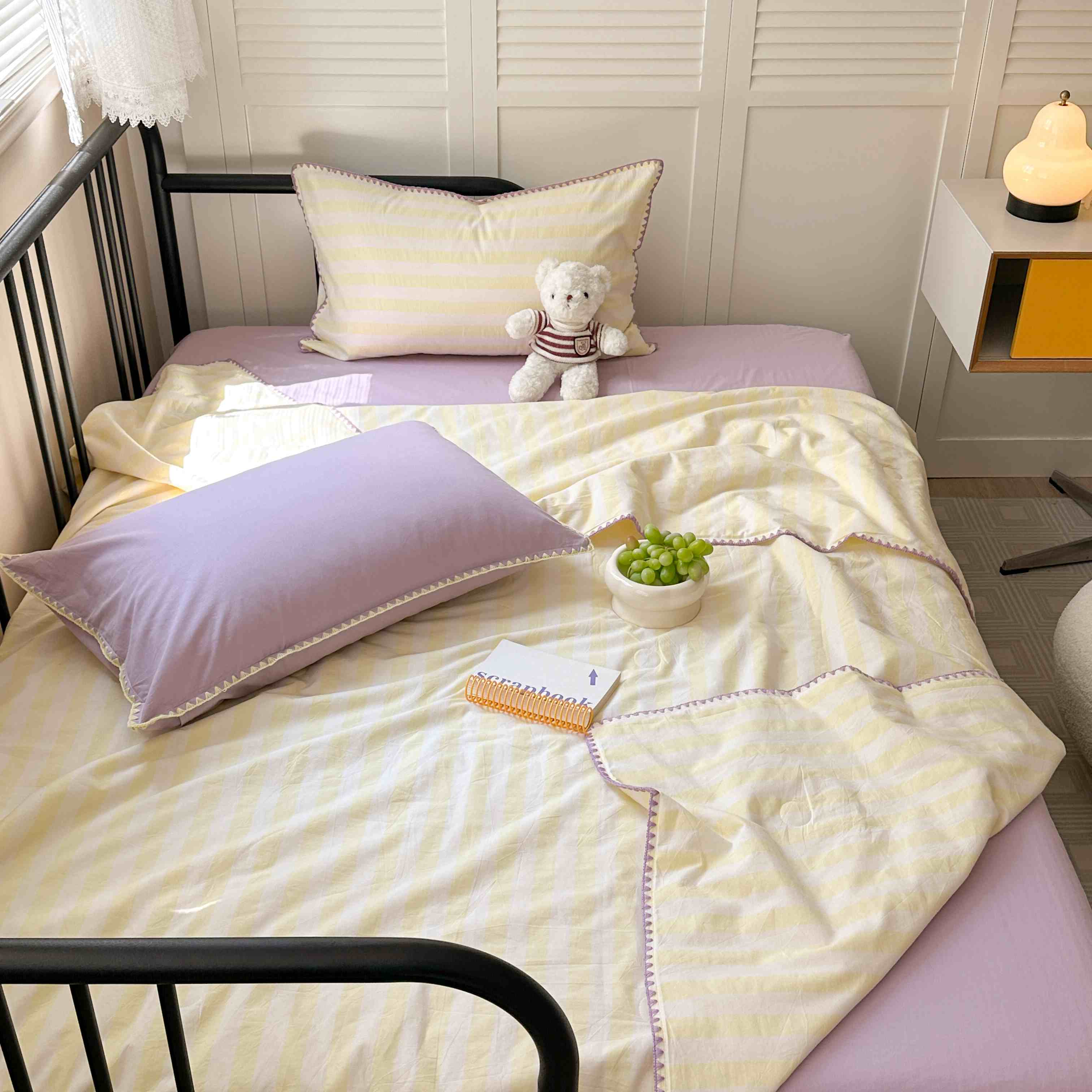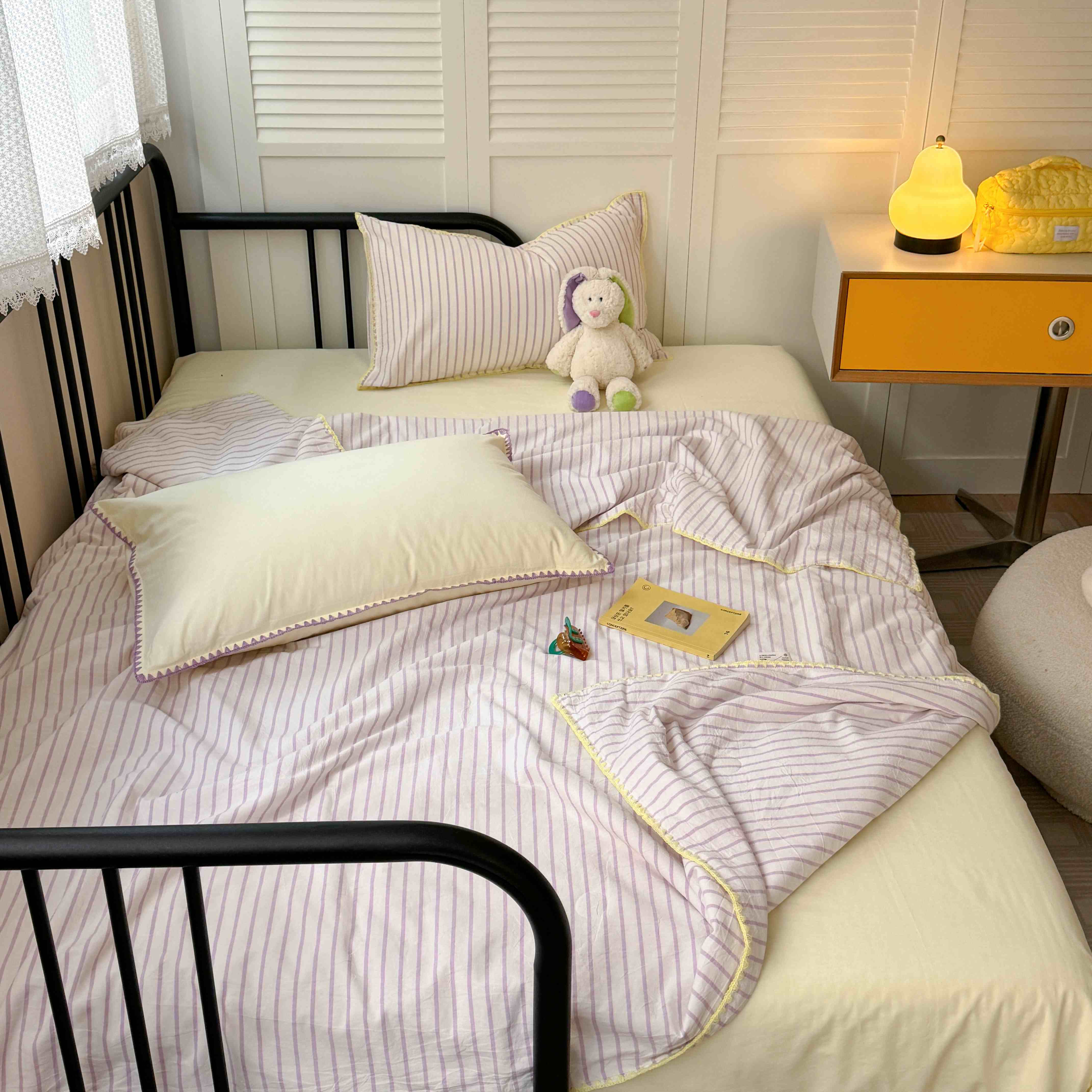 柚子 2024新款三角针条纹全棉水洗棉夏被四件套 问夏 黄条