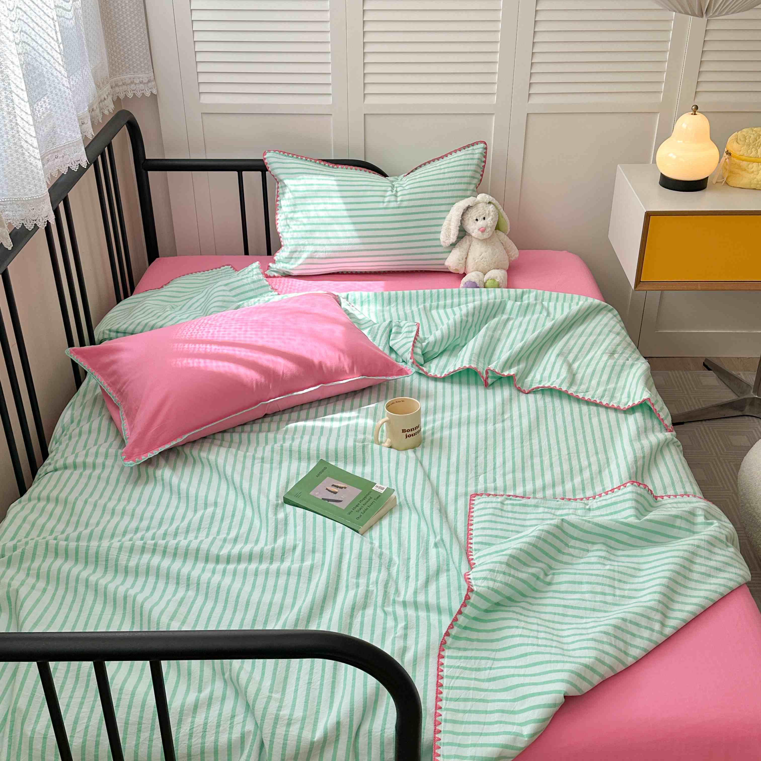 (总)柚子YOUTH 225新款全棉双层纱球球款四件套,薄荷绿条,波点霉霉,波点小丑,蓝心,芊芊结,碎花点点