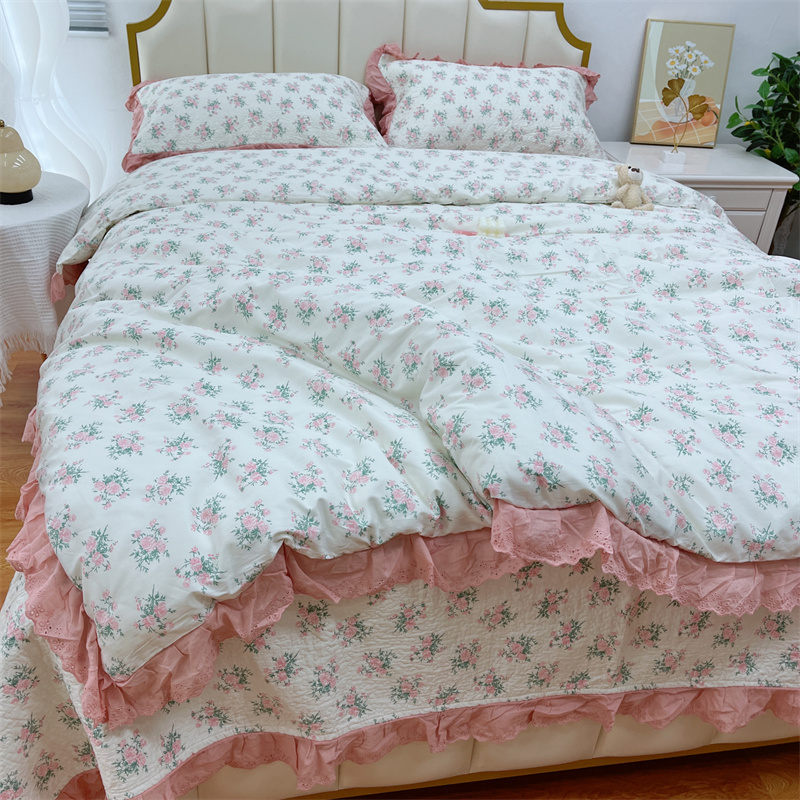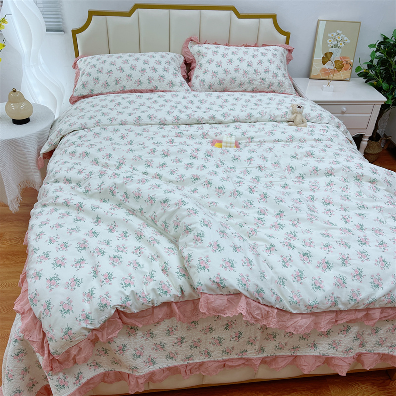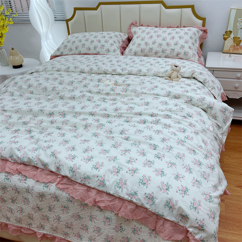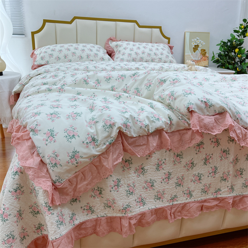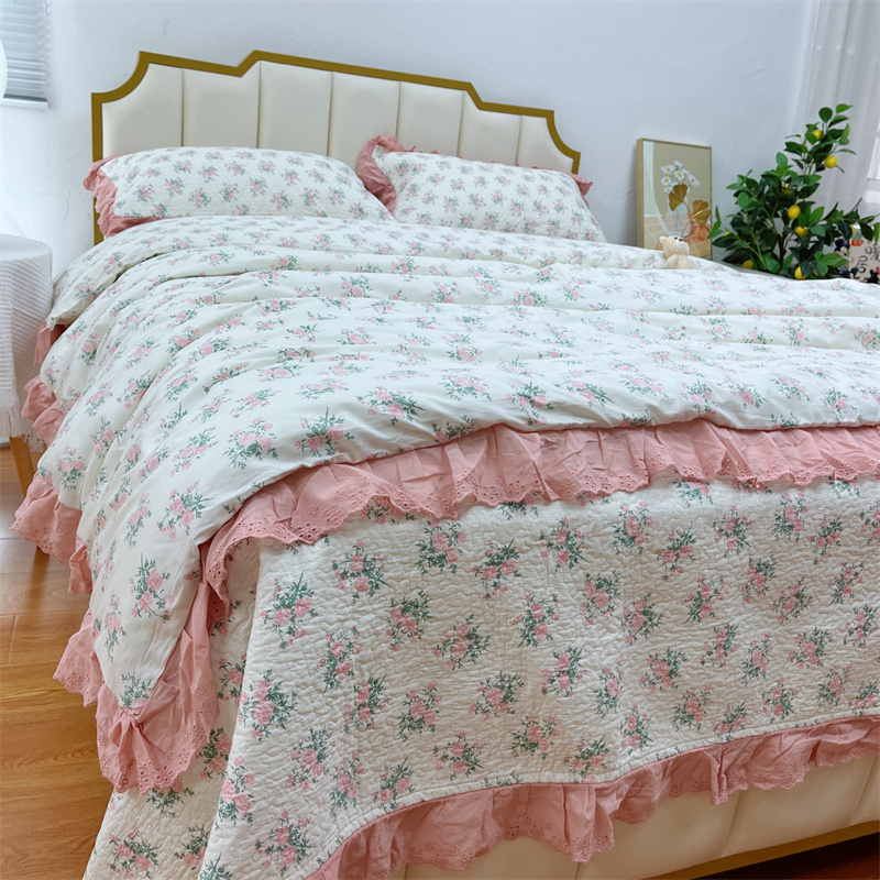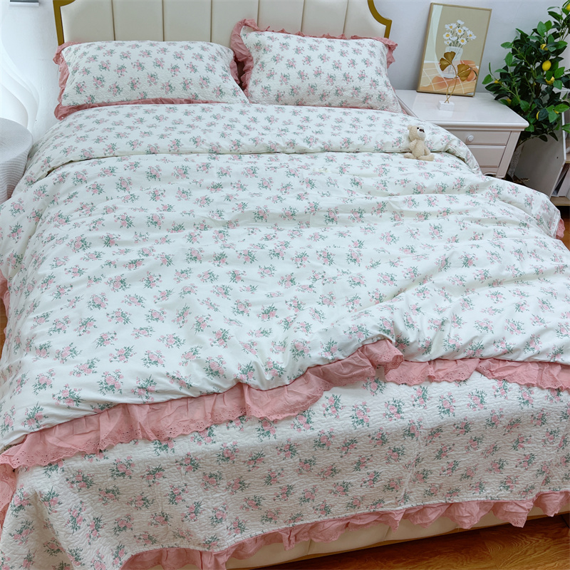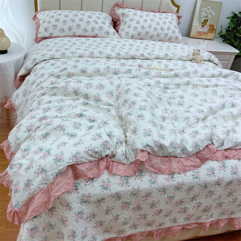 暖居 2024新款砂洗棉花被套全棉床盖四件套绗缝夹棉纯棉床盖三件套茉莉