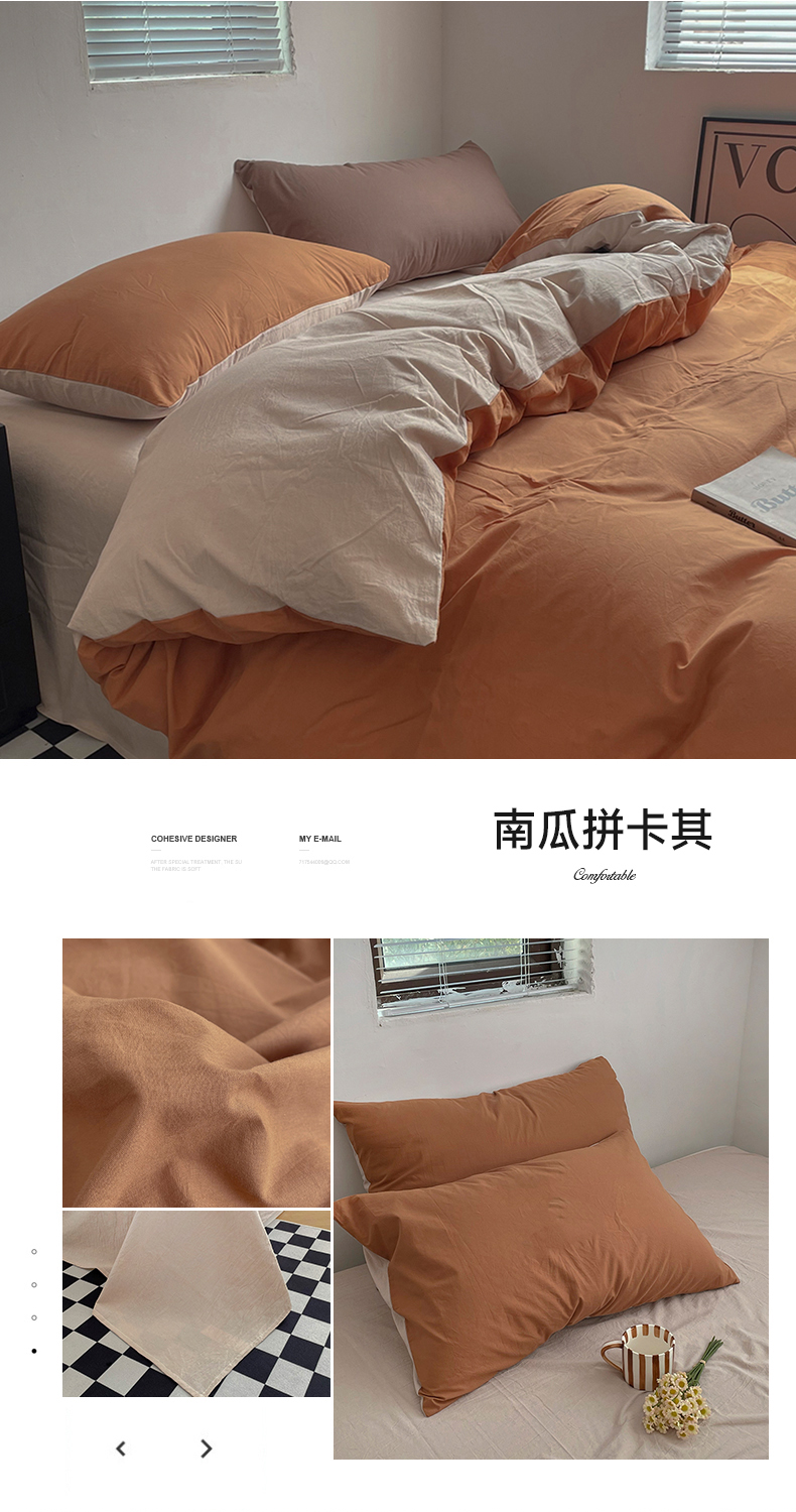 当前位置: 91家纺网 > 商品网购 > 床品套件 > 四件套 > 全棉普通四件套 > 2024新款A类全棉纯棉纯色双拼色织水洗棉四件套 南瓜拼卡其