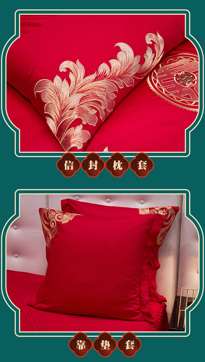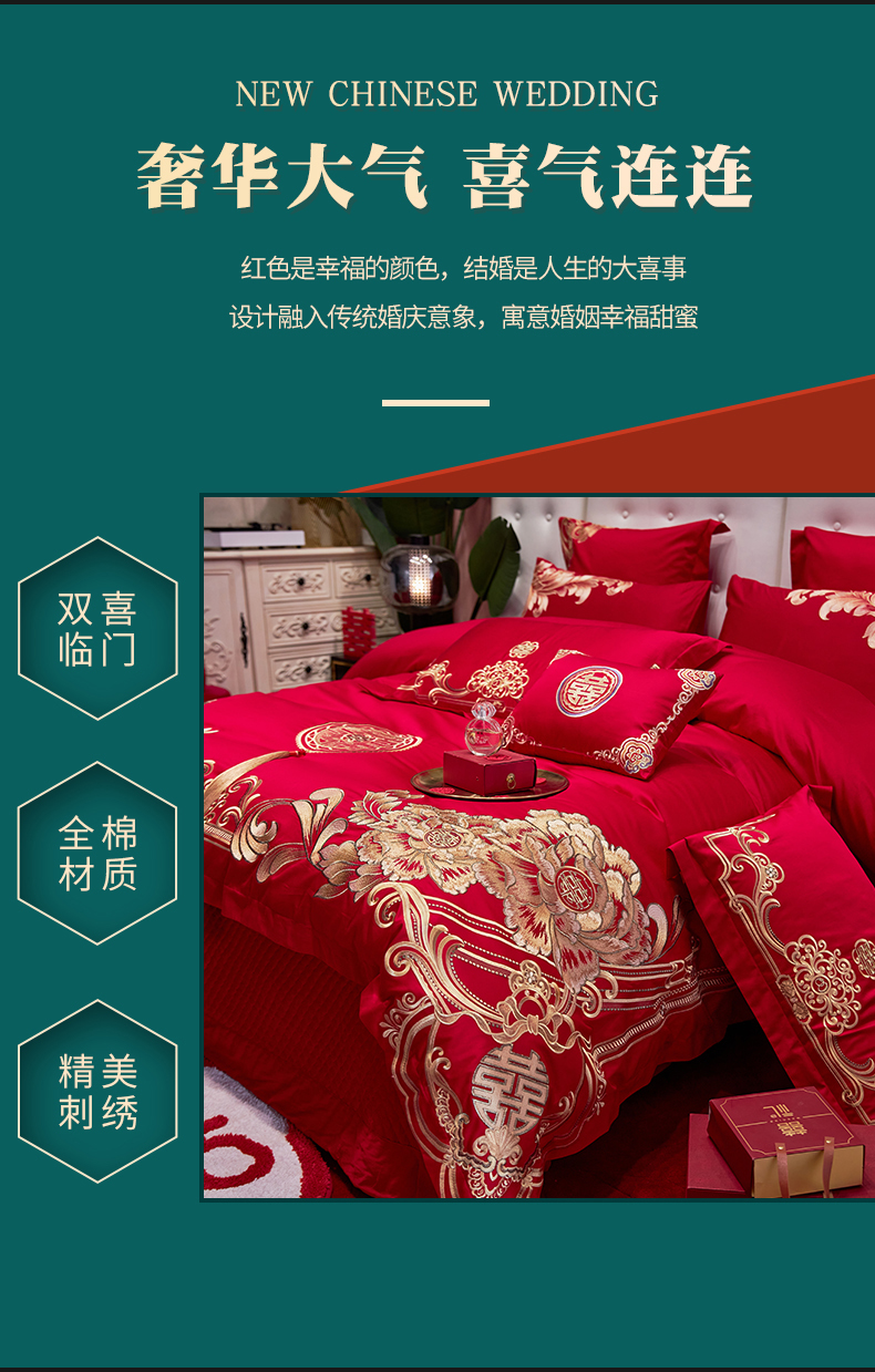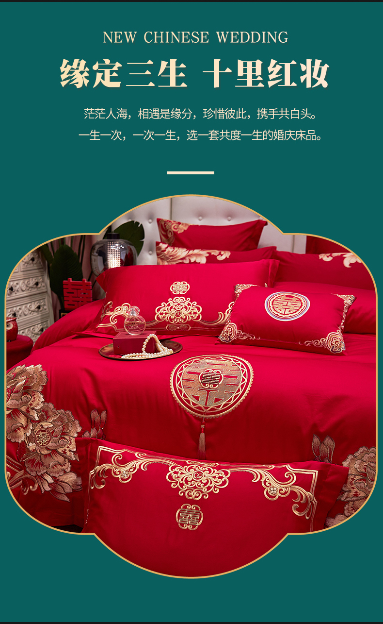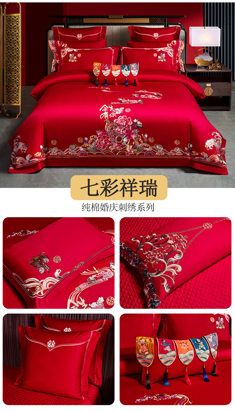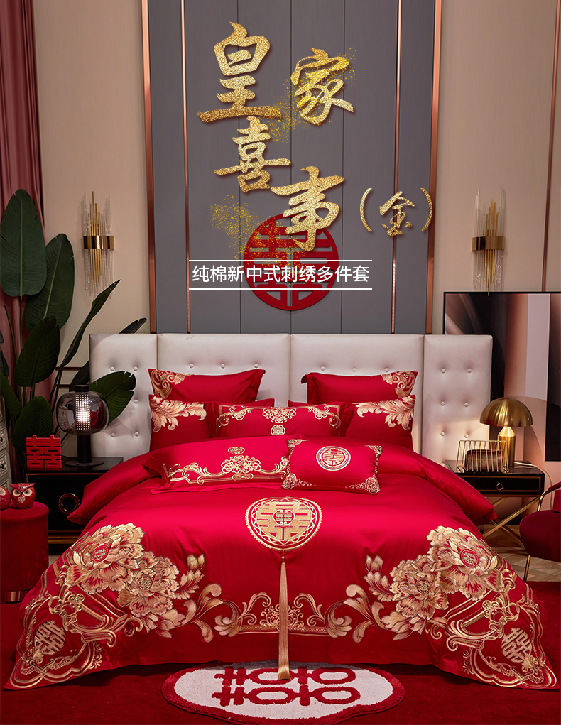 当前位置: 91家纺网 > 商品网购 > 床品套件 > 四件套 > 婚庆四件套 > 宏羽纺家纺 2024新款13372纯棉婚庆套件系列 皇家喜事-金-时尚
