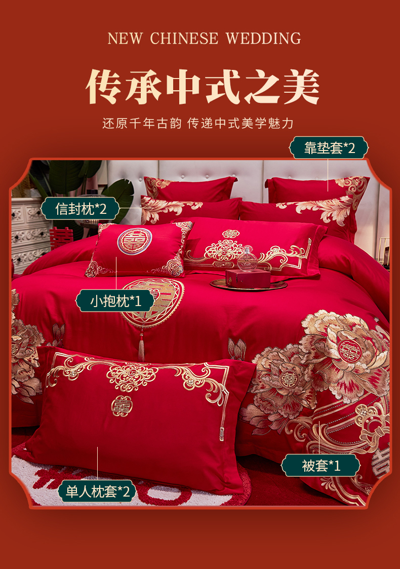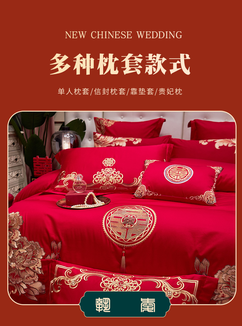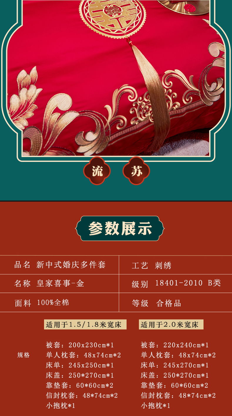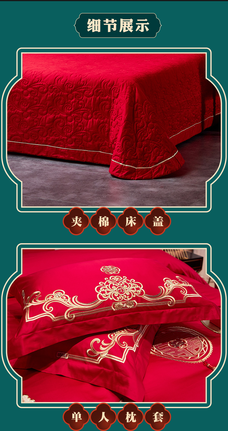 当前位置: 91家纺网 > 商品网购 > 床品套件 > 四件套 > 婚庆四件套 > 宏羽纺家纺 2024新款13372纯棉婚庆套件系列 皇家喜事-金-时尚