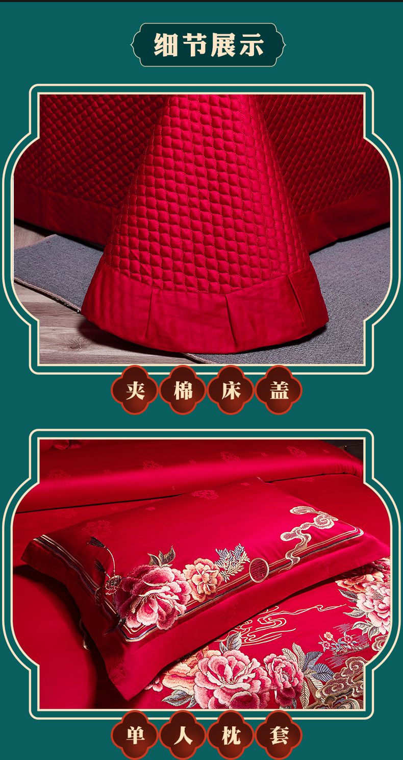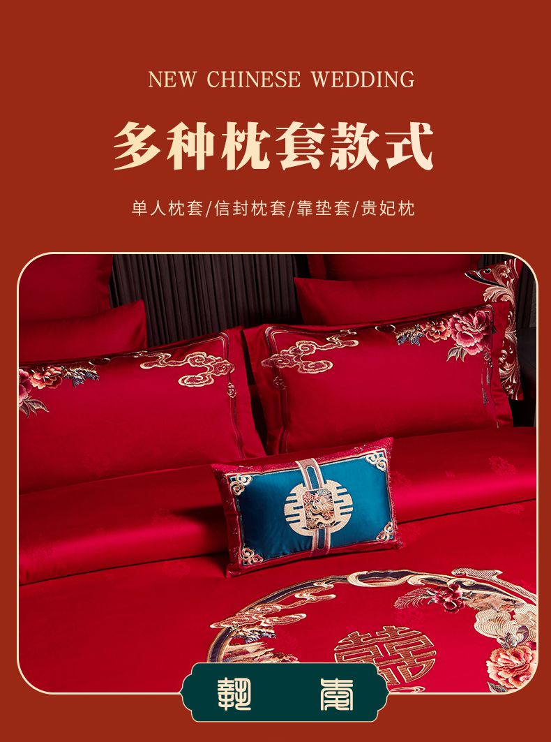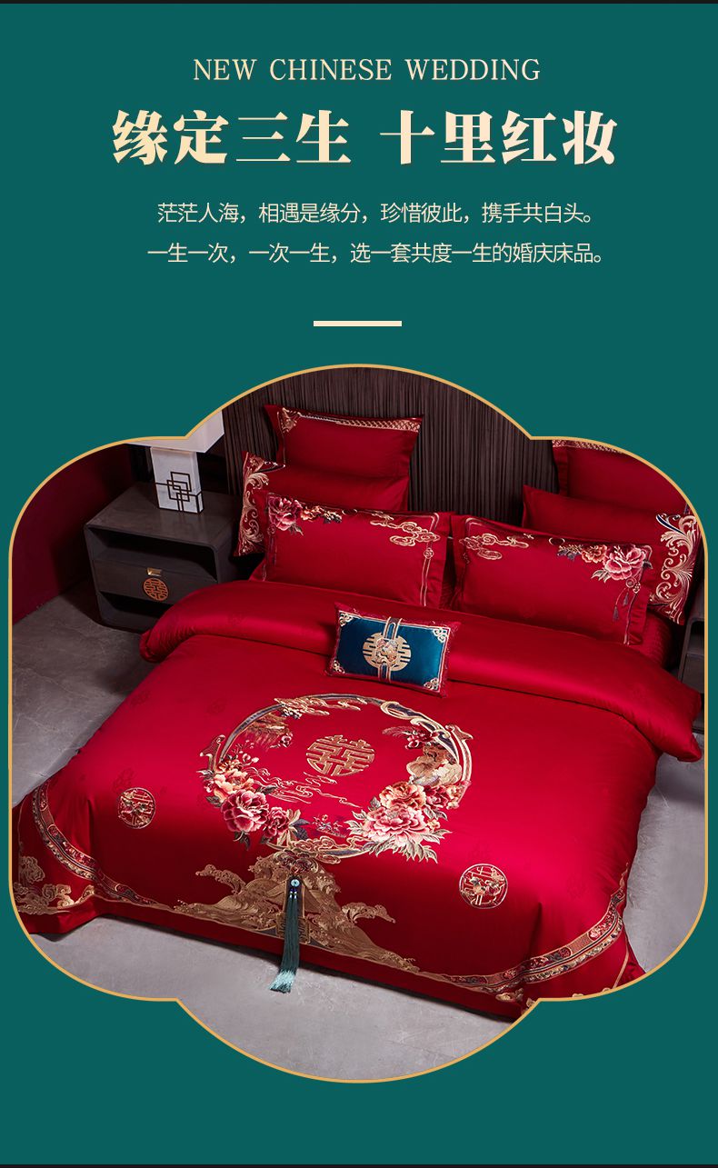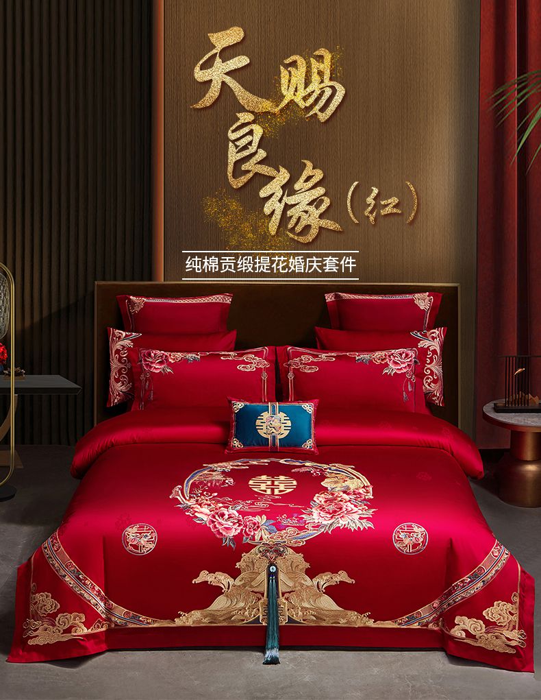 当前位置: 91家纺网 > 商品网购 > 床品套件 > 四件套 > 婚庆四件套 > 宏羽纺家纺 2024新款高支高密纯棉提花婚庆套件系列(控价680) 天赐良缘-红