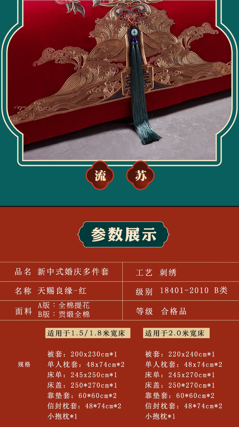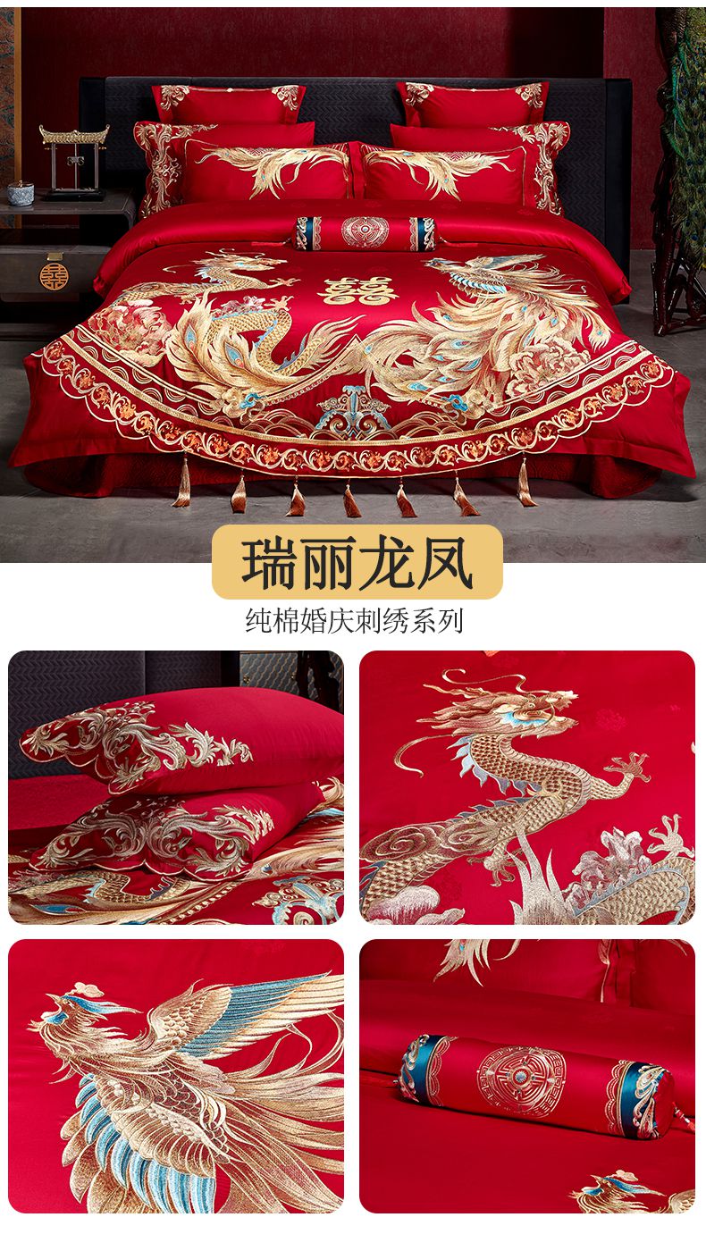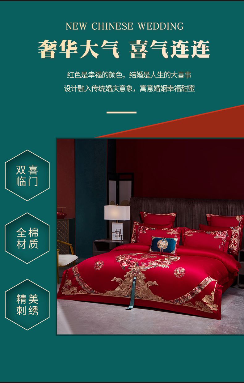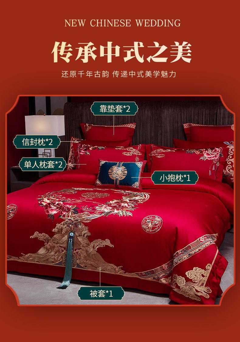 当前位置: 91家纺网 > 商品网购 > 床品套件 > 四件套 > 婚庆四件套 > 宏羽纺家纺 2024新款高支高密纯棉提花婚庆套件系列(控价680) 天赐良缘-红