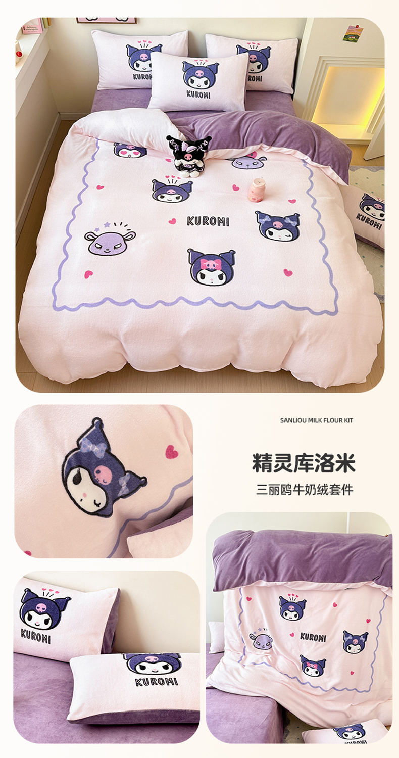 当前位置: 91家纺网 > 商品网购 > 床品套件 > 四件套 > 牛奶绒四件套 > 孩子王家纺 2024新款正版授权三丽鸥库洛米大版卡通学生宿舍双面加厚牛奶绒系列四件套--提供买家秀 精灵库洛米